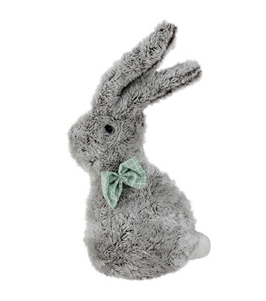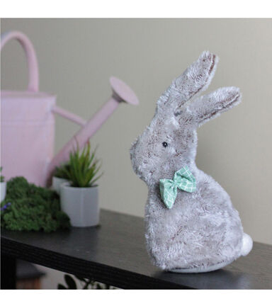 This adorable bunny would be a fun addition to your Easter or Spring decor!. Features: Bunny features a soft plush body with puff ball tail. He wears a green and white bow tie. Features a weighted bottom for stability. Recommended for indoor use only. Dimensions: 9"H x 4.5"W x 6"L. Material(s): fabric/faux fur/wire.