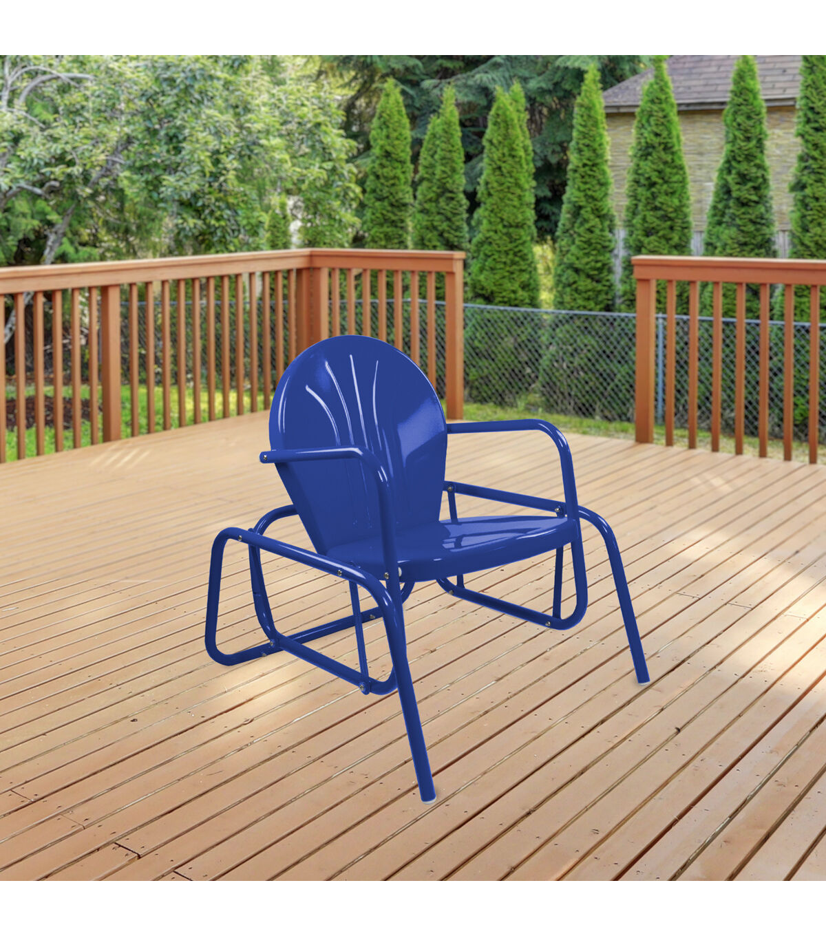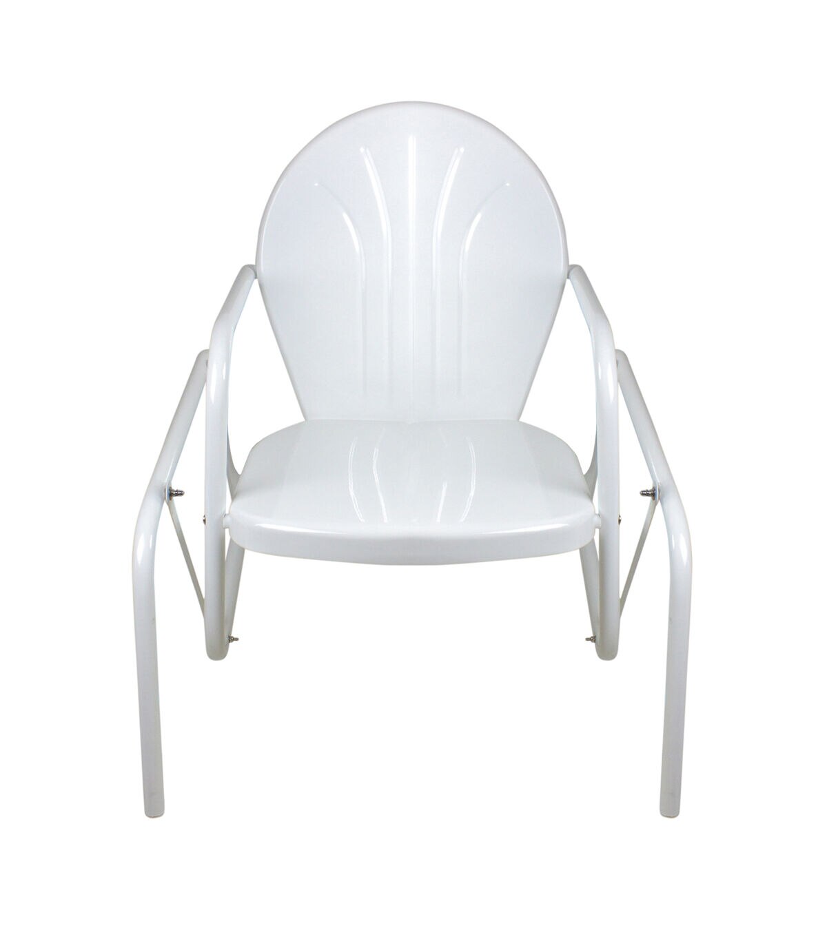 Bring a touch of the '50s to your yard or porch with our vintage-style metal lawn chair. With its weather-resistant powder-coated finish you will have years to enjoy this classic piece. Perfect for enjoying a glass of wine on the patio with family and friends or a good book by yourself. Pairs beautifully with our matching vintage style metal tulip tables. Features: Outdoor retro metal tulip glider Color: lime green Long-lasting enamel paint Powder coated finish Plastic caps on legs to protect your surfaces 5-piece easy assembly For indoor or outdoor use Weight capacity: 250lbs Dimensions: Overall: 32"H x 28.5"W x 34"D Seat: 16"H x 19.75"W x 19"D Back: 20"H x 19.5"W Arm rest: 23.75"H Material(s): steel