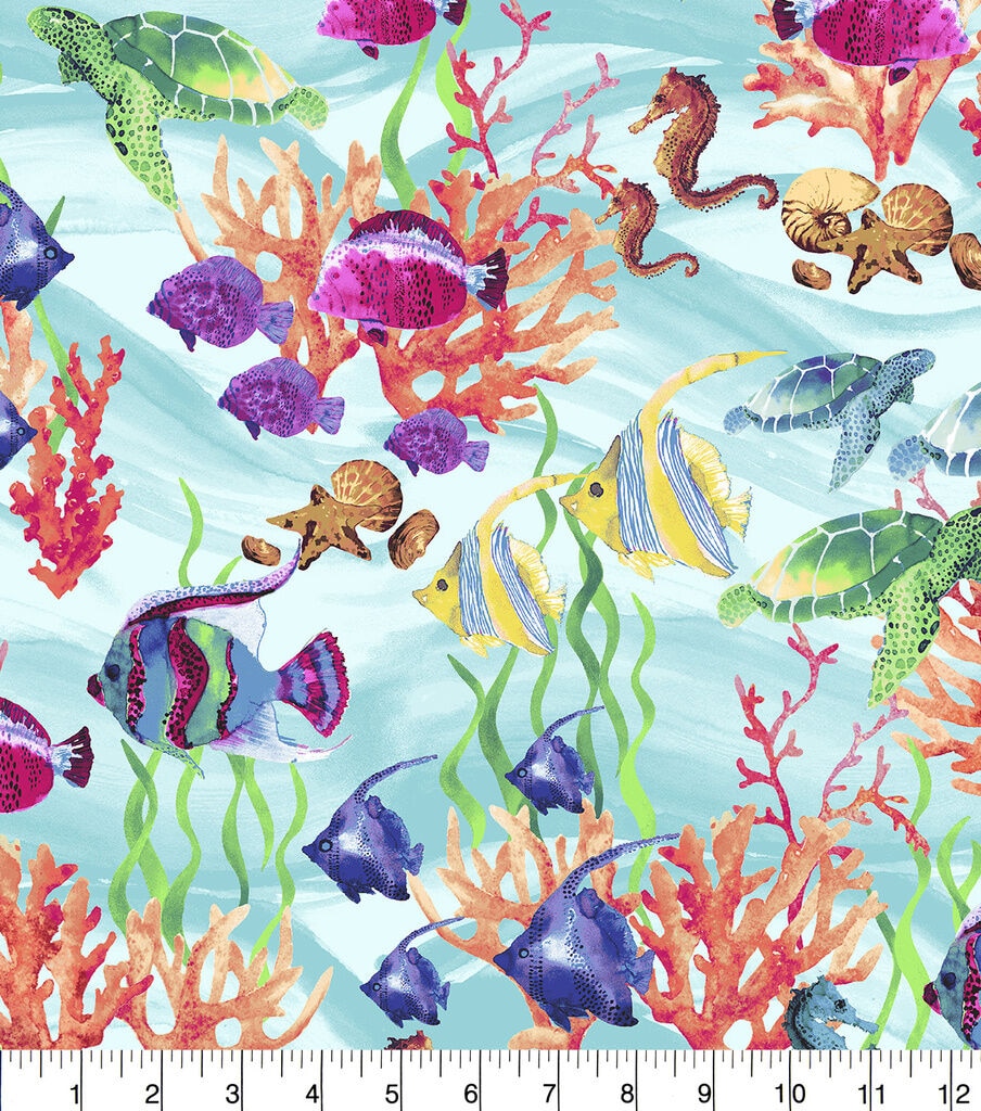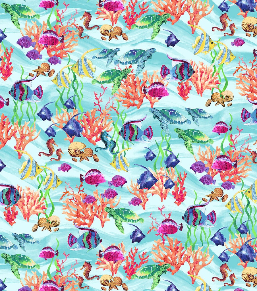 Novelty Cotton Fabric Ocean Fishes Aqua