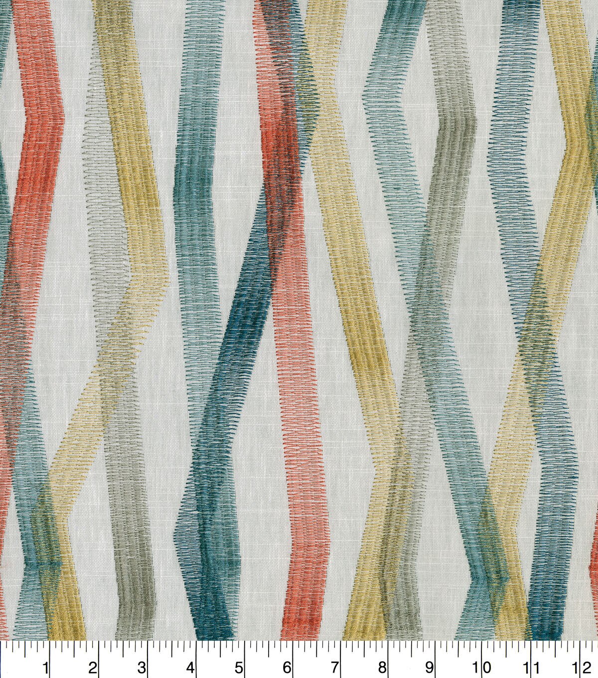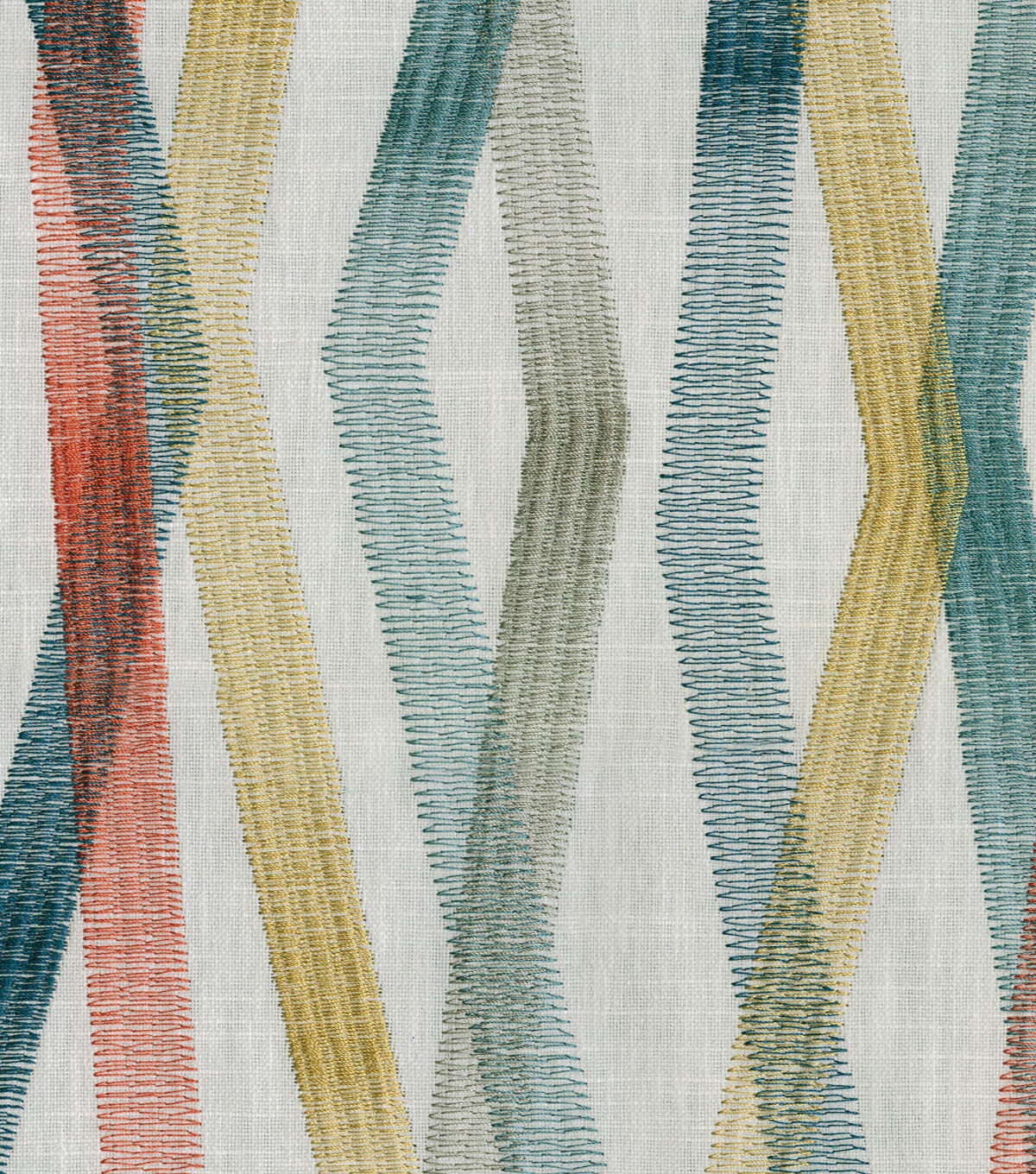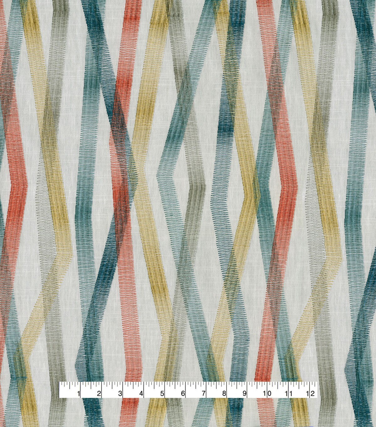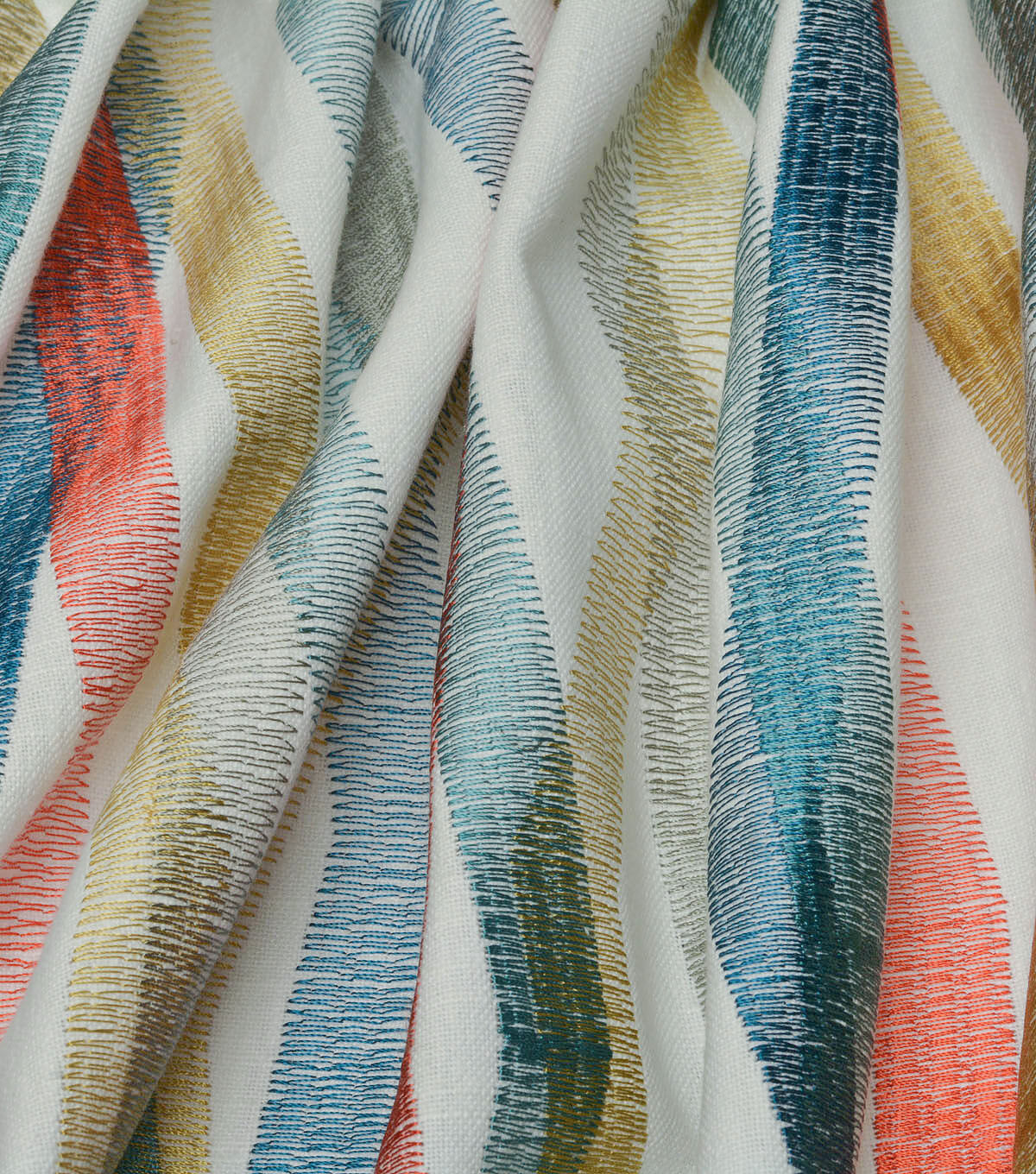 A modern geometric, Zig & Zag ports colorful linear bands that playfully intersect with one another. Each band is comprised of an embroidery stitched in a prominent zig zag pattern, creating a distinguishing ombre effect.