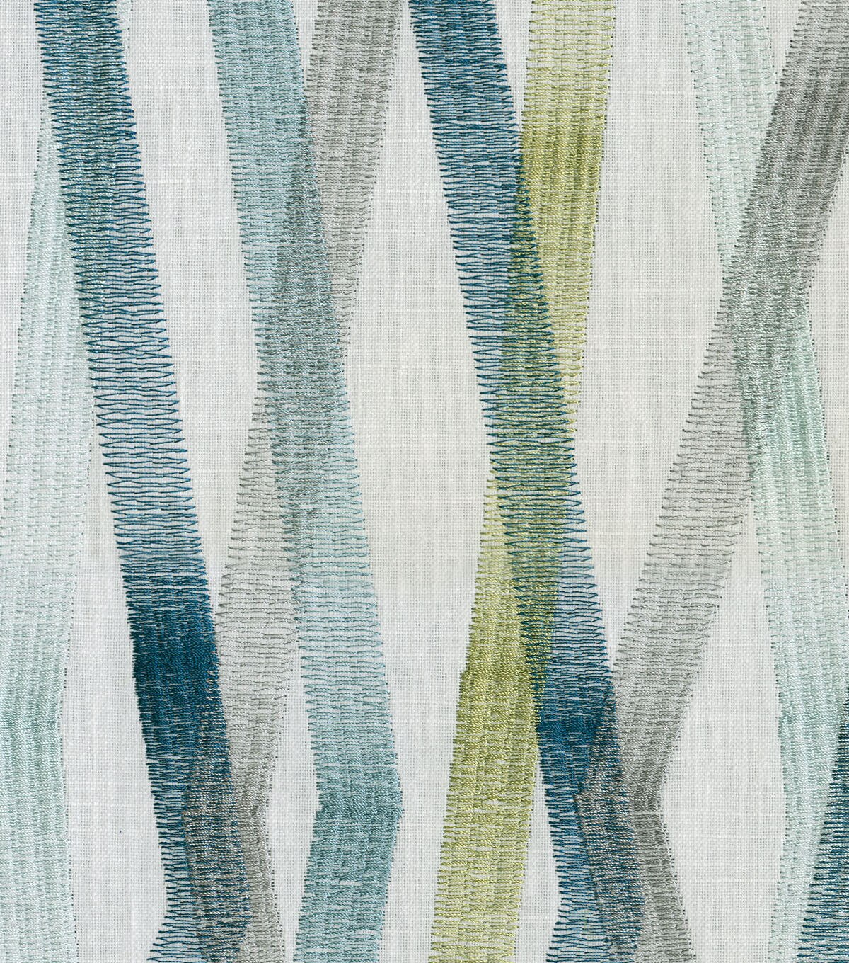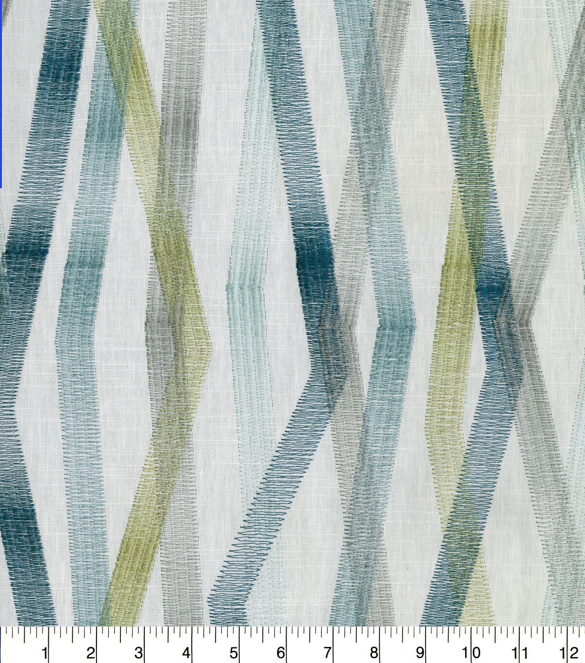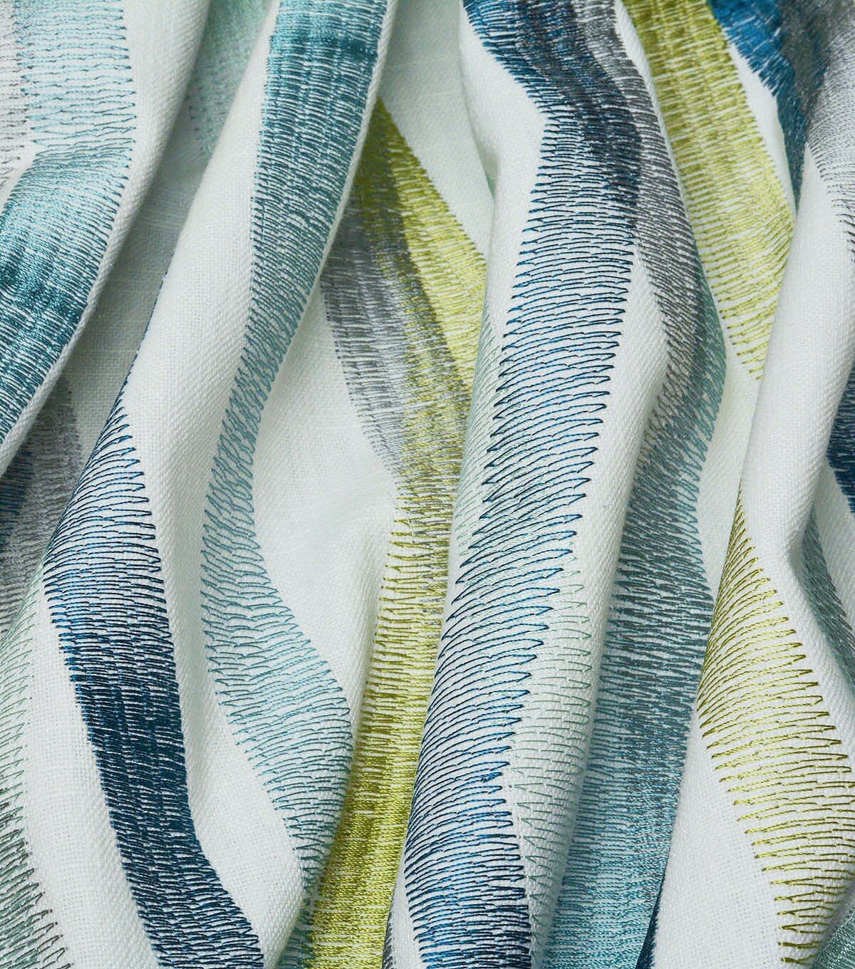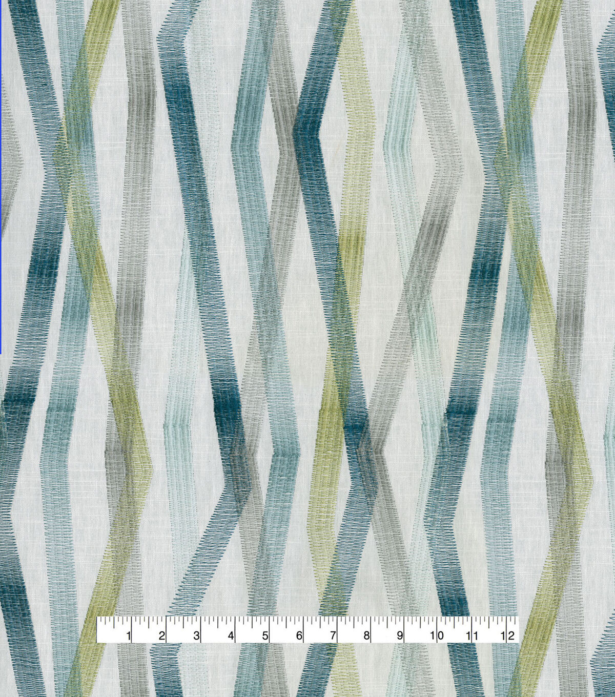 A modern geometric, Zig & Zag ports colorful linear bands that playfully intersect with one another. Each band is comprised of an embroidery stitched in a prominent zig zag pattern, creating a distinguishing ombre effect.