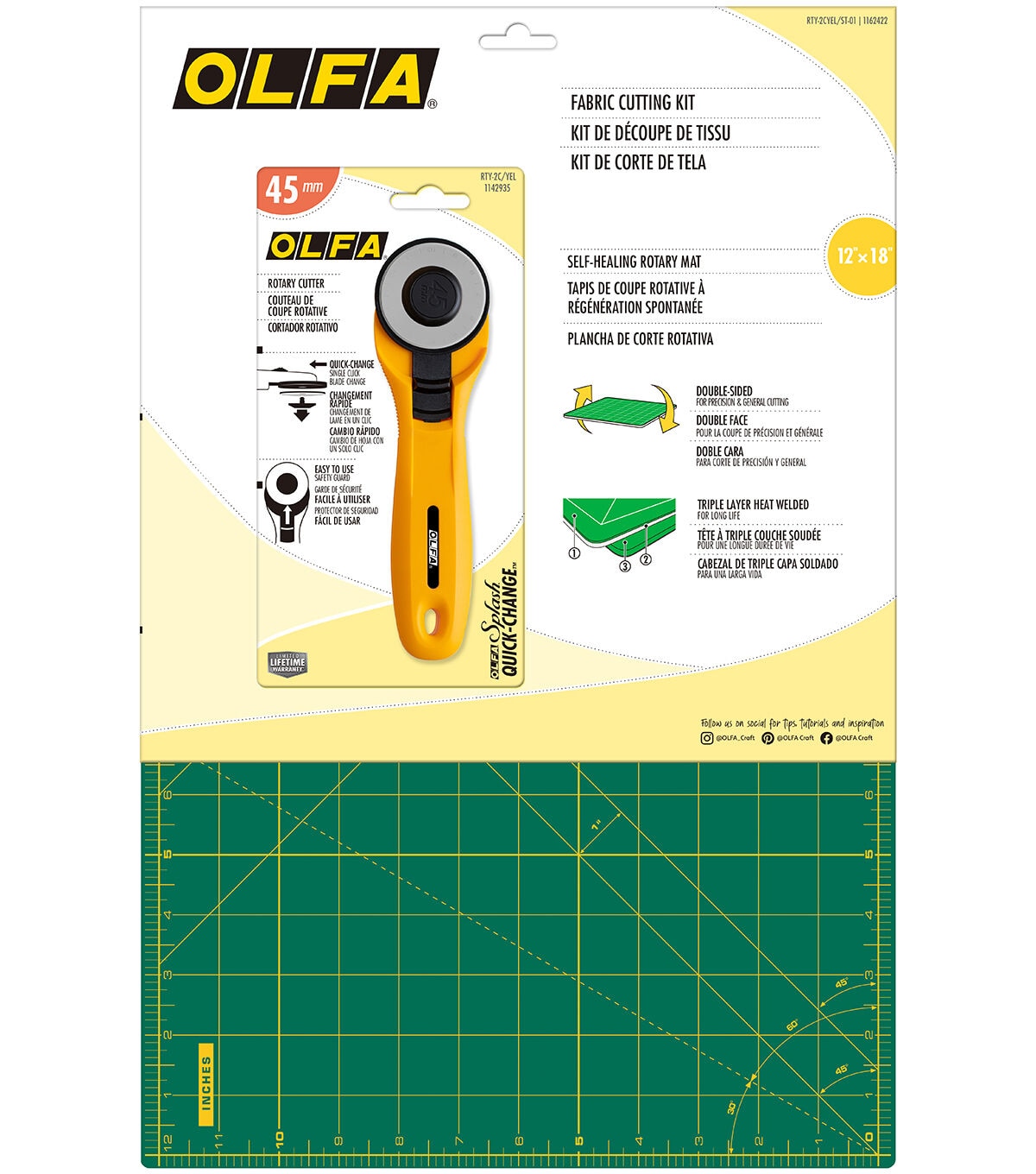 The OLFA Fabric Cutting Kit has all the perfect pieces for a starting crafter, or an seasoned crafter to refresh their tools. The kit includes: OLFA 12"x18" Double-Sided, Self-Healing Rotary Mat, Green OLFA 45mm Quick-Change Rotary Cutter, Yellow