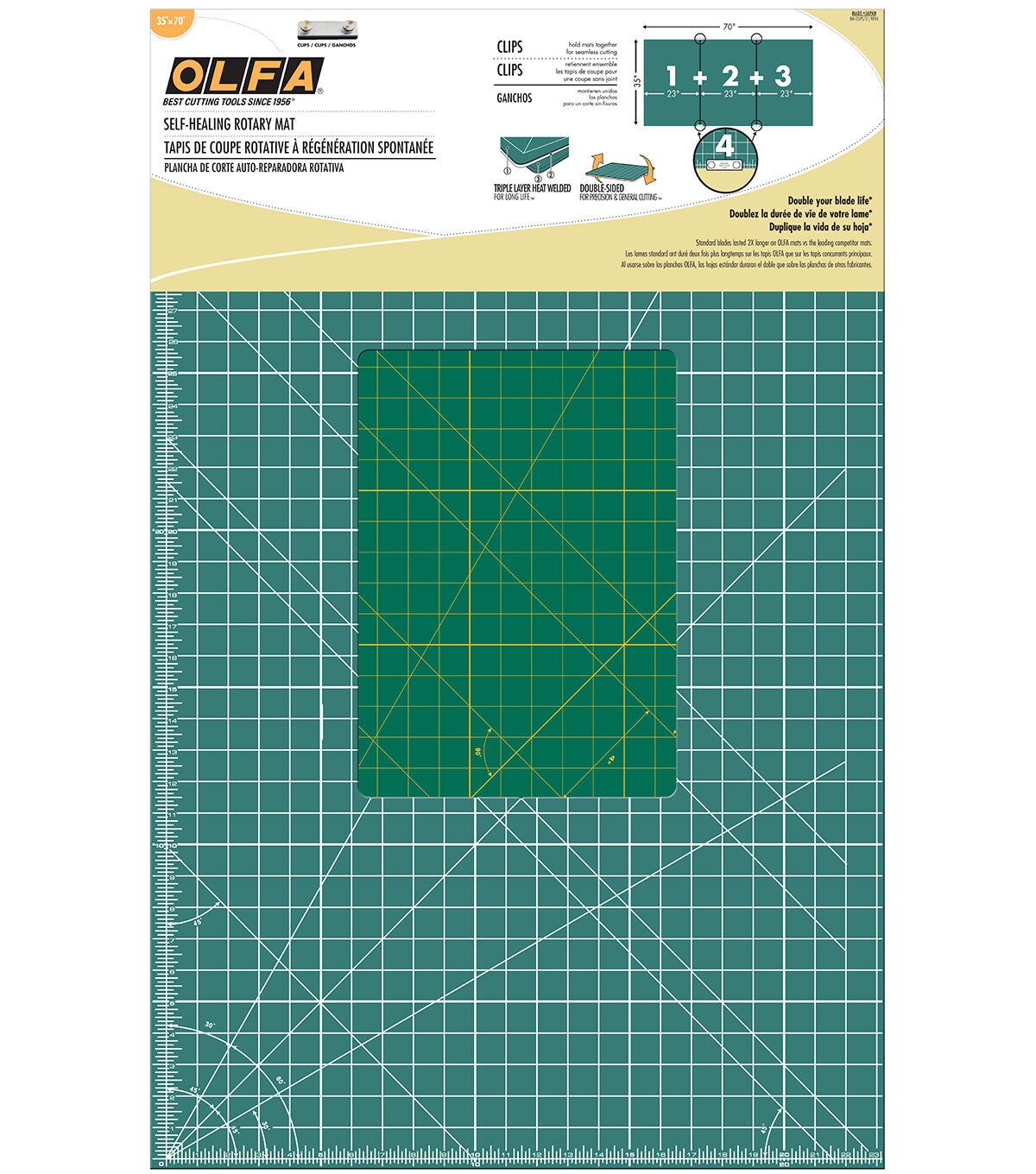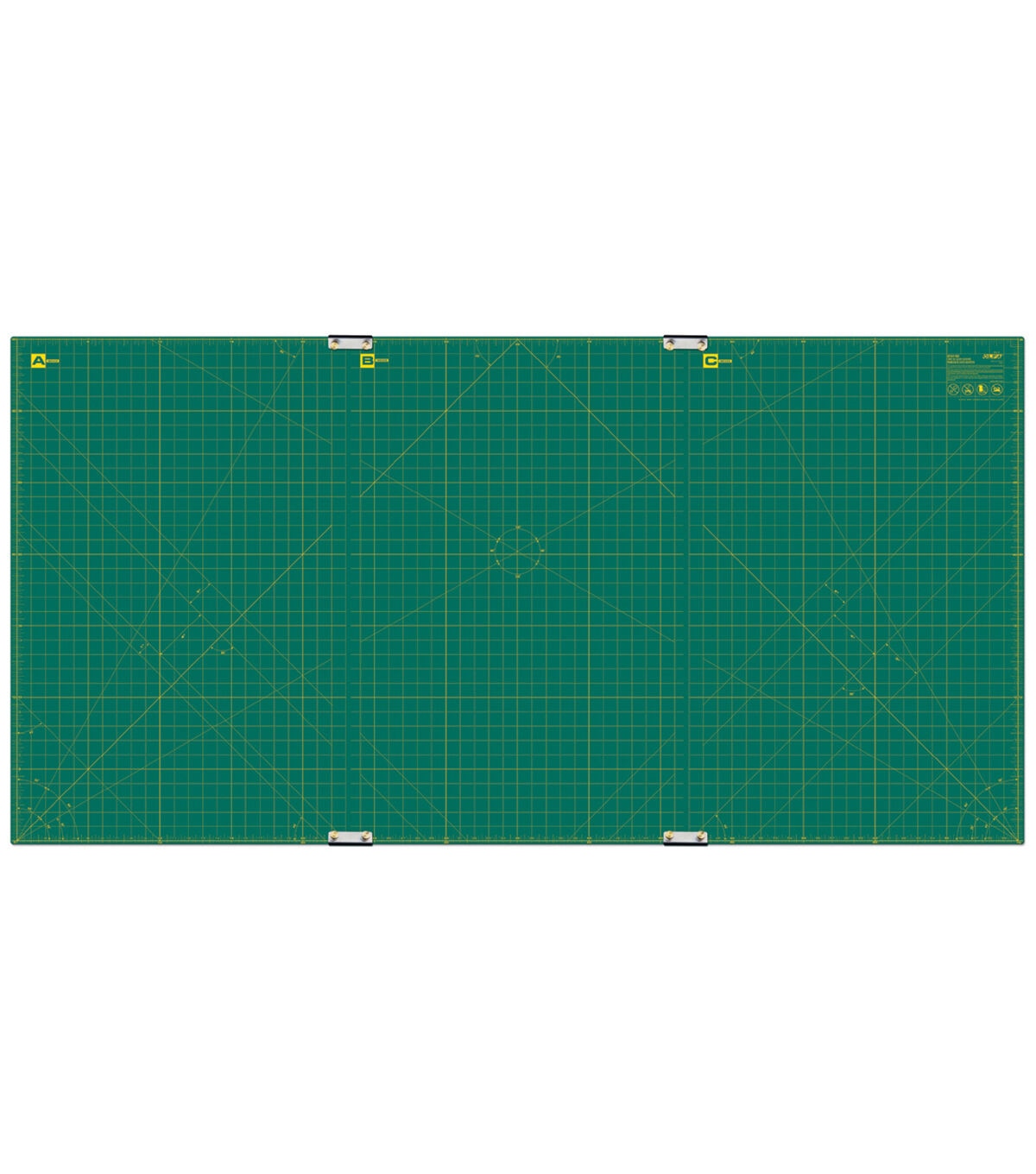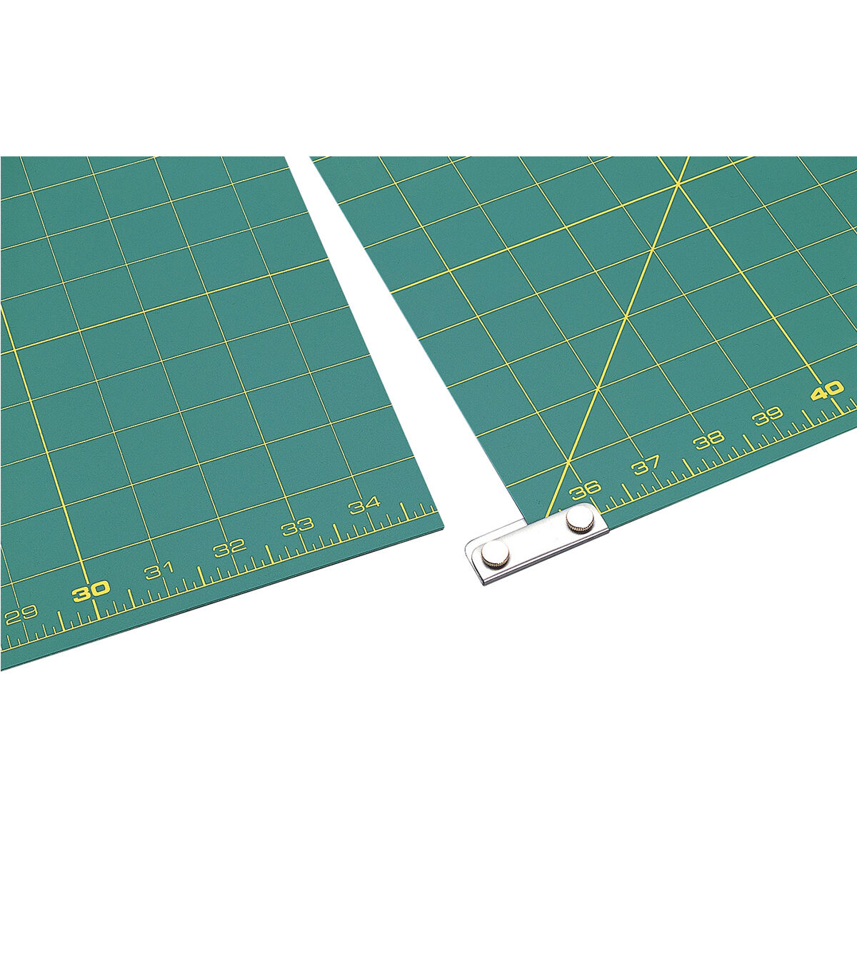 Create large size sewing or quilting projects easily using the Olfa Gridded Cutting Mat Set With Clips. This superior quality cutting mat is made of a self-healing material and is resilient to permeating rotary cutters. It features convenient grid lines, hash marks and bias diagonals for precision cutting or piercing. It also comes with three mats and four clips to enlarge the mat in continued order.