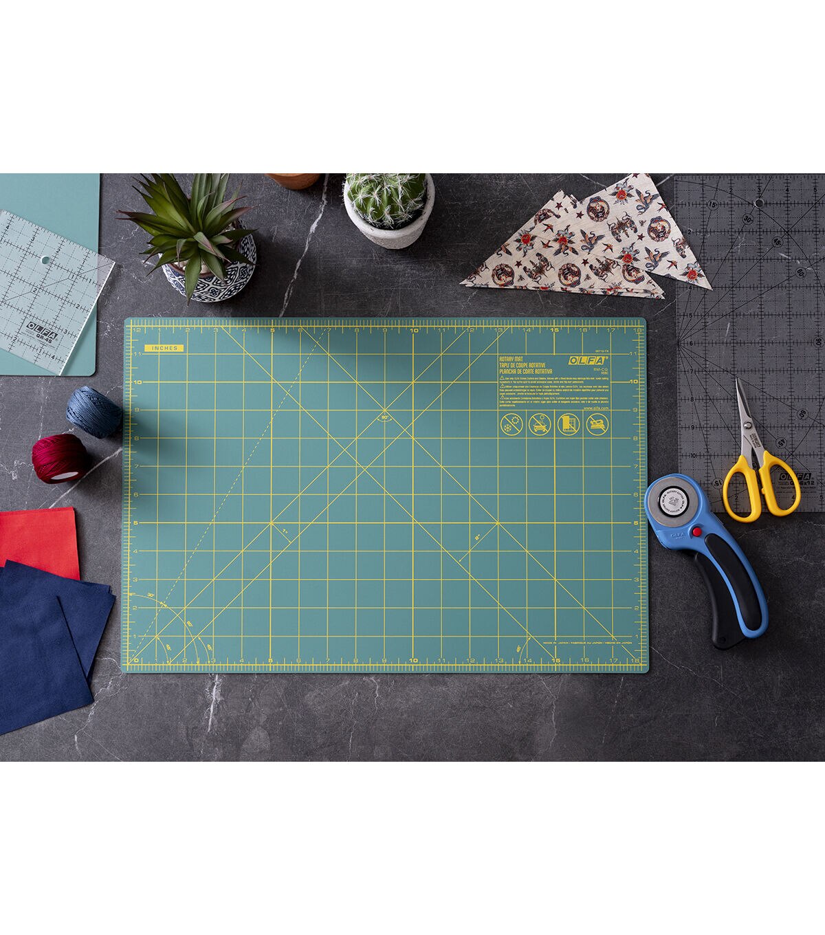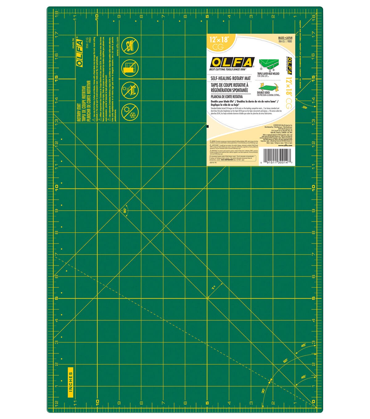 The Olfa Gridded Cutting Mat is a perfect choice to get the right cuts for your paper craft projects. This mat comes with colored grid lines to give precise measurements on one side and a solid colored surface on the other for general cutting. Designed to withstand cuts, nicks and grooves because of Olfa rotary cutting blades, this mat is self-healing and durable. Store these cutting mats with care without exposing it to extreme hot or cold temperatures.