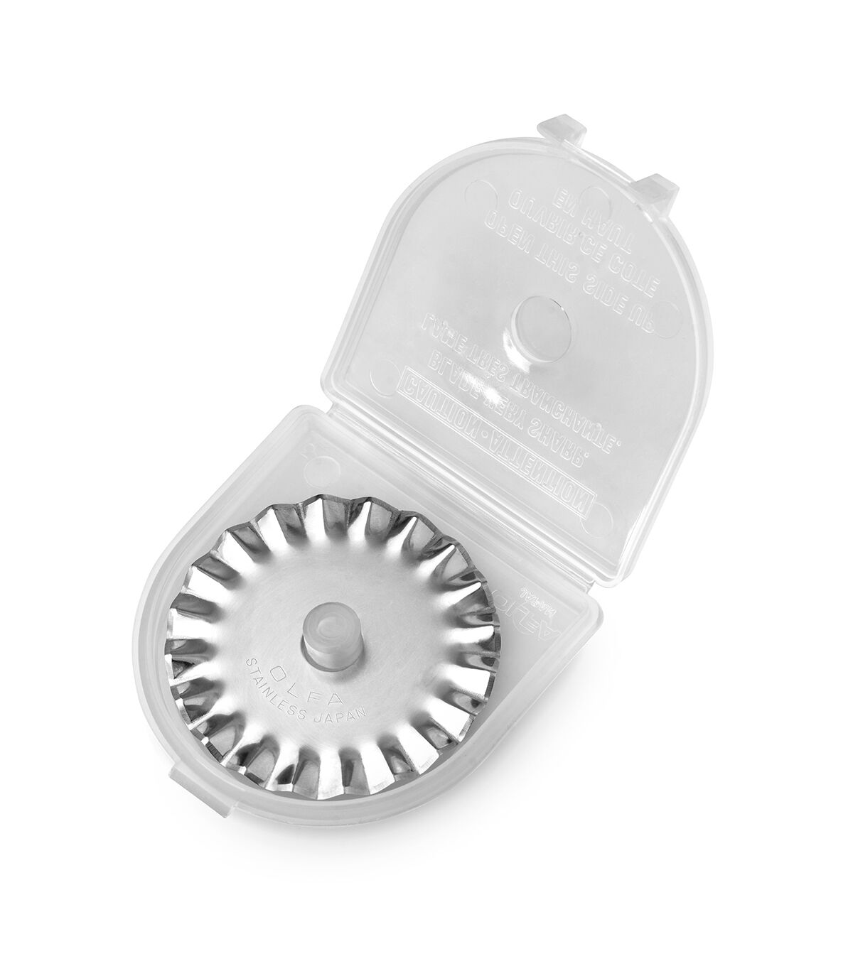 Work on a variety of projects including sewing, quilting, fabric and crafts using the Olfa Rotary Pinking Blade in place of the regular pinking scissors. Use this stainless steel blade with the Olfa Deluxe Rotary Cutter for precision cutting. This pinking blade comes in a plastic carry case for convenient storage and portability. Not intended for use with the standard Olfa Rotary Cutter.