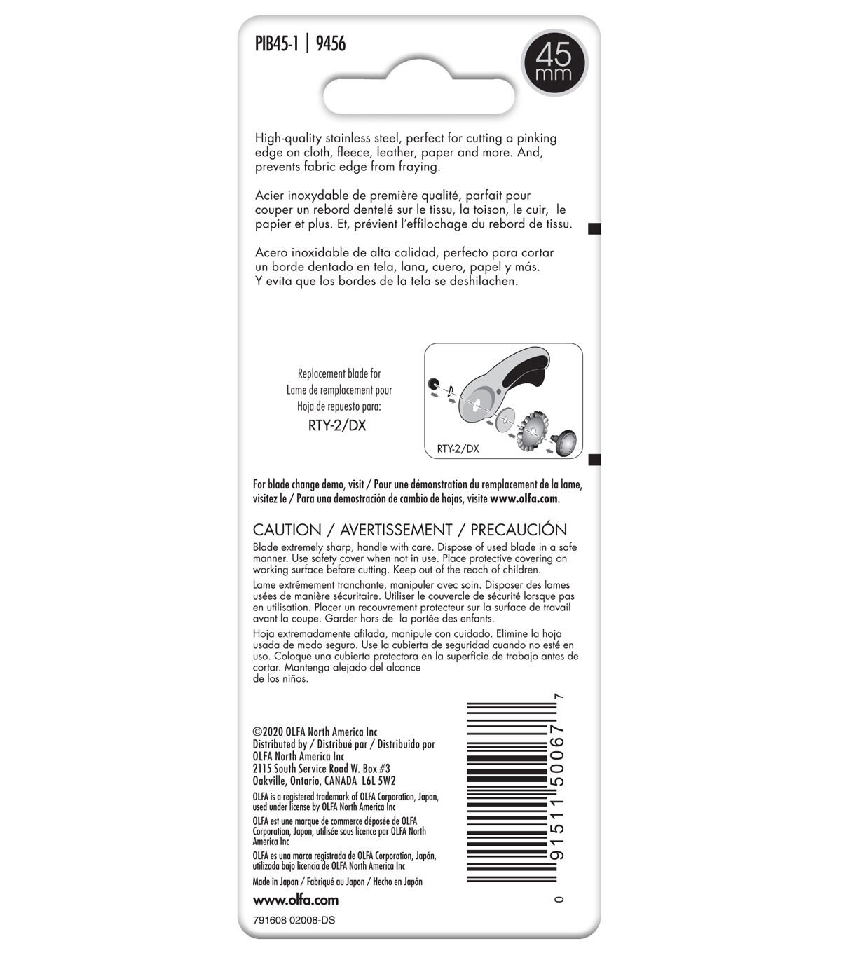 - Includes one pinking blade for OLFA RTY2DX 45MM ergonomic rotary cutter packaged in a container