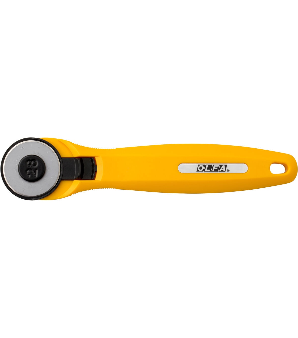 OLFA-Standard Rotary Cutter 28mm. 28mm quick blade change cutter with contoured design. Accommodates both right- and left-handed users. Great for small scale projects, miniatures and tight corners. Fits 28mm replacement blades. Imported.