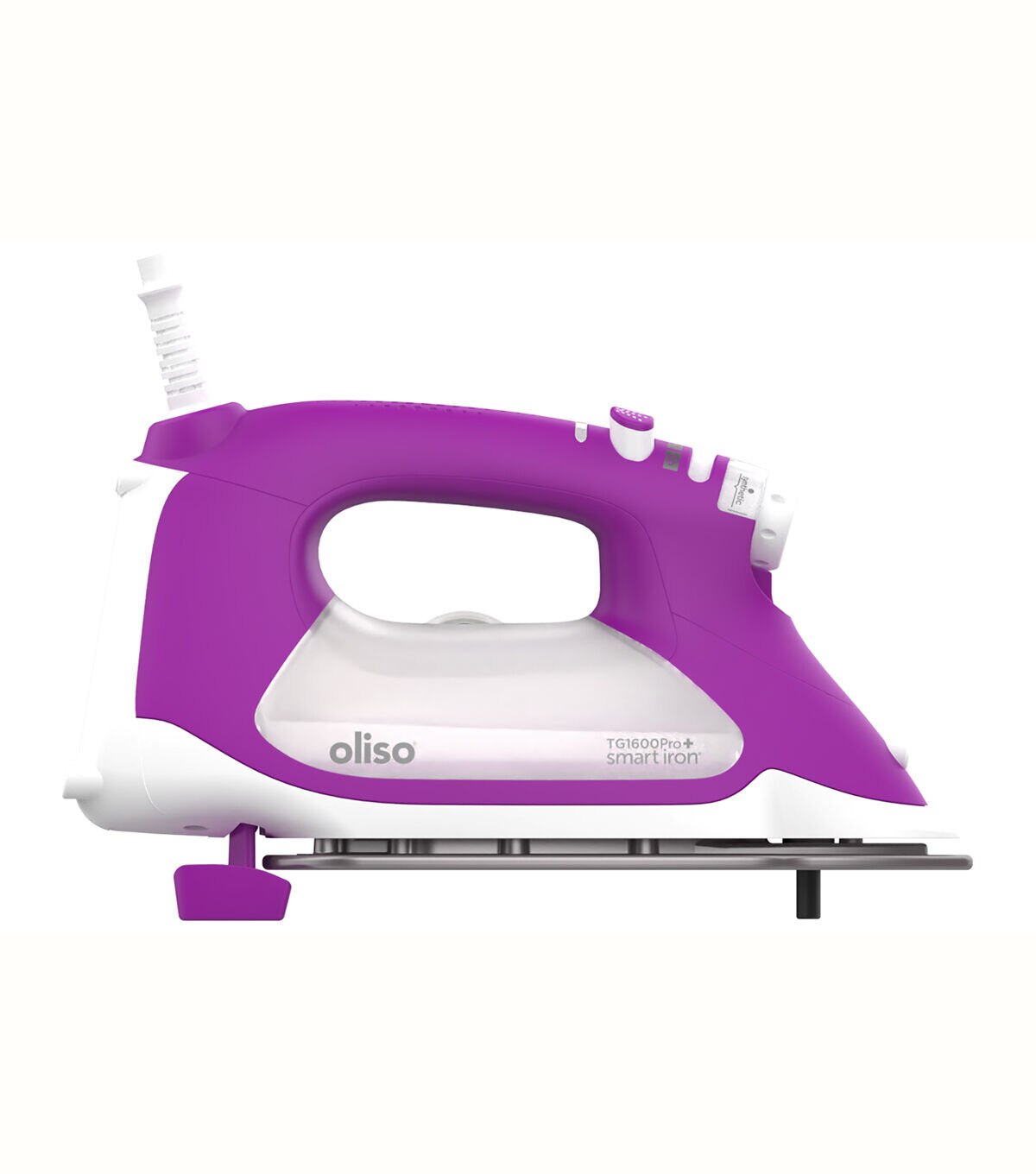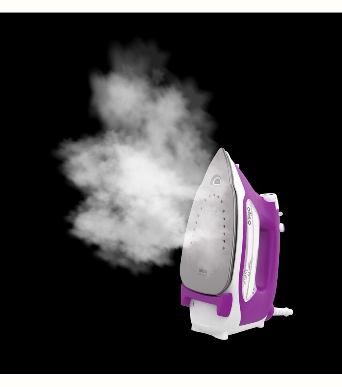 - NEW Diamond ceramic-flow soleplate with pro-press core: superior heat, durability, and non-stick, easy-clean even in the stickiest of situations.Smart sensor extended auto shut-off: Extended 30 min standby while working for your convenience, 30 second safety auto shut-off if tipped over.2-inch Detailer Tip: Perfect for seams, bias tape + tight corners. Press under and over pleats, pockets, cuffs and collars with ease.Longest cord in class: 12' with a 360 degree pivotLargest water tank in class: (12.7 oz/375ml) for heavy steam usage with easy side fill and fill cup included.Built-in spray: Stubborn wrinkles? No problem. My built-in spray is a powerful wrinkle buster.Take me away: I'm compatible with Oliso accessories for storage and travel.3 year warranty: You're part of the family with Oliso's friendly customer service.Enhanced quality features: Anti-drip system - Prevents spitting and leaking while the iron is hotNEW Anti-Calc Technology: The new anti-calc cartridge prevents hard water buildup and keeps your iron working longer and stronger.Auto-Clean SystemPowerful pressing: Quick Heating - 1800 watts of powerNEW Rapid-response Triple play steam: powerful vertical and horizontal steam removes the toughest wrinkles.