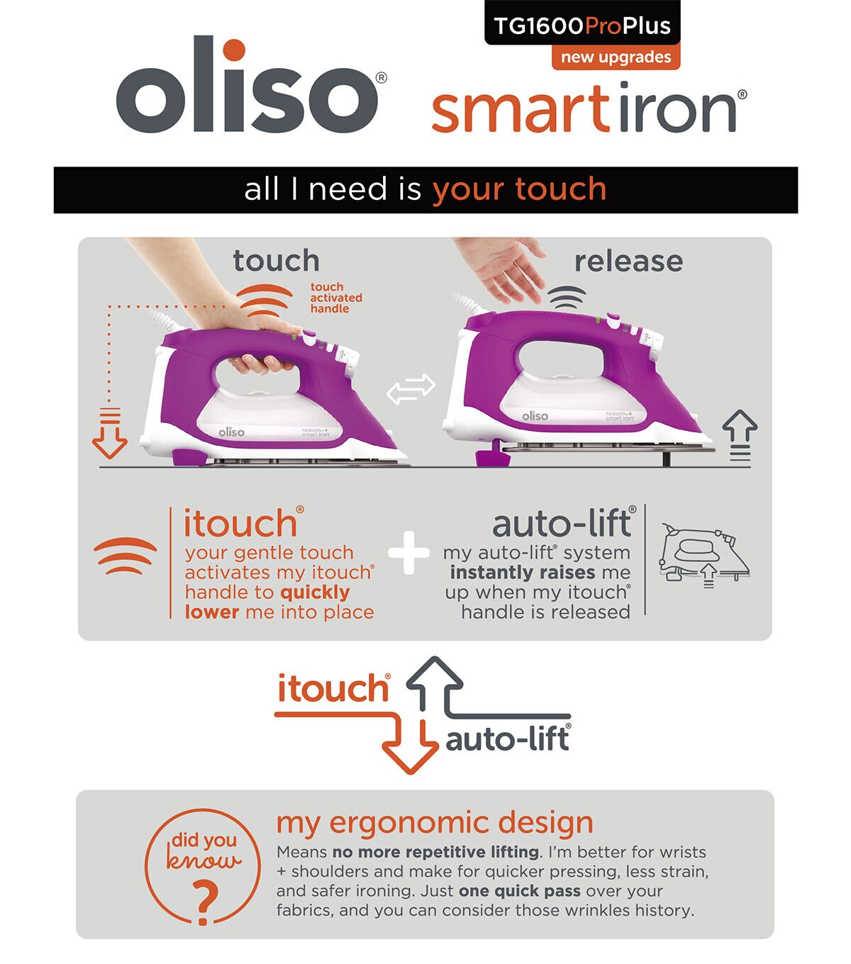 Oliso's iconic SmartIron just got smarter! The new TG1600 ProPlus still features Oliso's most-loved patented iTouch technology. Simply touch the handle and the iron lowers, ready to work. Take your hand off and the patented scorch guards lift the iron off the board preventing scorches, burns, and tipping. It's not only safer, but it also saves time as well as your wrists! Other classic features include 1800 watts of power and horizontal or vertical bursts of steam. The TG1600 ProPlus features a 30-minute extended auto-shut off for sewers and quilters, a 12.7 oz side fill tank, flat pressing surface, detailer tip, and a 12-foot cord for full range of motion. The new TG1600 ProPlus ups its IQ with a new diamond ceramic-flow soleplate glides effortlessly over all fabrics types, further enhances its even heat distribution and provides quick and easy clean up when using fusibles. Rapid response triple play steam system makes the TG1600 ProPlus steamier and hotter than ever! A new anti-scale system keeps the TG1600 ProPlus working stronger and longer. And since customers asked: Oliso delivered even more ergonomic weight distribution and an enhanced auto-lift responsiveness system to complete the update!