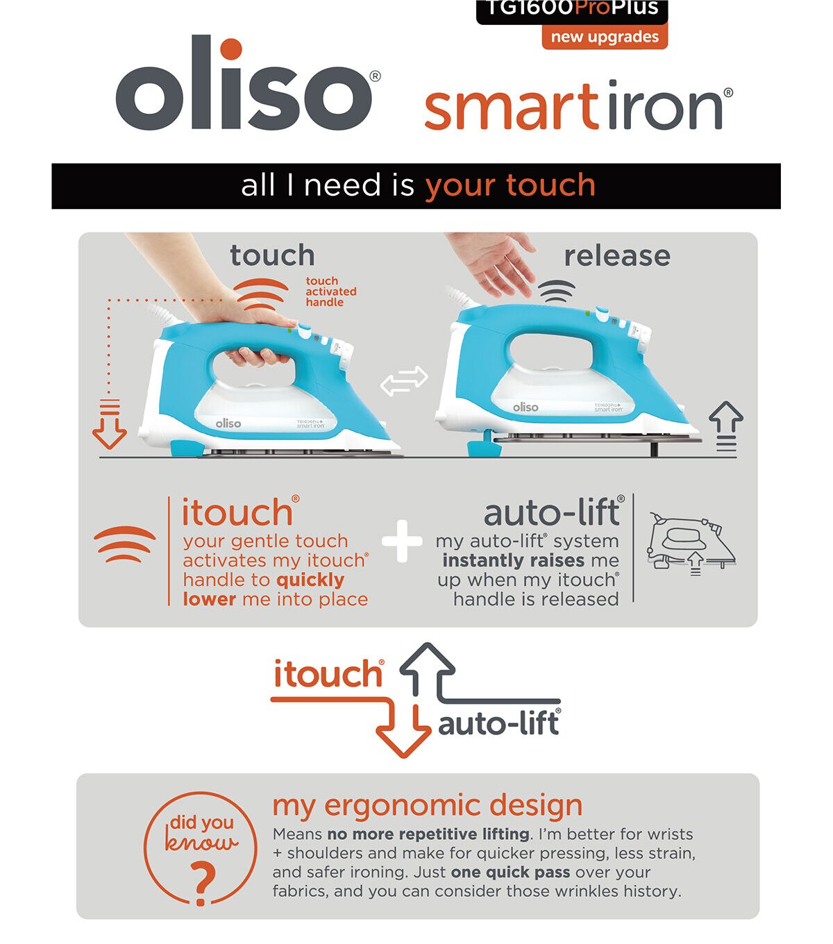 Oliso's iconic SmartIron just got smarter! The new TG1600 ProPlus still features Oliso's most-loved patented iTouch technology. Simply touch the handle and the iron lowers, ready to work. Take your hand off and the patented scorch guards lift the iron off the board preventing scorches, burns, and tipping. It's not only safer, but it also saves time as well as your wrists! Other classic features include 1800 watts of power and horizontal or vertical bursts of steam. The TG1600 ProPlus features a 30-minute extended auto-shut off for sewers and quilters, a 12.7 oz side fill tank, flat pressing surface, detailer tip, and a 12-foot cord for full range of motion. The new TG1600 ProPlus ups its IQ with a new diamond ceramic-flow soleplate glides effortlessly over all fabrics types, further enhances its even heat distribution and provides quick and easy clean up when using fusibles. Rapid response triple play steam system makes the TG1600 ProPlus steamier and hotter than ever! A new anti-scale system keeps the TG1600 ProPlus working stronger and longer. And since customers asked: Oliso delivered even more ergonomic weight distribution and an Enhanced auto-lift responsiveness system to complete the update!