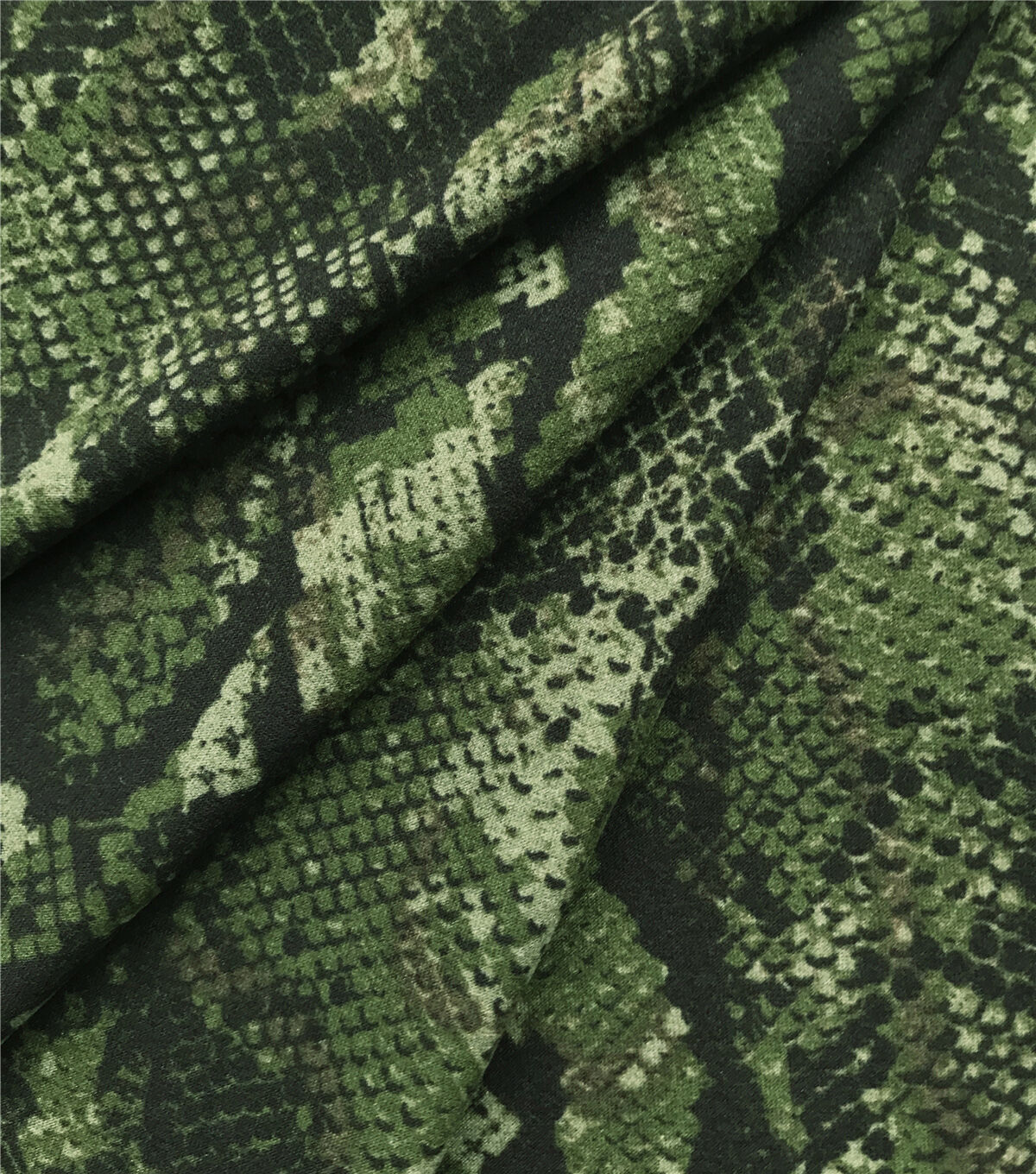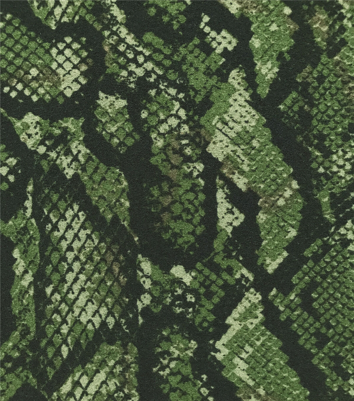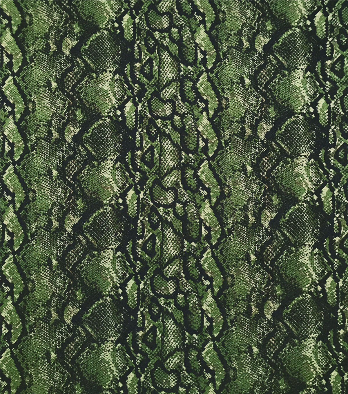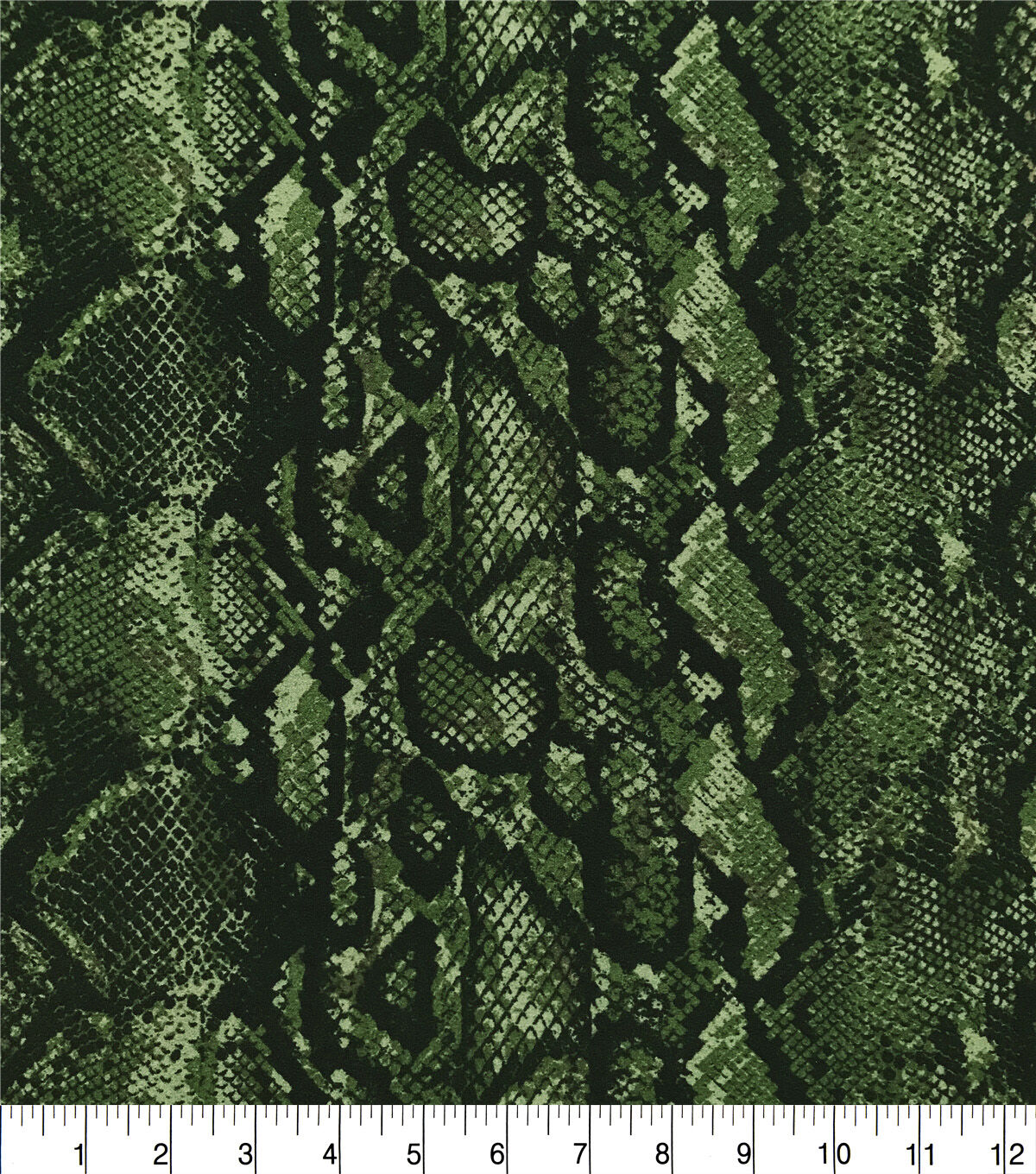 Be wild and free with this snakeskin knit fabric. The material is a total fit for comfort with its peach fuzz feel on the surface and stretchability from its spandex make. Your sewing creativity is bound to roam with this jungle print when making leggings and casual tops, and your confidence will too. Just wait til they see you.