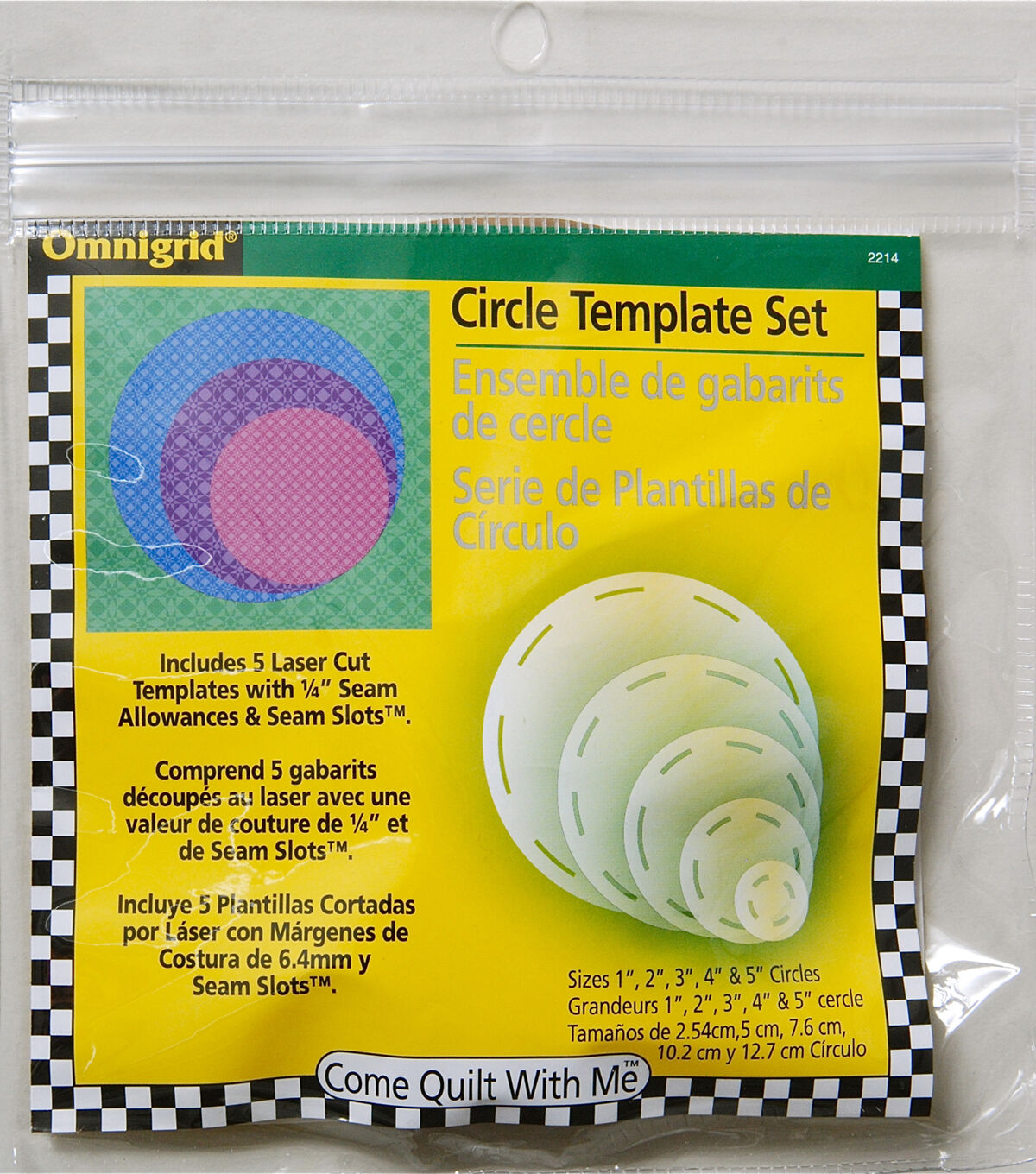 Trim and cut perfect circles out of your fabrics using the Omnigrid Come Quilt with Me Circle Template Set. These five heavy-gauge acrylic templates have been laser cut with 0.25-inch seam allowances and are designed with seam slots that help you in marking stitching lines. The pack includes five cutting circles in assorted sizes for various quilting projects. They are ideal for both machine and hand piecing and can be cut with a rotary cutter or scissors.