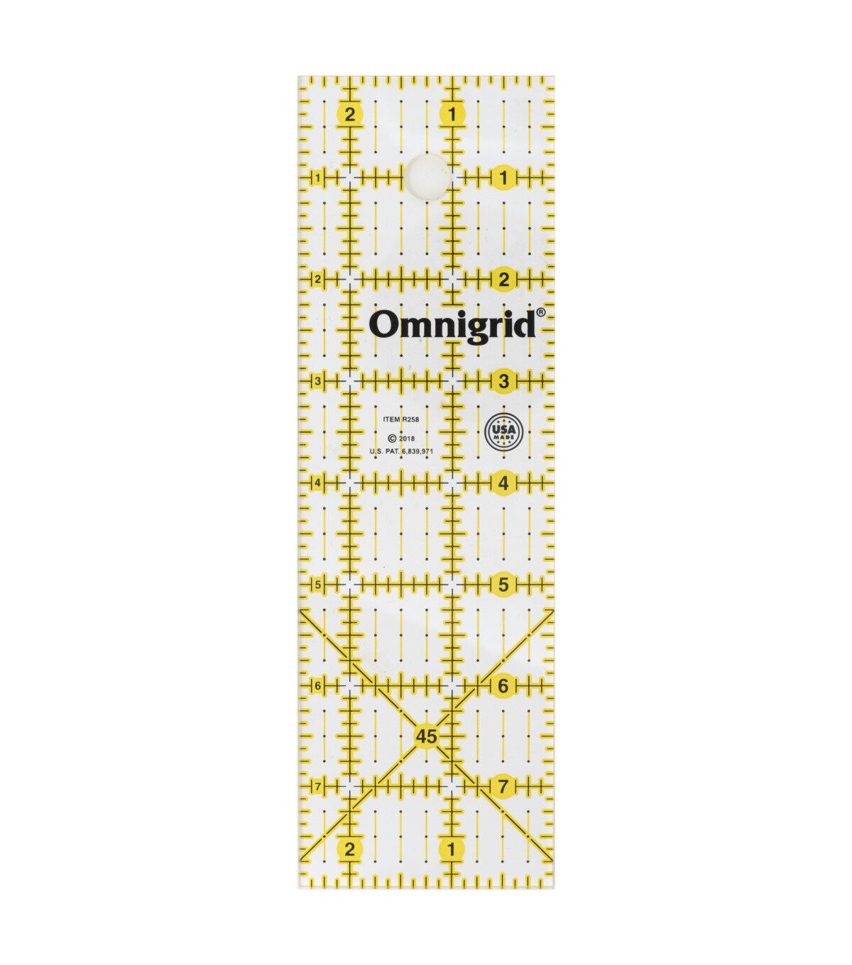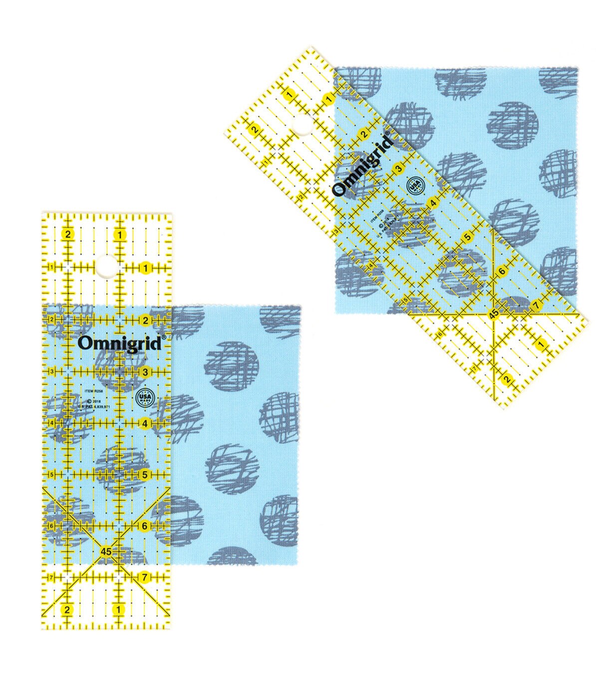 The Omnigrid Rectangle Quilting Ruler - Clear will be a valuable addition to your sewing supplies. This ruler measures 2.5 x 8 inches and comes in a convenient portable size for classes or keeping next to your sewing machine. It is designed with 45-degree angle markings for bias cut and cross-cutting strata strips. You can also use it as a guide with a rotary cutter for curve work.