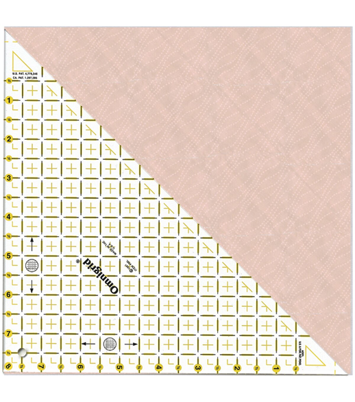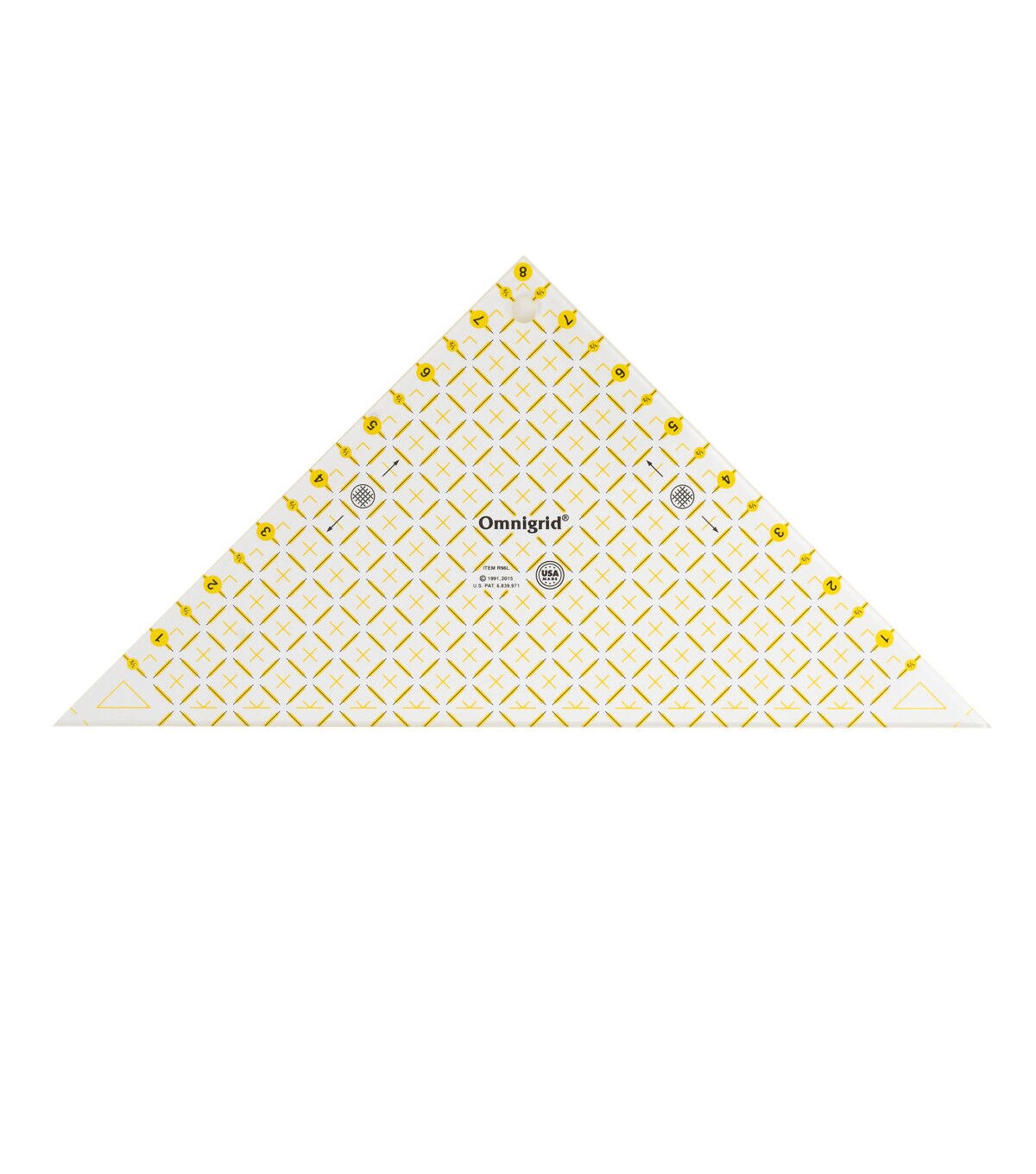The Omnigrid 8" half square triangle ruler is used to create half-square triangles for finished quilt blocks up to 8". It has seam allowance calculations included in the measurements; it is easy to manipulate for smaller triangles when quilting.