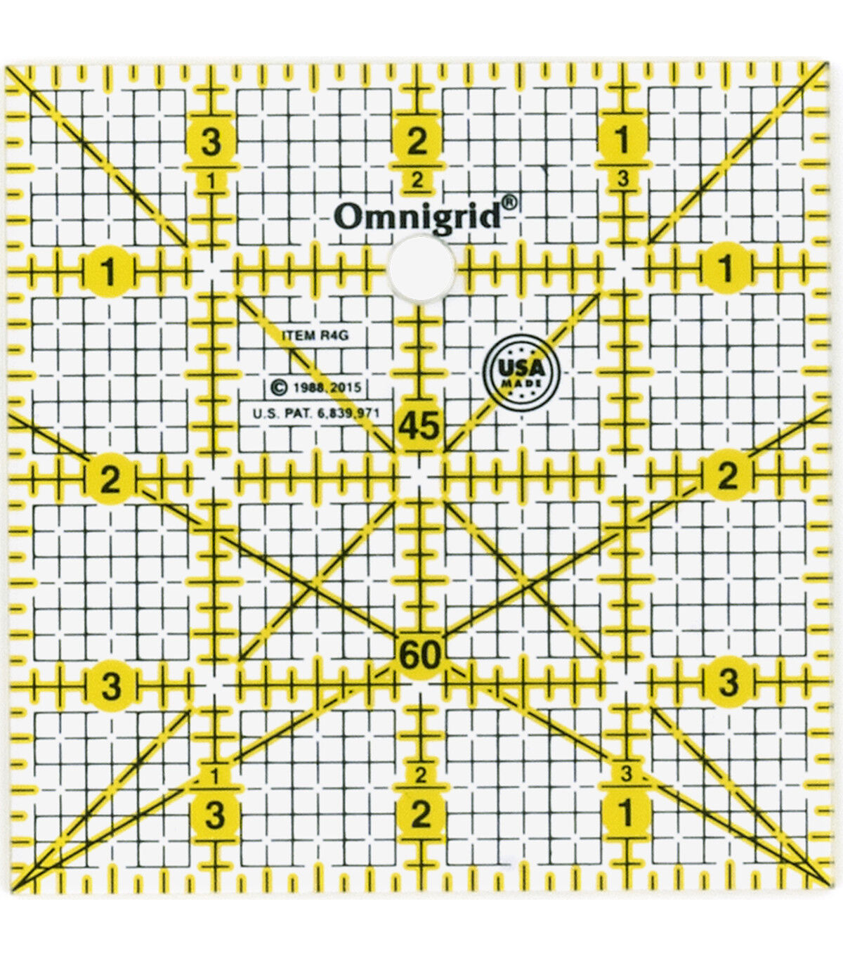 The Omnigrid Square Grid Quilting Ruler is a must-have for new and professional quilters alike. Providing outstanding accuracy, this quilting ruler is perfect for measuring, marking and detailed cutting. With its yellow and black marking, the ruler lets you spot the 0.12-inch gird irrespective of whether you are working on a light or dark fabric. This long-lasting acrylic plastic ruler is laser cut for 0.002-inch accuracy and also comes with 60-degree and 45-degree angles. Bias lines of the ruler are aligned to the bottom to let you use the ruler continuously without the need to flip or turn. Designed with a feasible numbering system, this 4 x 4-inch ruler is suitable for both left-handed and right-handed users.