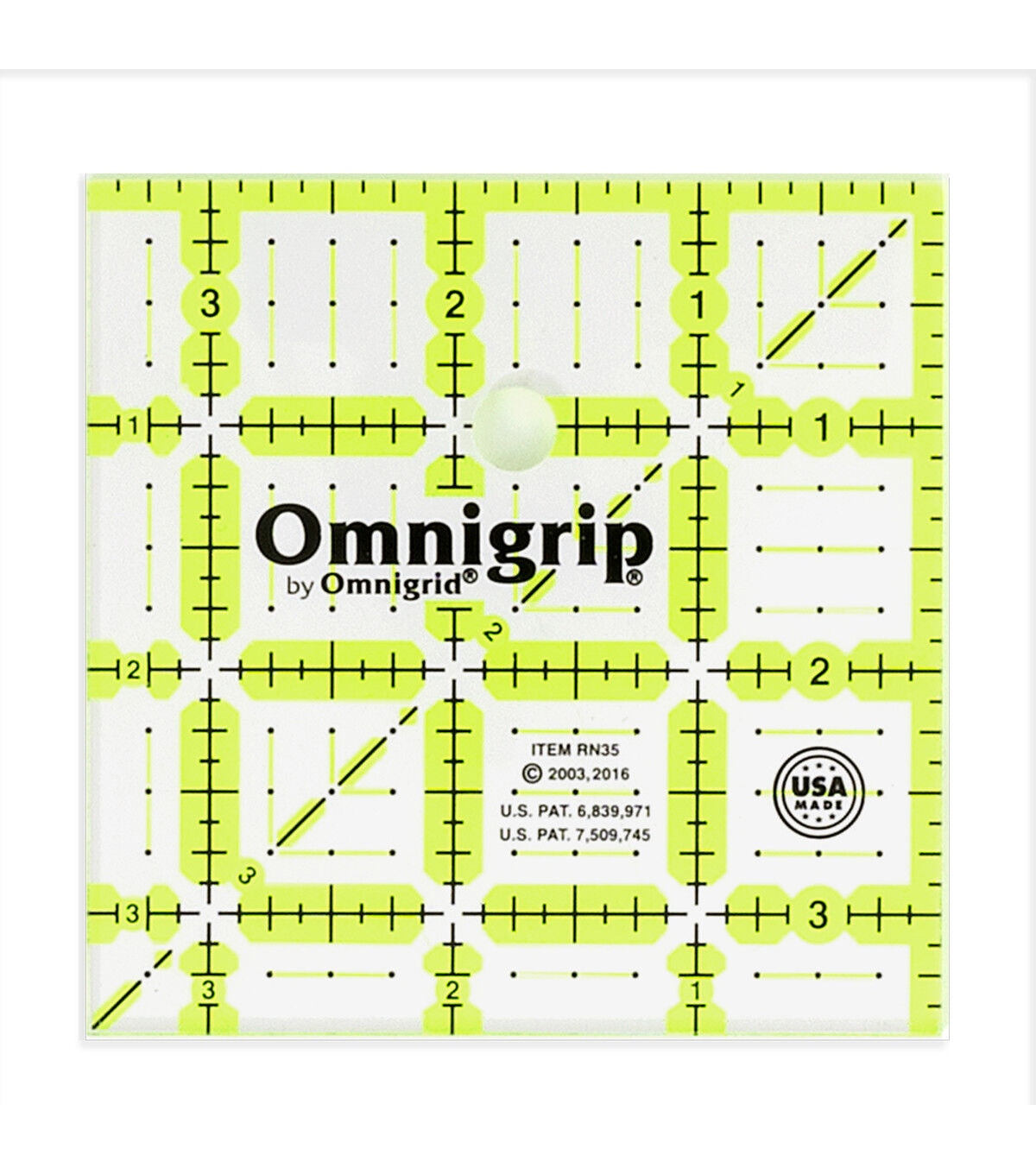 Handy and compact-sized, the Omnigrid Non-slip Square Quilting Ruler - Neon provides the same versatility and functionality as regular-sized ones. It is the ideal quilter's ruler for the secondary cutting of fabric strips into squares and shapes or for cutting fat quarters. A unique numbering and angle system set against a clear background and neon lines make this ruler easy to use. You can use the quilter's ruler with rotary cutters or straight-edge blades.