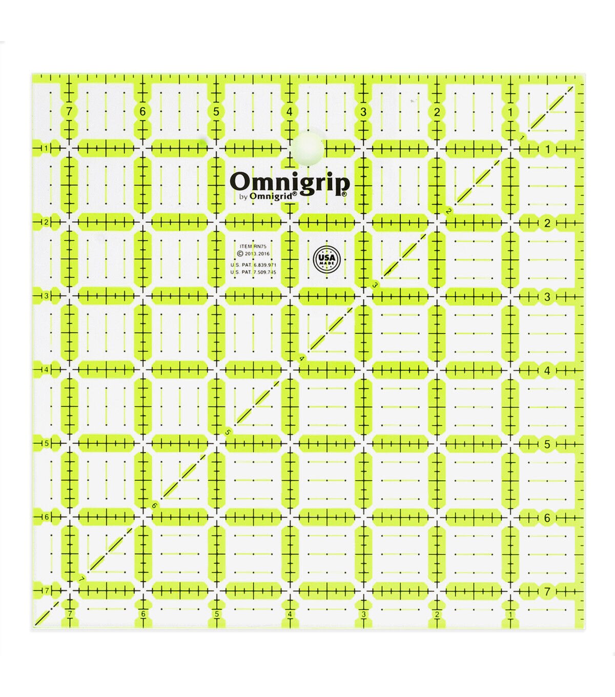 Use the Omnigrid Square Quilting Ruler - Neon for cutting fabric strips and squaring up quilt blocks for your quilting and sewing projects. This ruler is made of heavy-duty acrylic and laser cut to within 0.002-inch accuracy. It comes with uniquely patented double-site lines and right-hand and left-hand numbering and angle system. The ruler features an extra 0.5-inch on two sides for seam allowance.