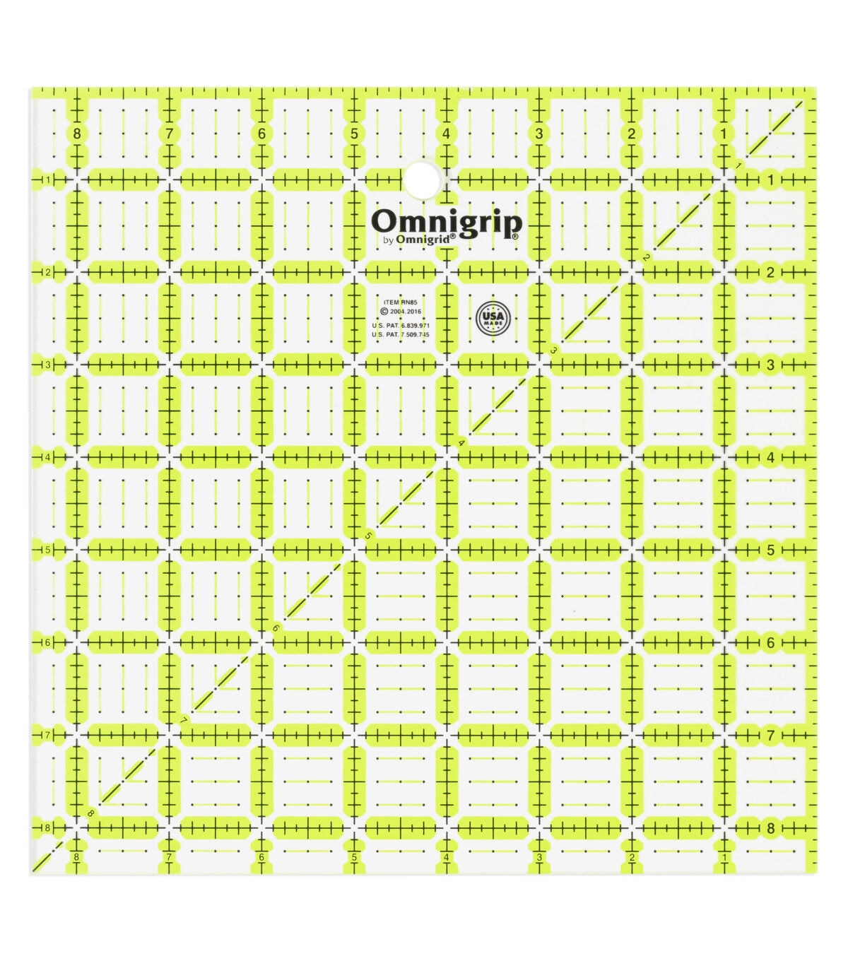 Create the perfect square for your quilting projects with the Omnigrid Non-slip Square Quilting Ruler - Neon. This easy-to-use quilter's ruler displays a clear background and neon lines so you can easily cut 8.5-inch squares, with 0.5-inch as an extra seam allowance. It also comes with a unique numbering and angle system that helps you with other squaring or trimming requirements. Use it with rotary cutters or straight-edged blades.