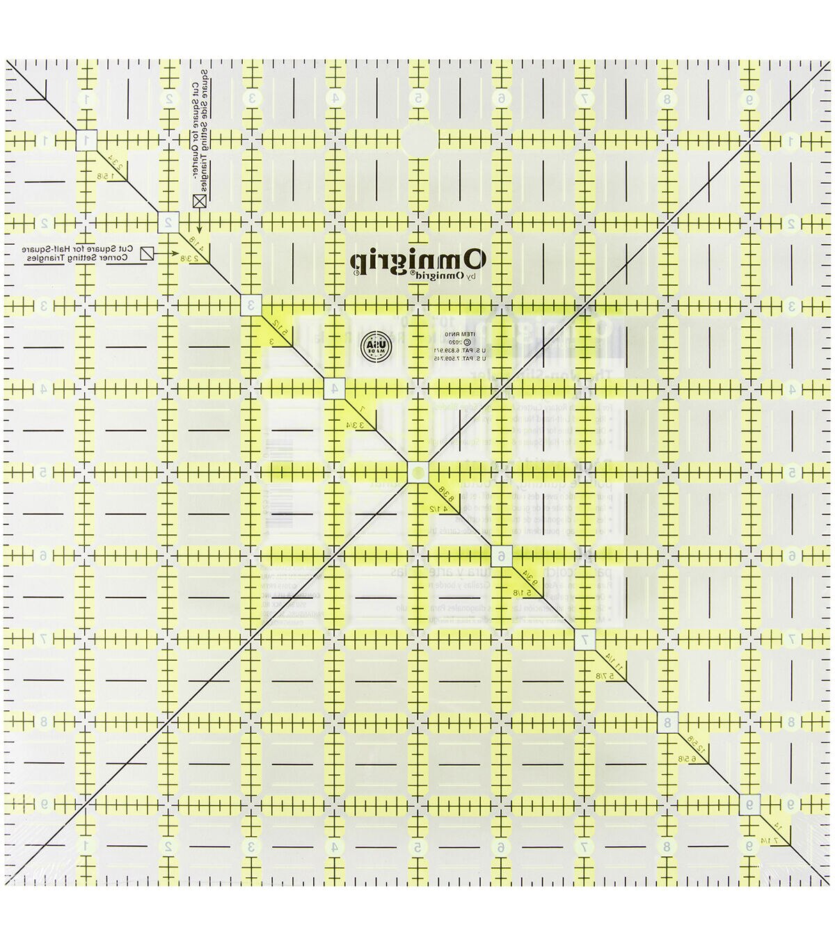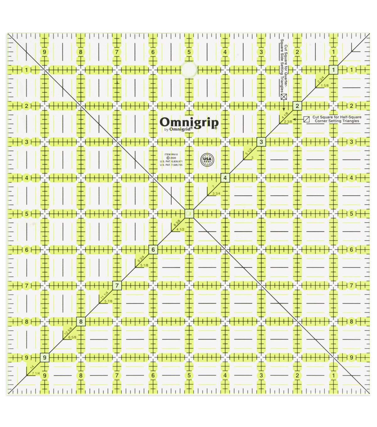 Make the Omnigrip by Omnigrid Non-slip Square Ruler part of your quilting, sewing and crafting supplies. It can be used with rotary cutter or straight-edged blades. This ruler is designed with a unique numbering and angle system and can be used with the right or left hand. Its grid sports neon green and black shades for easy visibility on both dark-colored and light-colored fabrics. You can use the 10-inch squares for cutting, squaring and setting blocks and the 45-degree diagonal lines for triangle cuts and marking for half-square and quarter-square triangles. The ruler also has an extra 0.5-inch included on two sides for quilting seam allowance.