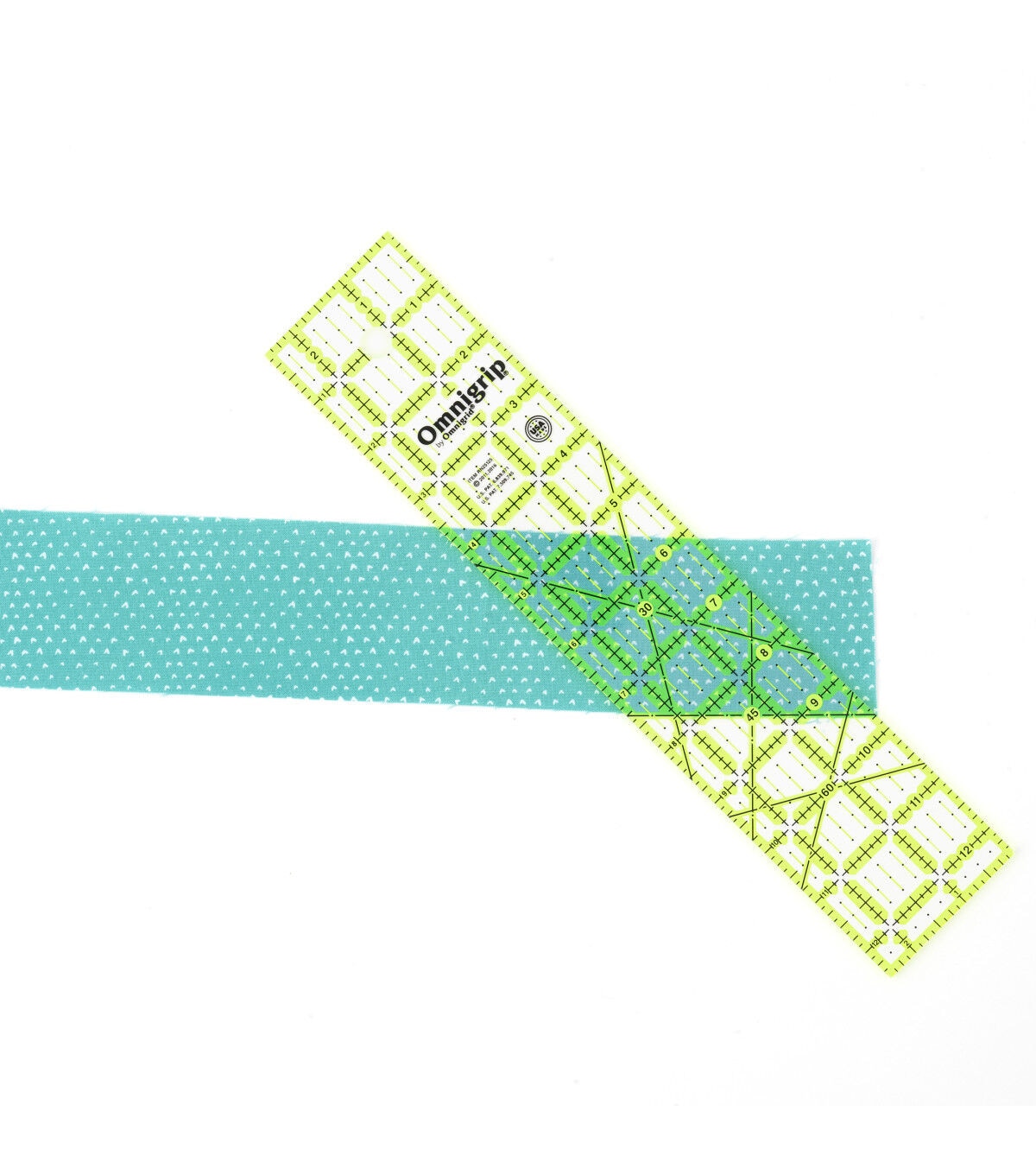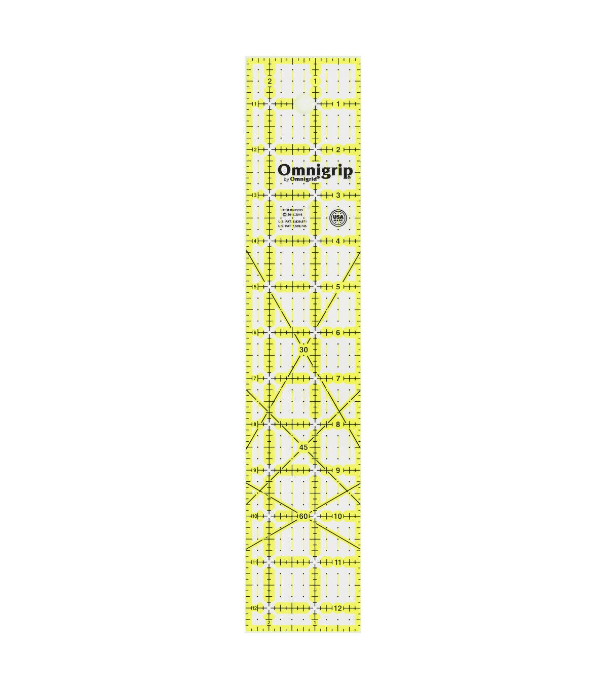 Cut your quilting fabrics with accuracy using the Omnigrid Non-slip Rectangle Quilter's Ruler - Neon. This pack includes a single non-slip quilter's ruler that features unique double-site lines. It is made of heavy-duty acrylic and also has a right and left angle and numbering system, 30-degree, 45-degree and 60-degree angle markings and an additional 0.5-inch for seam allowances. Use this ruler for cutting or sashing short strips while quilting.