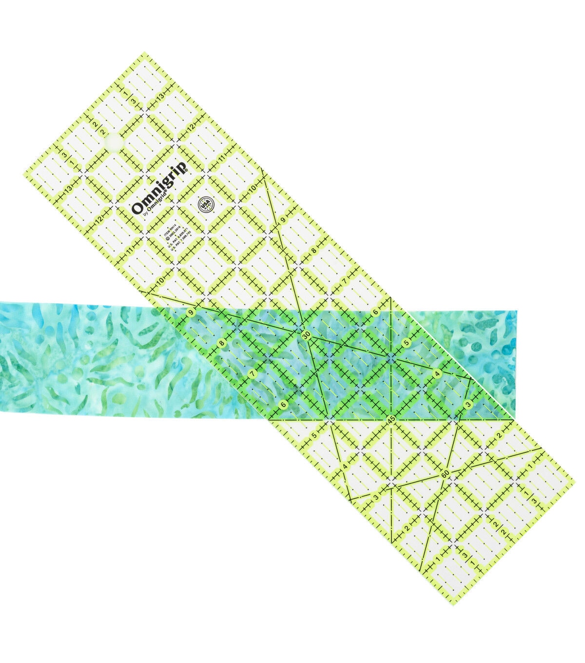 Add the Omnigrid Non-slip Rectangle Quilting Ruler - Neon to your sewing supplies. This acrylic ruler is handy, compact-sized, and provides the same versatility and functionality as regular-sized ones. It is the ideal quilter's ruler for the secondary cutting of fabric strips into squares and shapes or for cutting fat quarters. A unique numbering and angle system set against a clear background and neon lines make this ruler easy to use. You can use the quilter's ruler with rotary cutters or straight-edge blades.