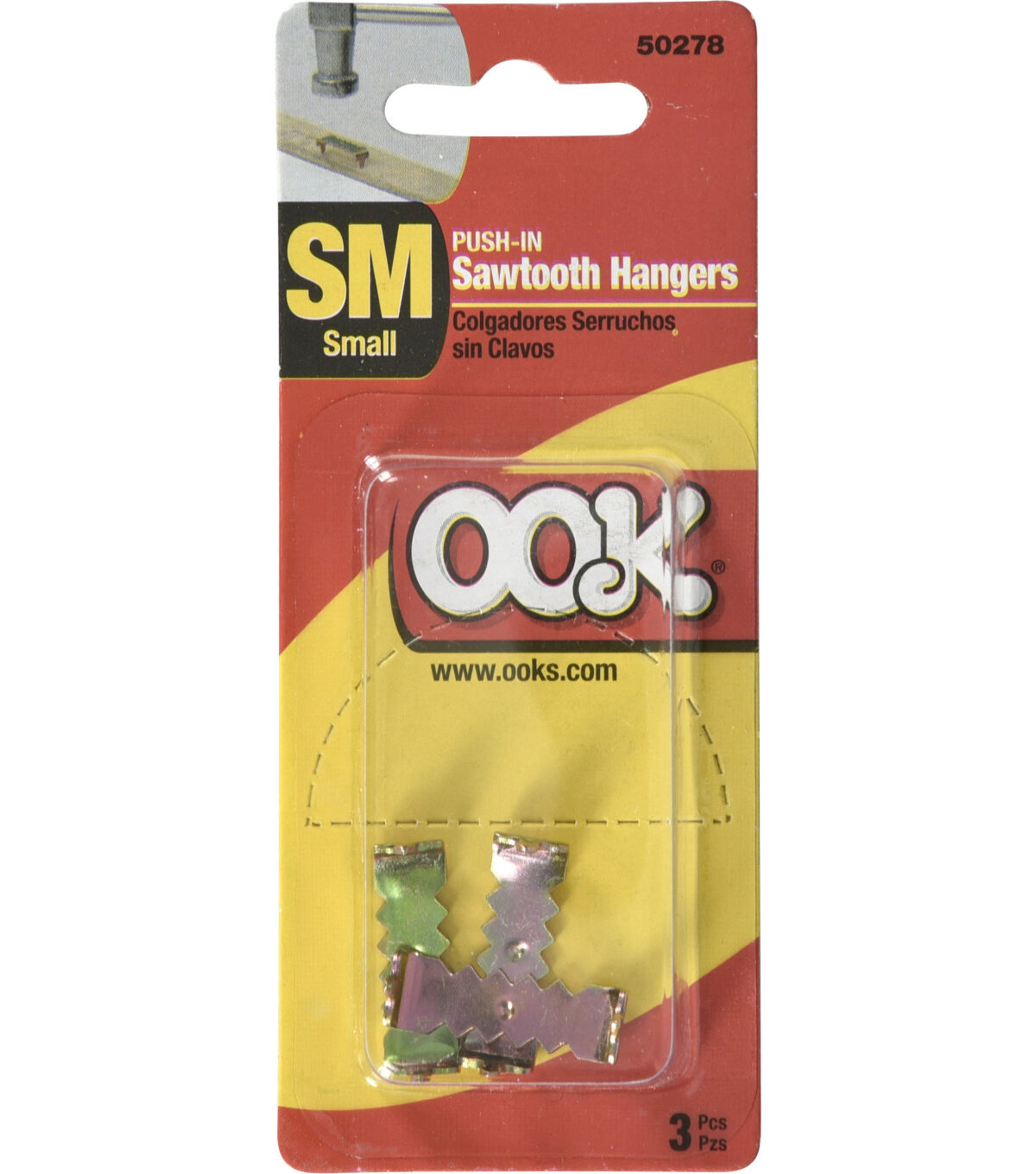 Don't hassle with small hardware pieces anymore. OOK's zinc yellow dichromate finished hangers are designed for easy installation. Simply, place in desired location and press. Great for wooden frames. Self-leveling. Available in small and large sizes.