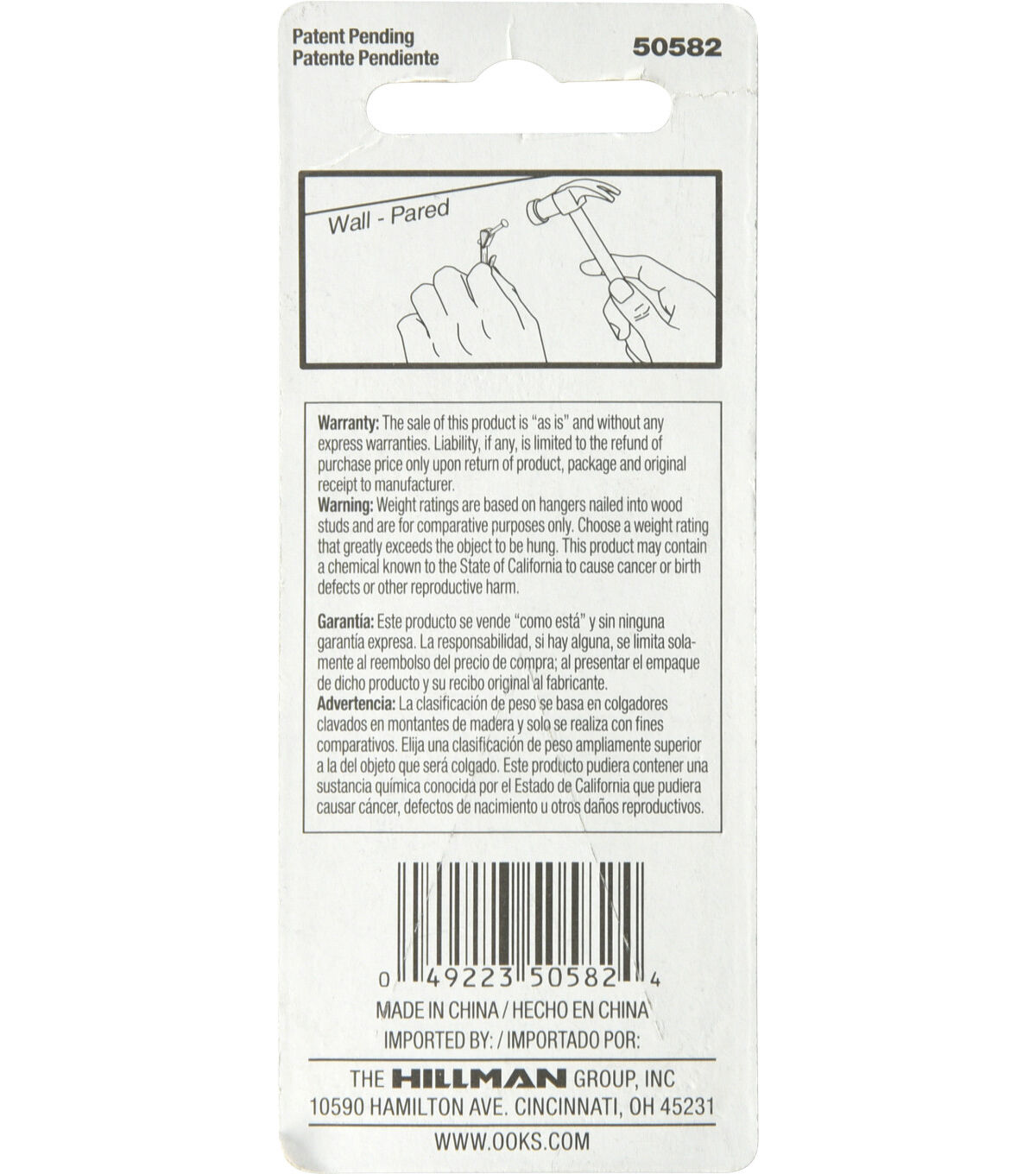 OOK ReadyNail conventional picture hangers are great for hanging pictures, artwork, and home décor. For use in drywall only. ReadyNail feature holds the nail for you, reducing risk of accident or injury. Nails are designed to minimize wall damage. Tools needed: hammer.