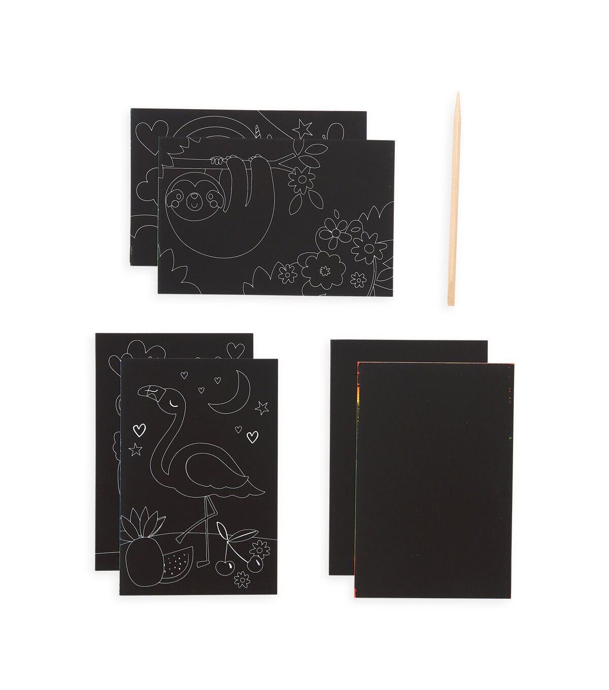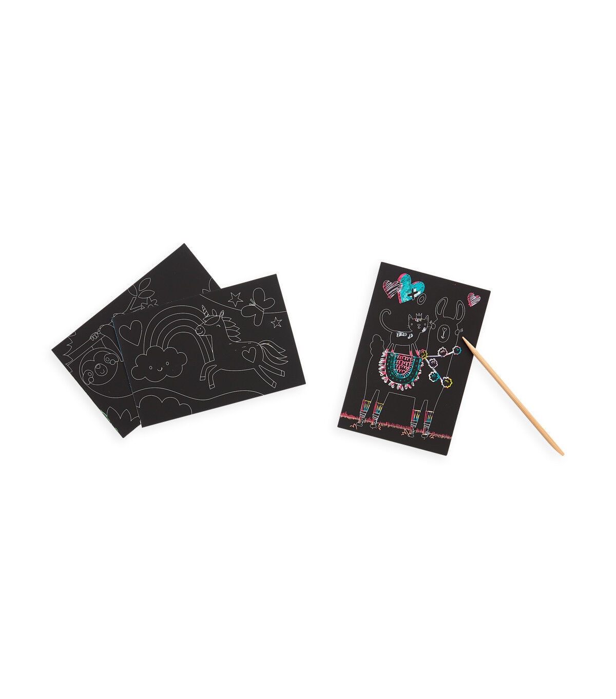 These funtastic friends themed scratch art cards are filled with easy-to-follow guidelines to reveal the animal inspired rainbow artwork featuring unicorns, llama, sloths and more. Sized for on-the-go fun at 4 x 6 inches these mini scratch art kits for kids are great for travel. Each kit not only has 4 cute animal illustrated cards but 2 blank cards for creating your own designs, all revealing a rainbow of color using the included wooden stylus.
