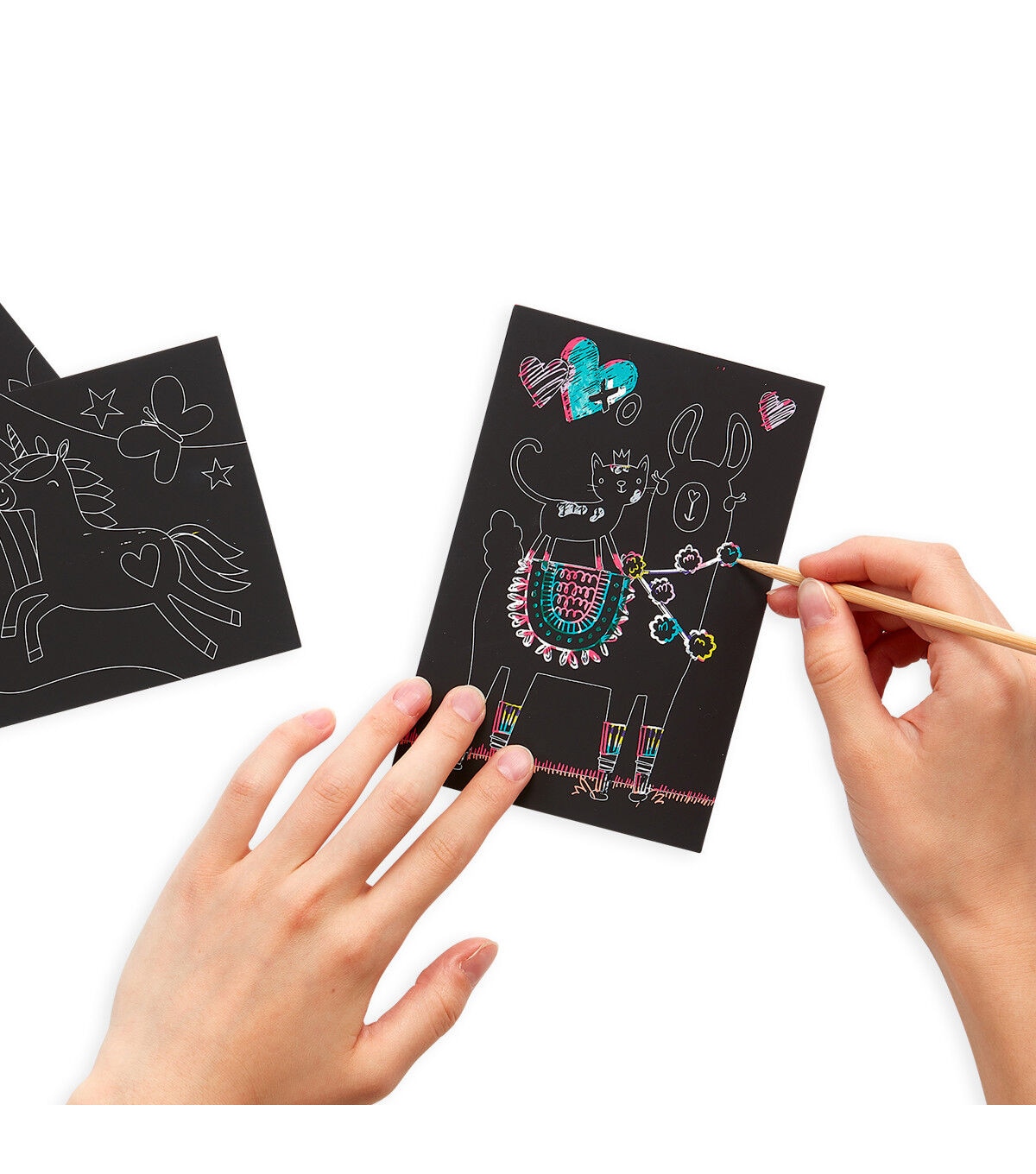 - 2 rainbow DIY blank scratch cards (4 x 6 inches), 1 wooden stylus – all you need to get started right away, Guided illustrations – easy for anyone to follow, even adults!
