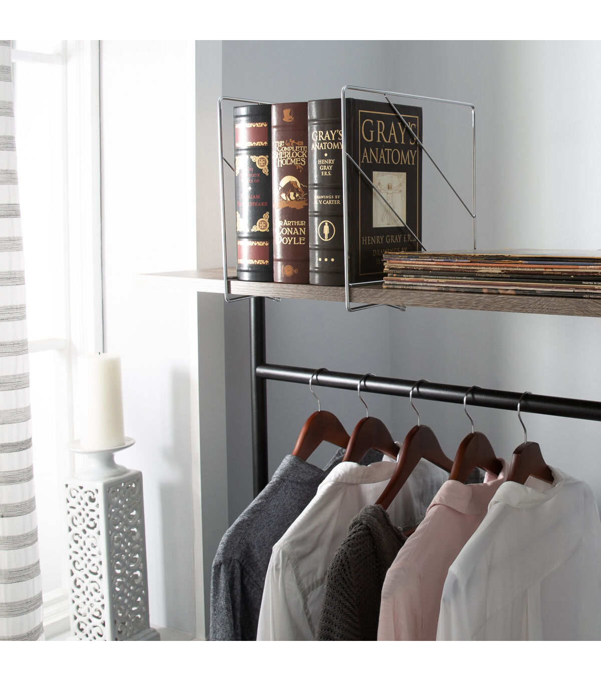 - Securely locks to any solid shelf and prevents clothing from falling over
