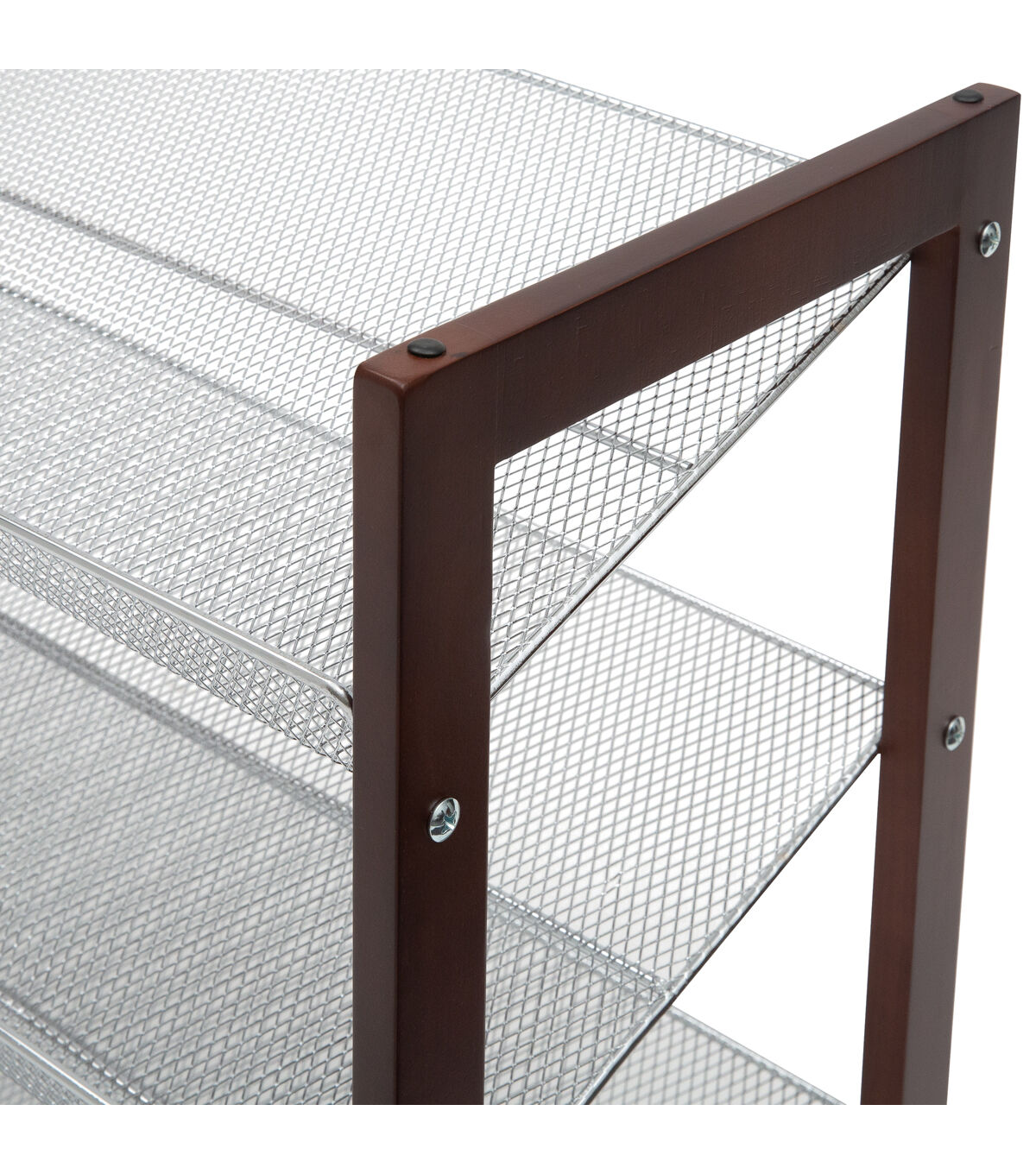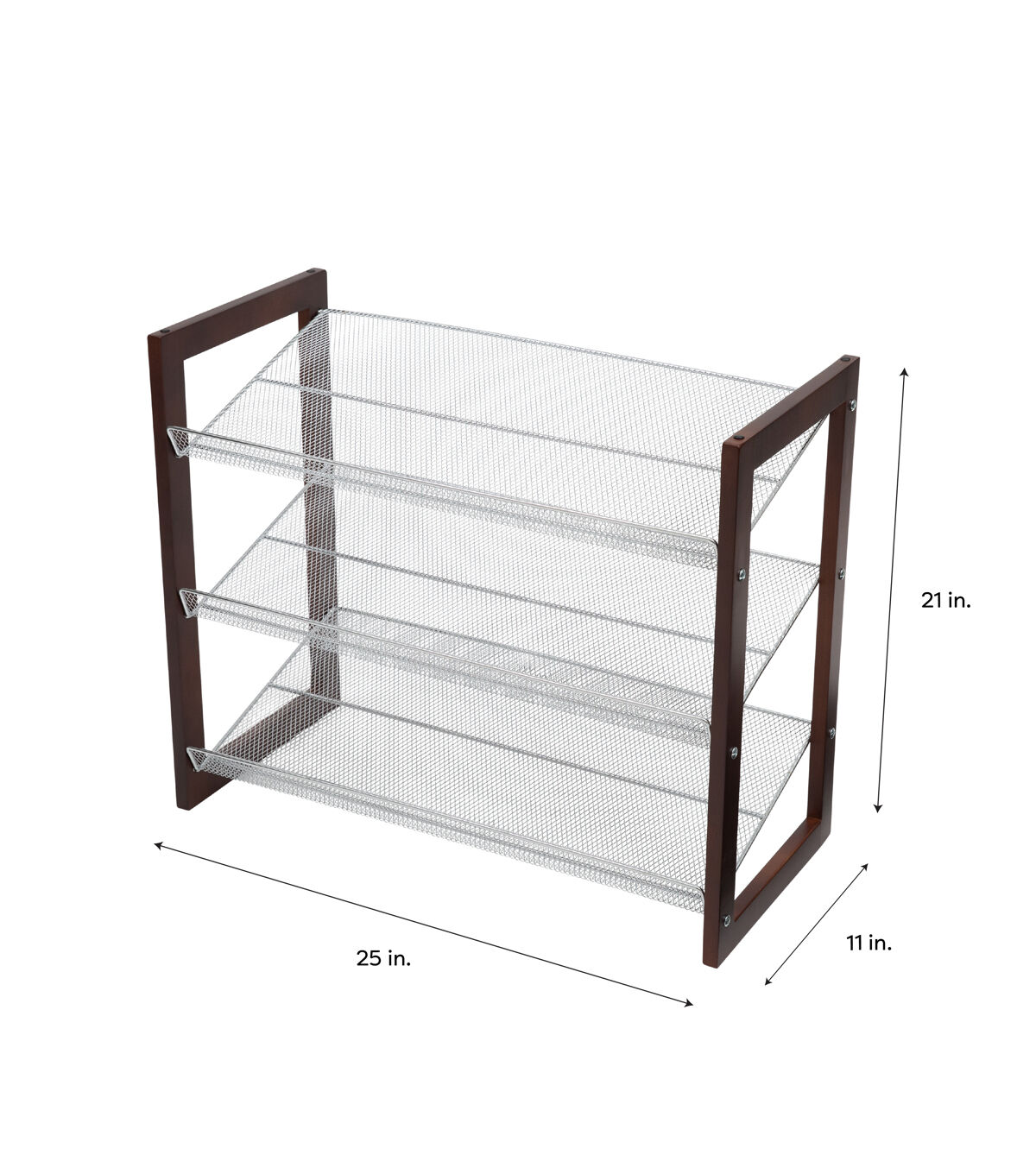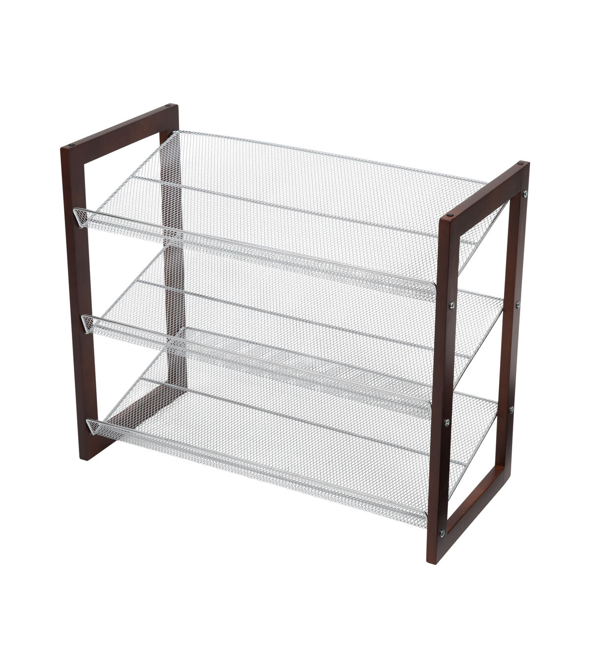 Add this Organize It All Shoe Rack to your home space to maximize storage. The shoe rack holds up to 9 pairs of shoes. The mesh racks are tilted with a front stop to prevent shoes from falling out. Put this item in your entryway or bedroom to create a nice place for storage and to keep your shoes organized.