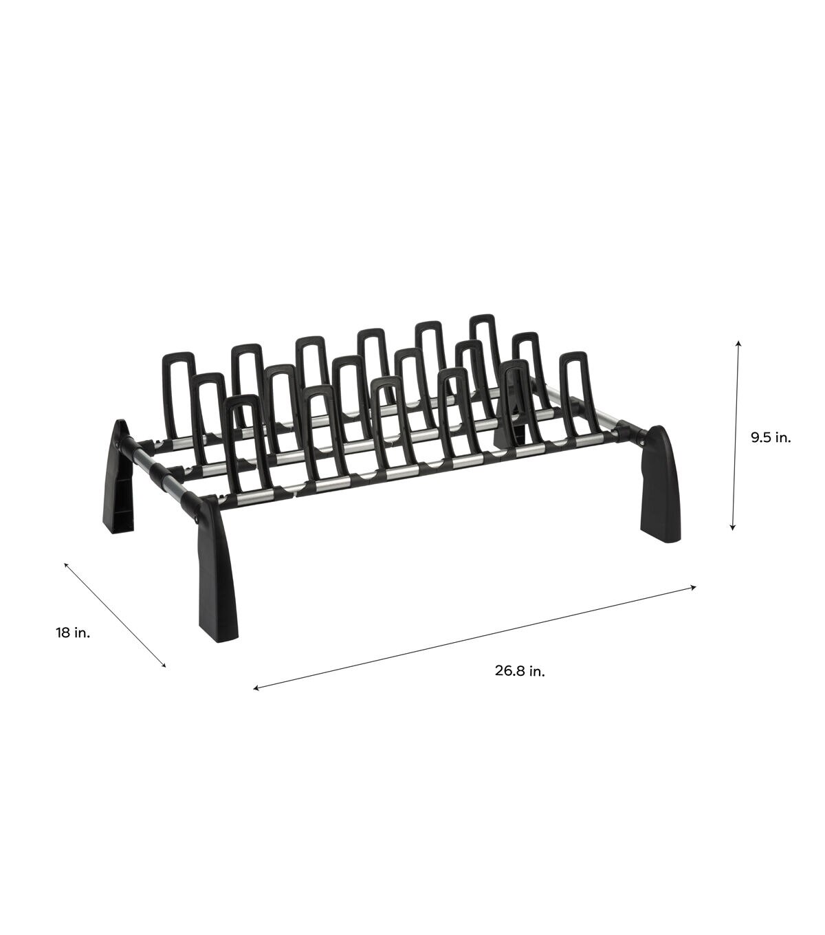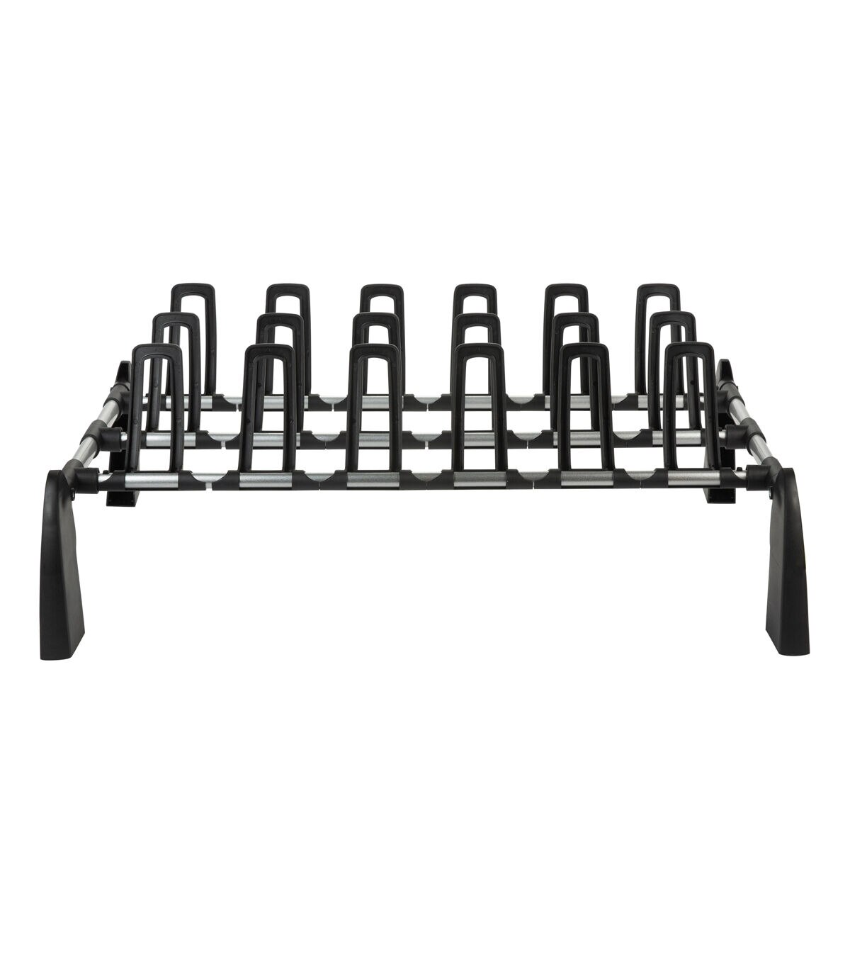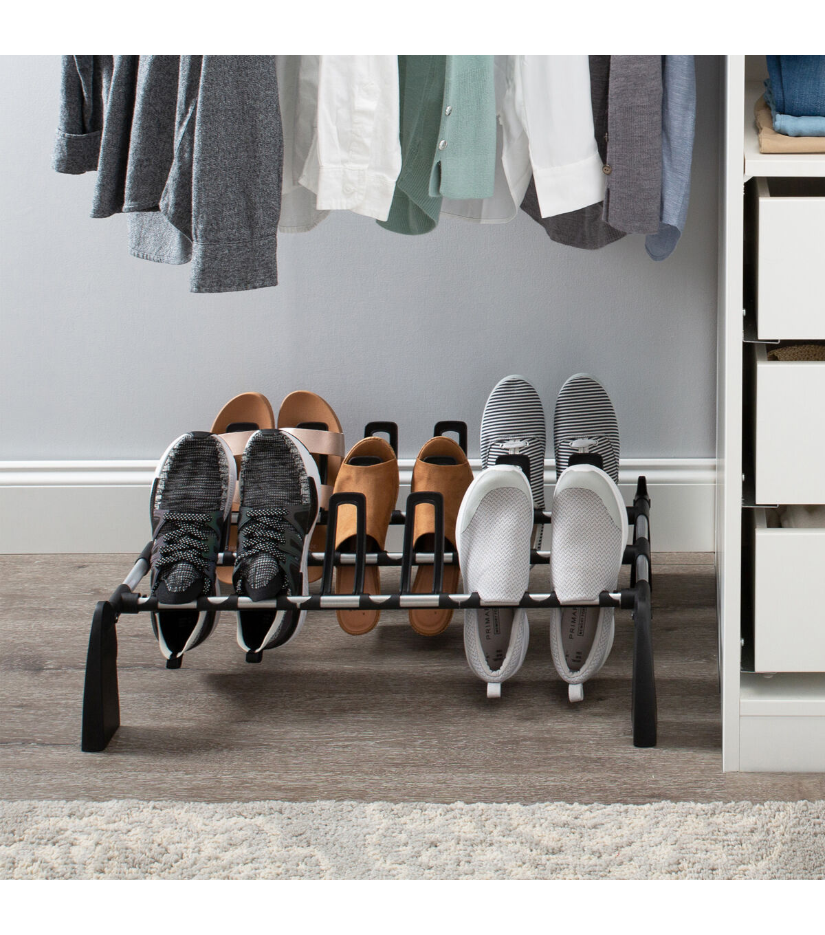 The compact design of the Organize It All 9 Pair Floor Shoe Rack is perfect to fit in any location needed. Use in the bedroom or dorm room to keep your shoes organized so they take up less space. The design is simple and modern and goes with any home décor. Tuck away in the closet or keep in the entry to create a new storage space in your home.