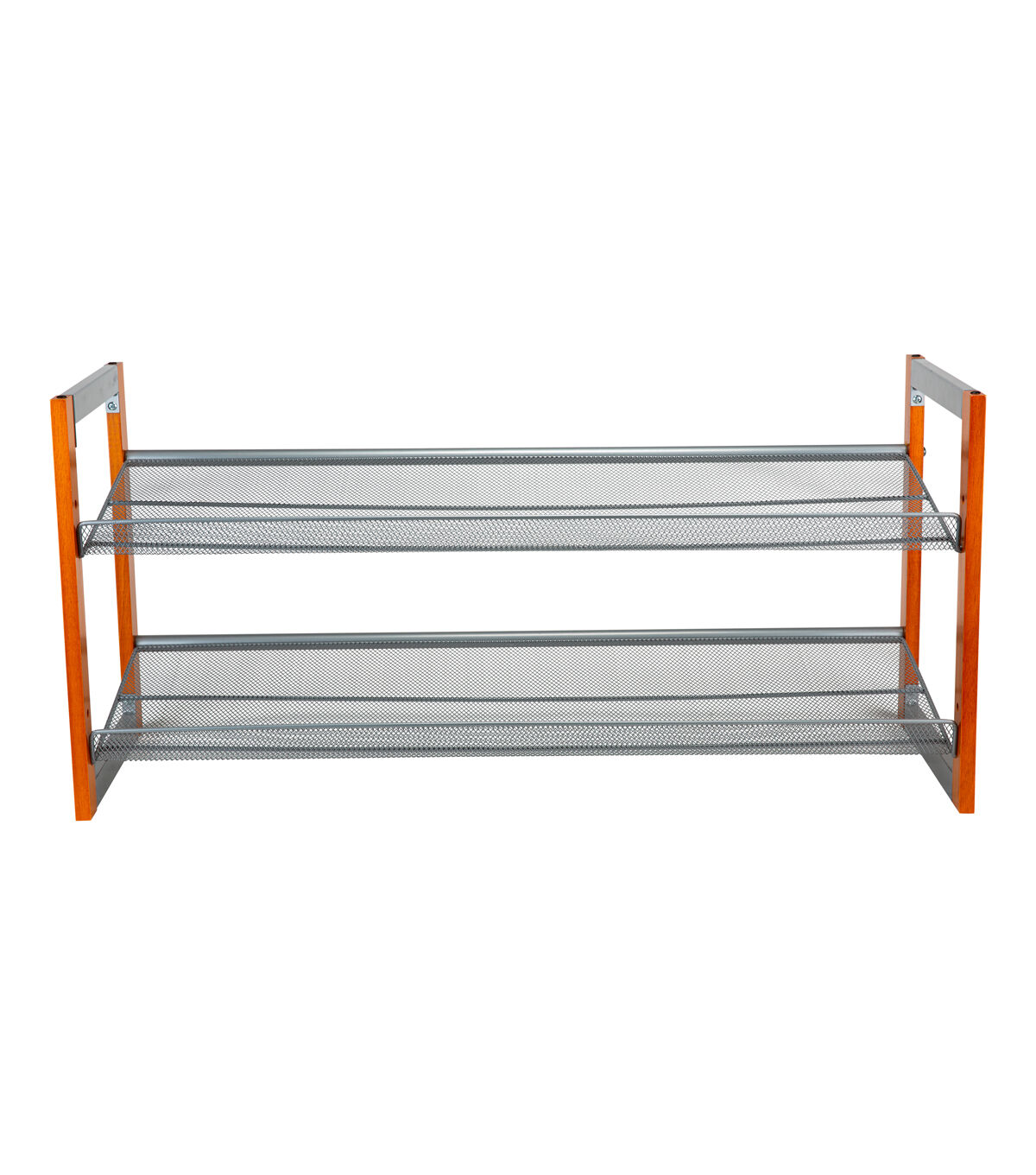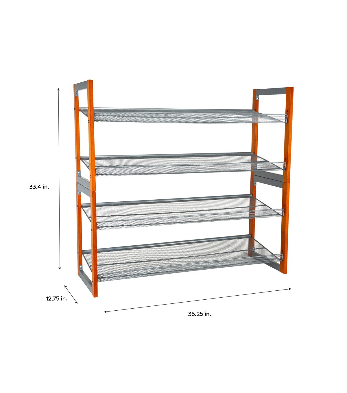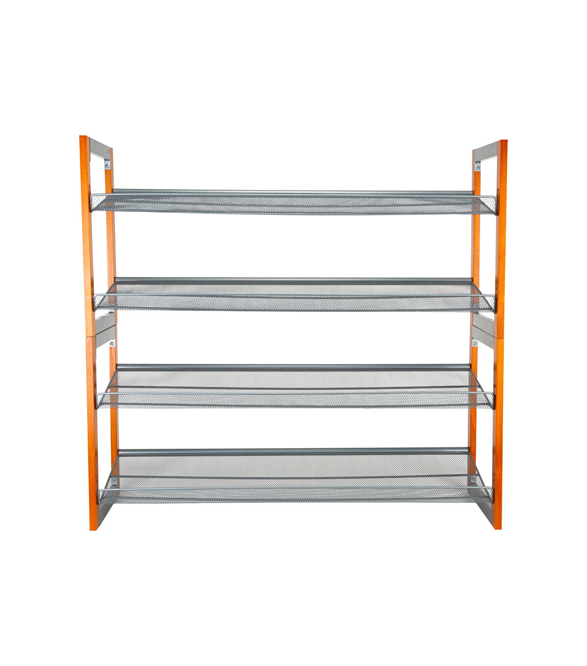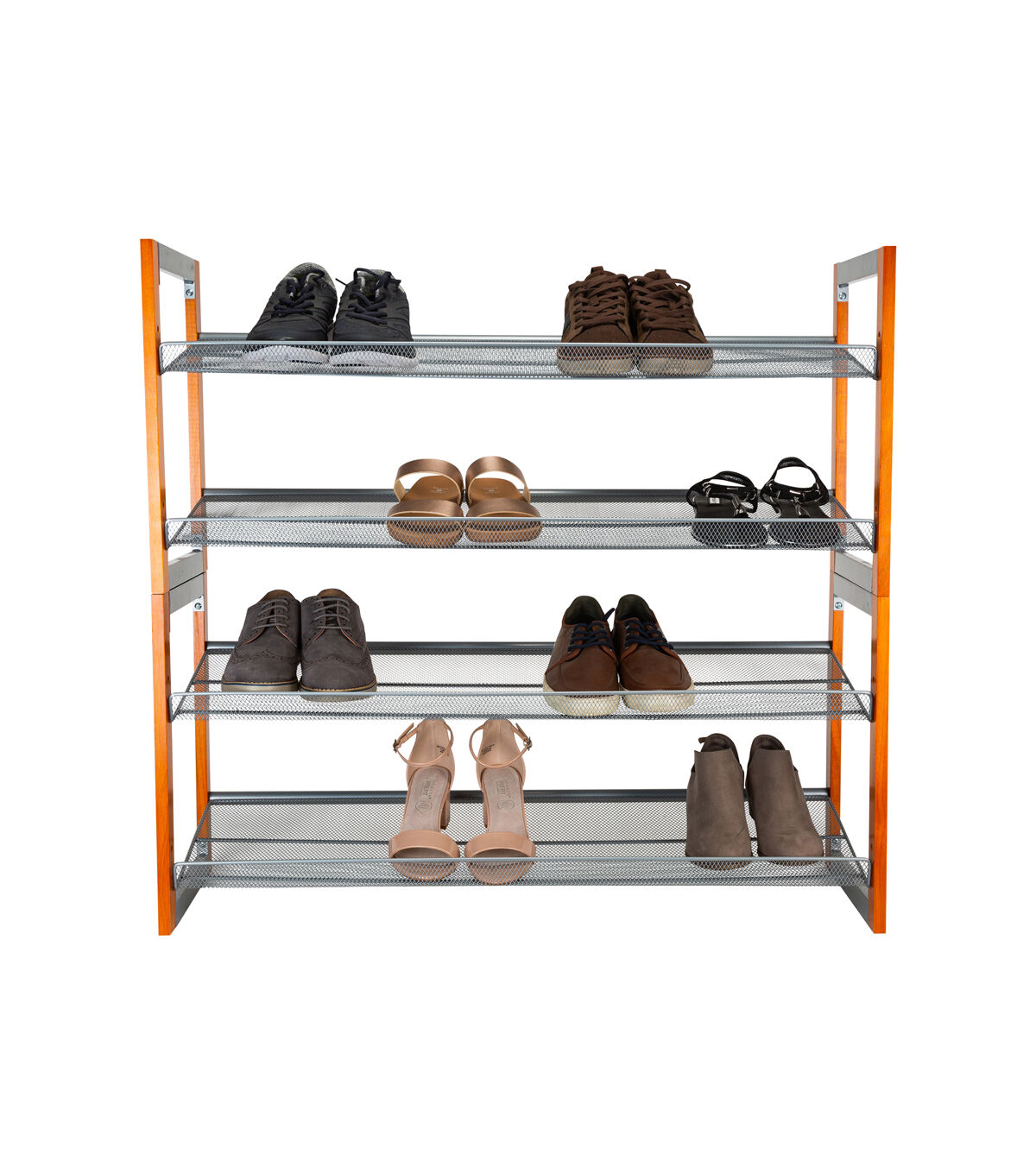 Maximize your storage space by storing your shoes on the Organize It All stackable shoe rack. This item includes two racks that stack on top of one another equaling 4 tiers of shelving. Each shelf holds up to 4 pairs a shoes totaling 16 pairs for the entire shoe rack. Holds all different types of shoes such as boots, sandals, pumps, sneakers and loafers. Great for placing in a closet, entryway or bedroom! The Shelf can be angled or flat .