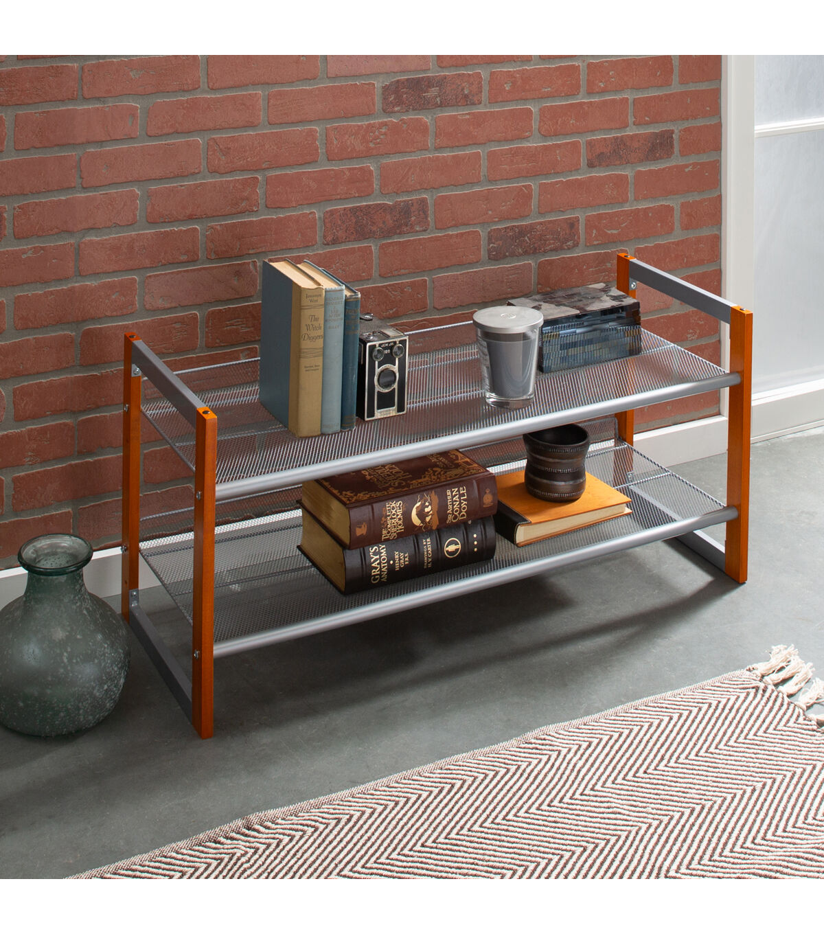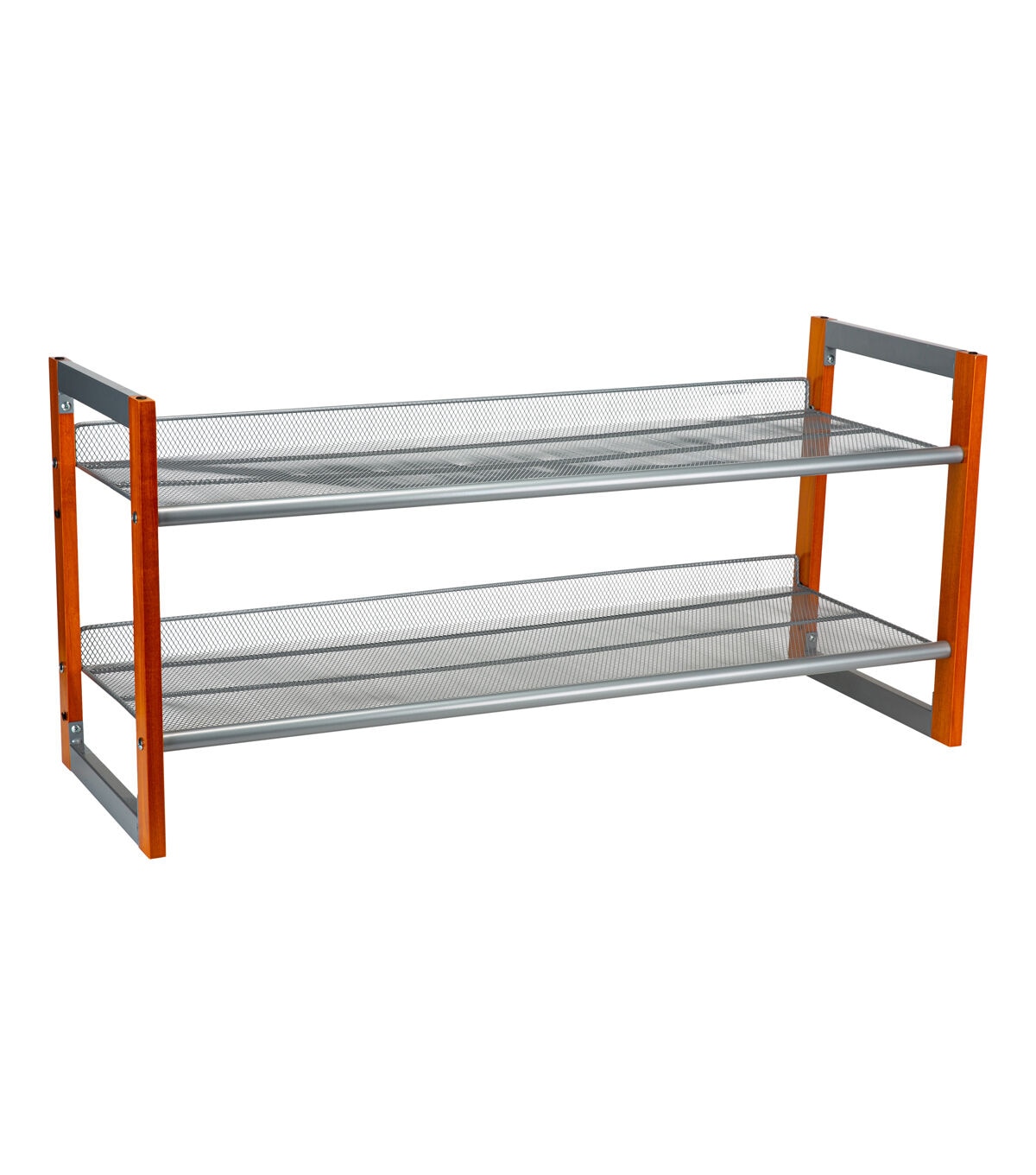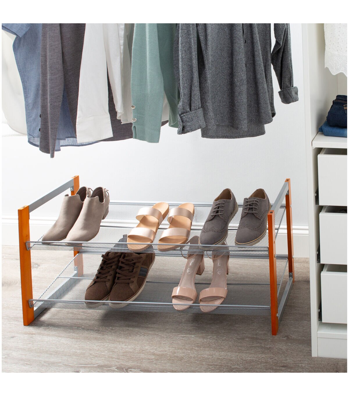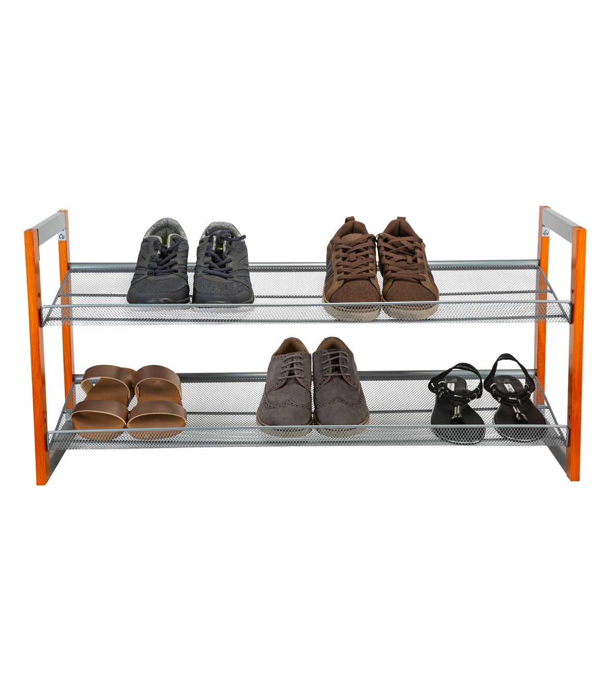 Maximize your storage space by storing your shoes on the Organize It All stackable shoe rack. This item includes two racks that stack on top of one another equaling 4 tiers of shelving. Each shelf holds up to 4 pairs a shoes totaling 16 pairs for the entire shoe rack. Holds all different types of shoes such as boots, sandals, pumps, sneakers and loafers. Great for placing in a closet, entryway or bedroom! The Shelf can be angled or flat .