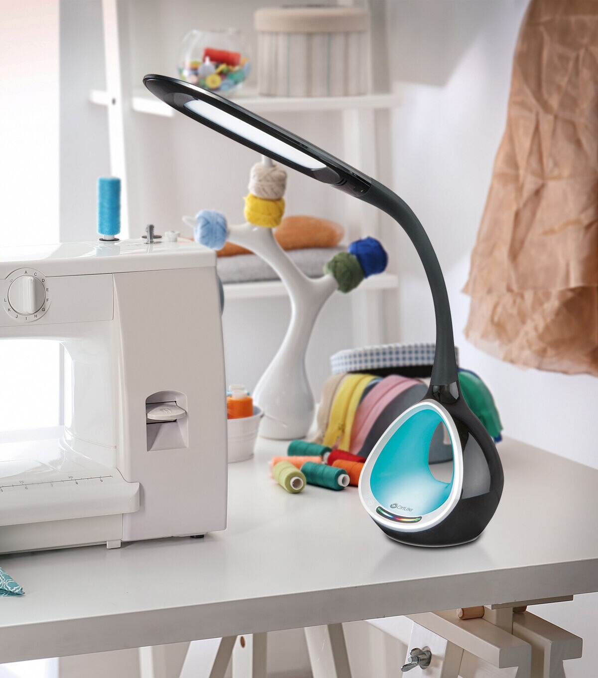 Enliven your crafting space with the OttLite LED Desk Lamp with Color Changing Tunnel and USB-Black. It’s designed with silver accents and a sleek glossy finish. Its unique color tunnel glows in the color you choose, or cycles through the color spectrum. This touch lamp has five brightness settings and offers smooth, even lighting. It also features a flexible rubberized neck, 9.5-inch shade, and a 5V, 2.1A USB port to charge phones and tablets. With super bright white, Natural Daylight LEDs that adjust to three color temperatures and last up to 40,000 hours, you can illuminate your home office or dorm room with ease.