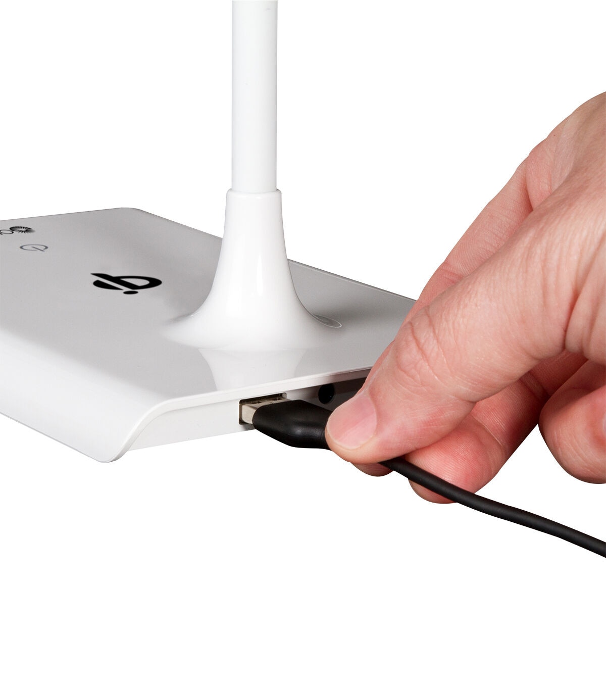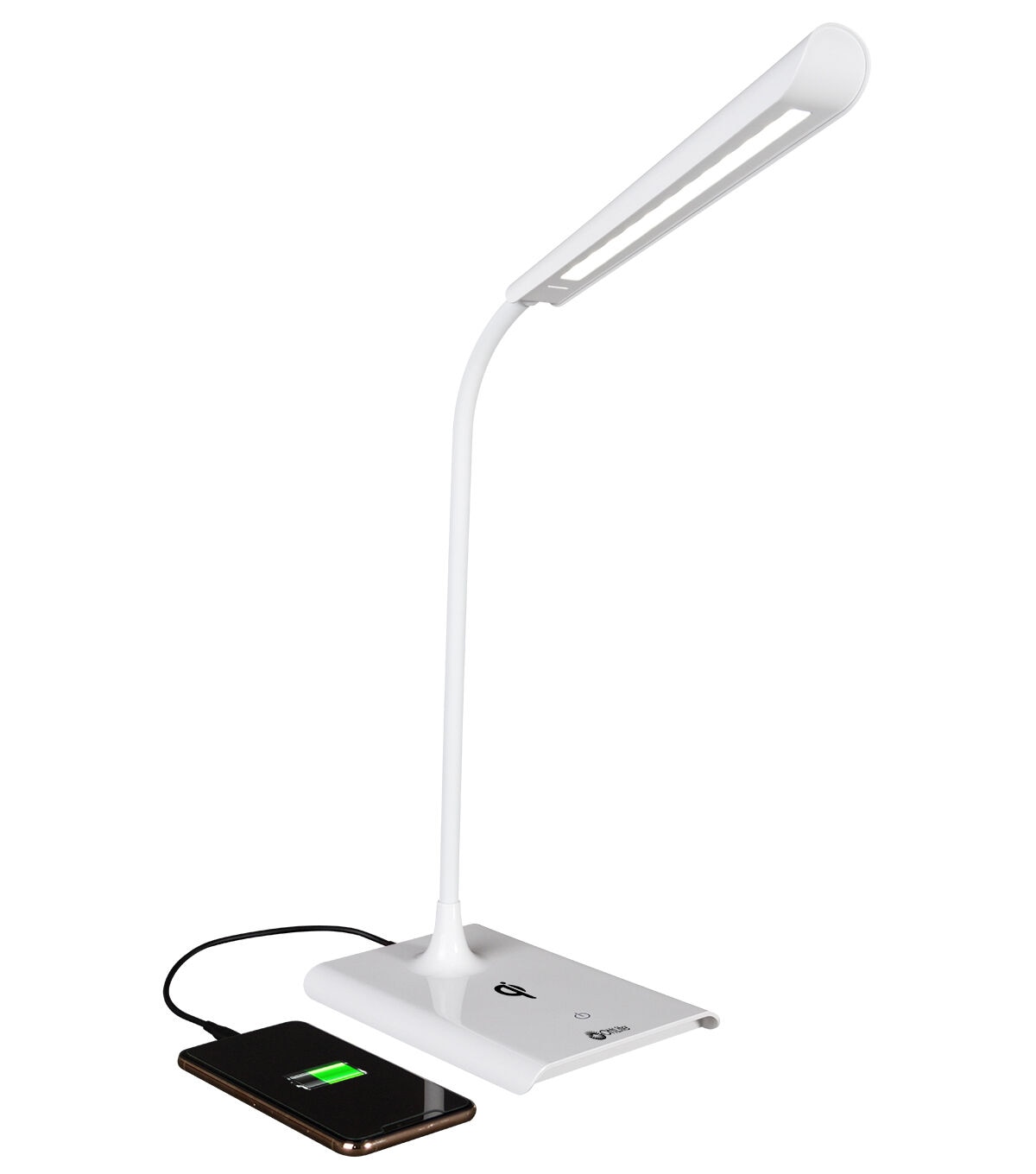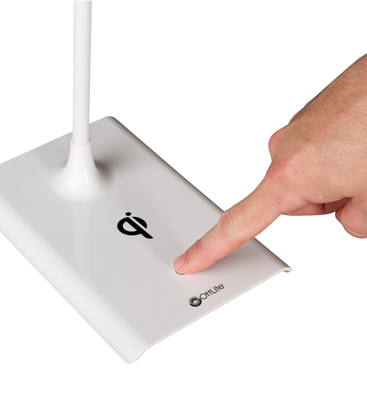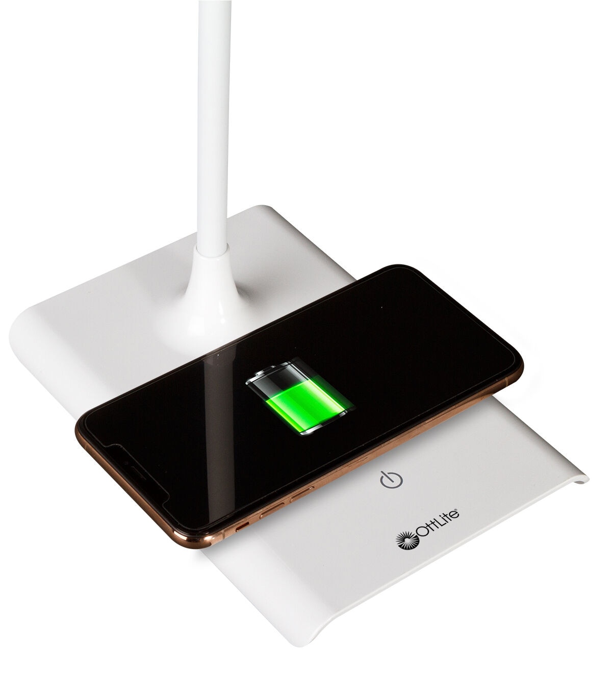A power-packed duo: Qi-wireless charging and next generation ClearSun LED lighting. The Power Up LED Desk Lamp features BOTH giving you the total convenience of wireless charging and dramatically reduced eyestrain. Three out of four people experience the discomfort of eyestrain on a daily basis. Harsh illumination, blue wavelength spikes and computer screens are often the culprit. OttLite ClearSun LEDs provide a balanced spectrum, just like the sun, to make seeing and reading easier and more comfortable. This powerful illumination is delivered in a sleek and flexible style with touch controls and dimmability to customize light levels. Charge your Qi-enabled device wirelessly on the lamp base or through the 5V, 2.1A USB port.