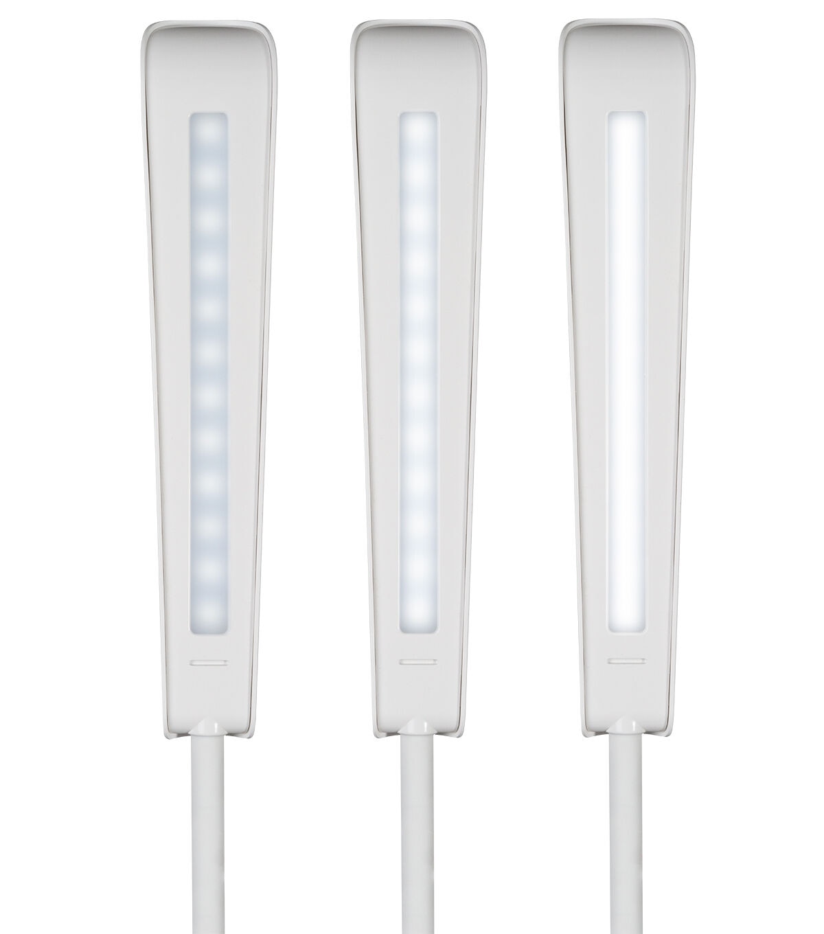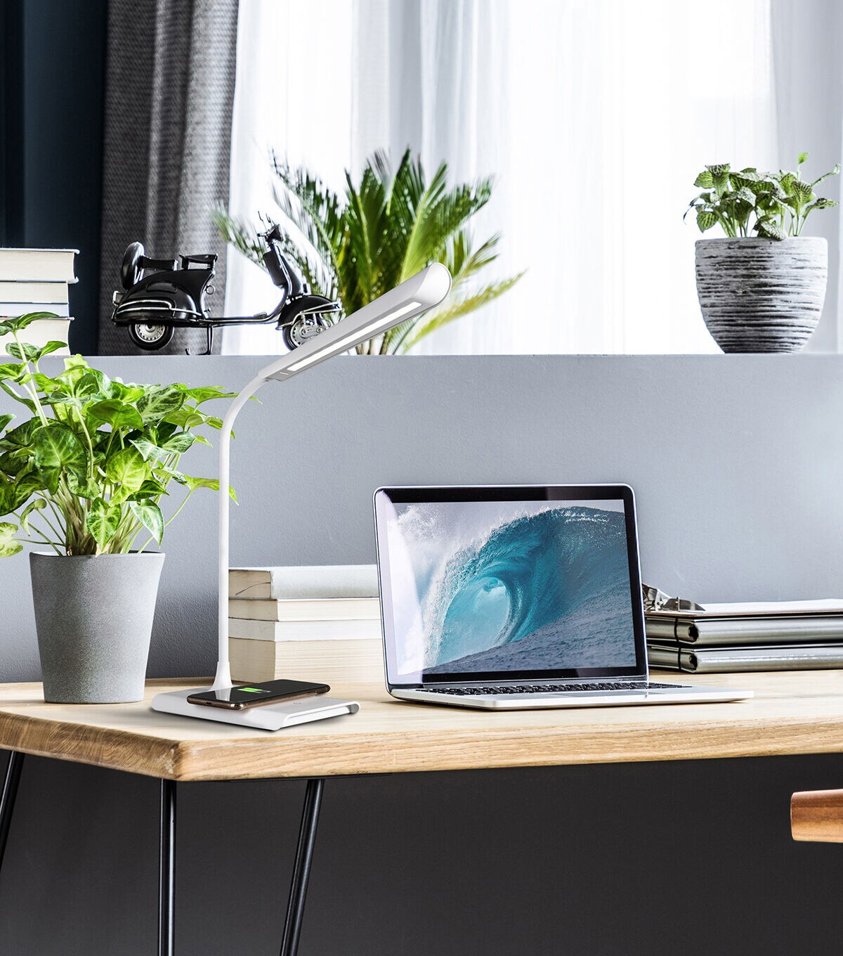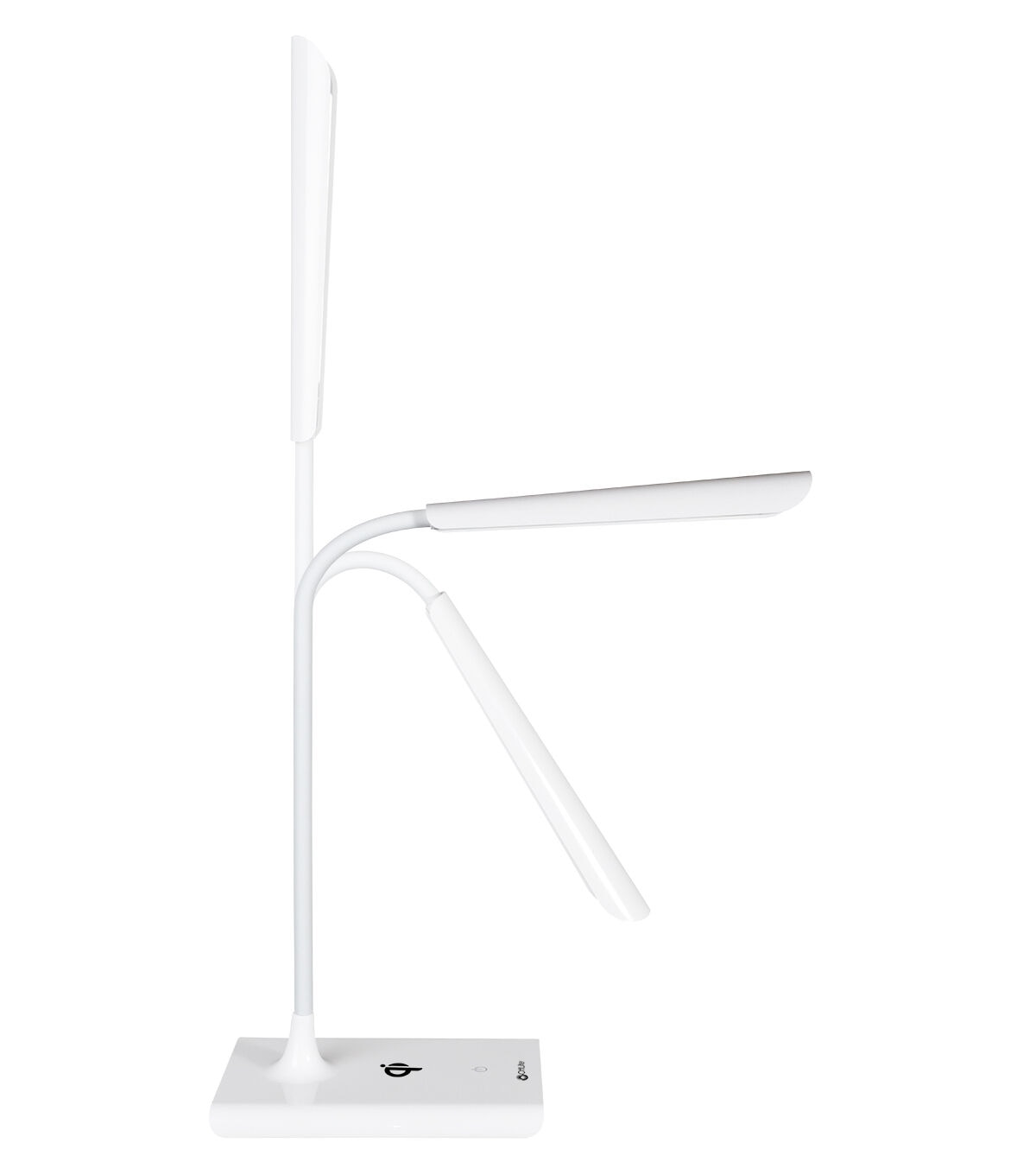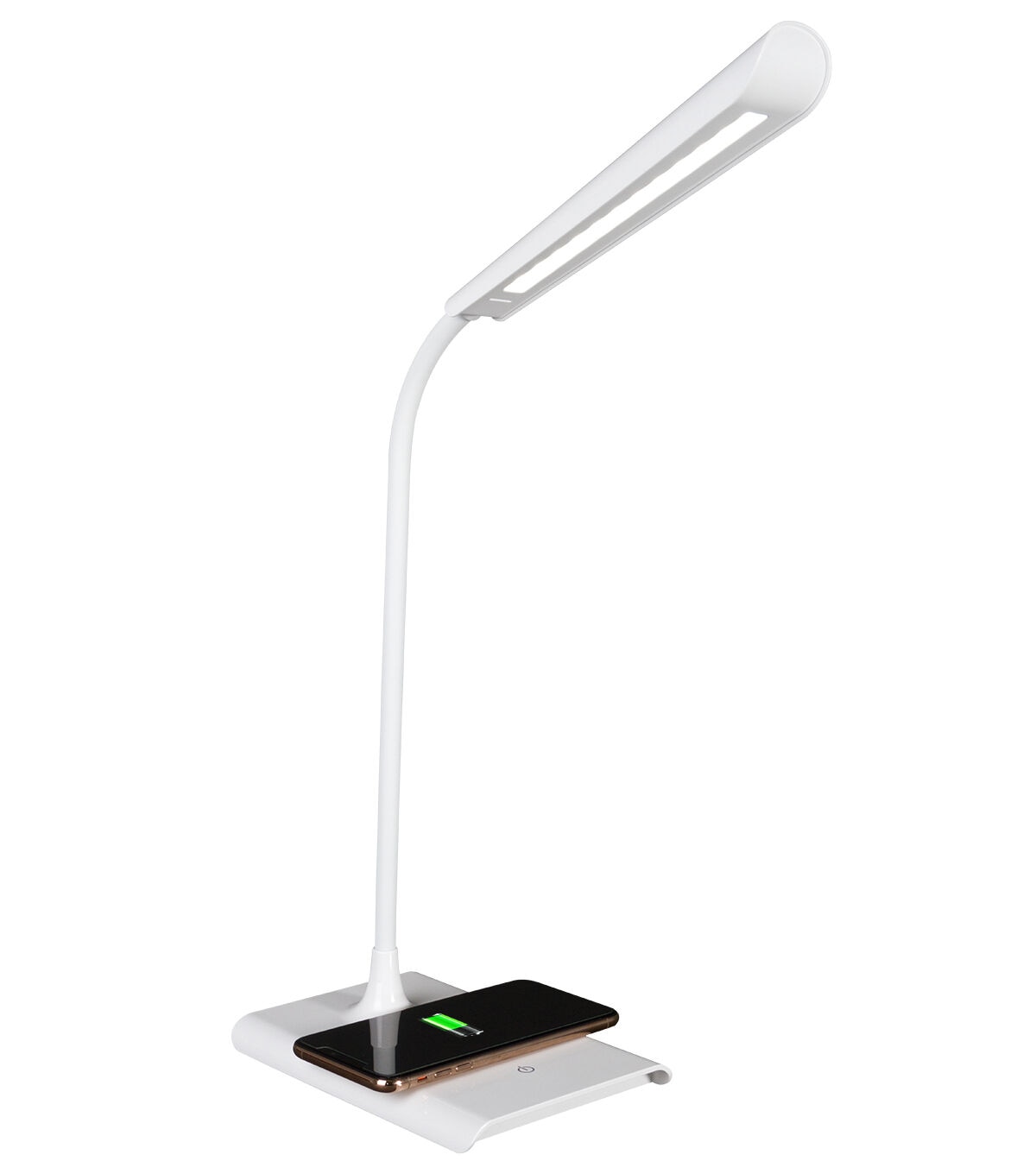 A power-packed duo: Qi-wireless charging and next generation ClearSun LED lighting. The Power Up LED Desk Lamp features BOTH giving you the total convenience of wireless charging and dramatically reduced eyestrain. Three out of four people experience the discomfort of eyestrain on a daily basis. Harsh illumination, blue wavelength spikes and computer screens are often the culprit. OttLite ClearSun LEDs provide a balanced spectrum, just like the sun, to make seeing and reading easier and more comfortable. This powerful illumination is delivered in a sleek and flexible style with touch controls and dimmability to customize light levels. Charge your Qi-enabled device wirelessly on the lamp base or through the 5V, 2.1A USB port.