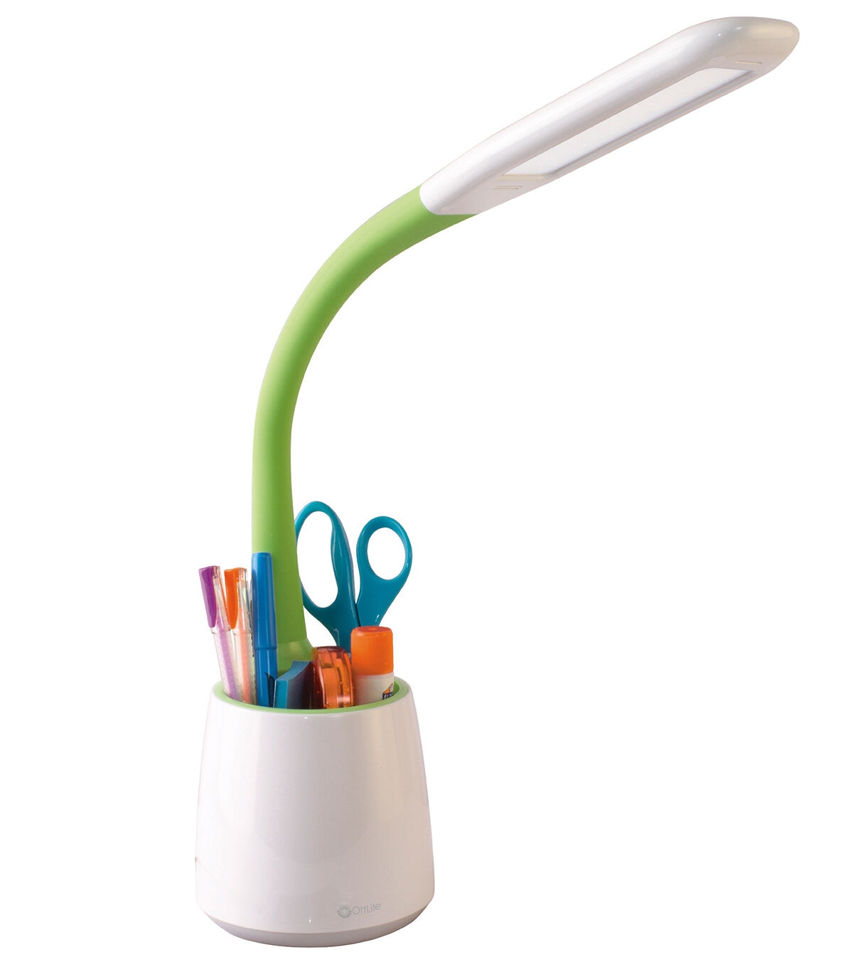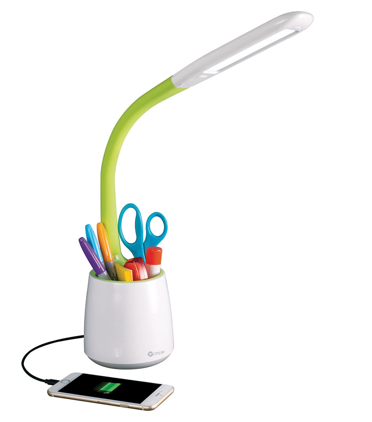 neck to easily direct light - Large storage area to keep pens, scissors and other supplies organized