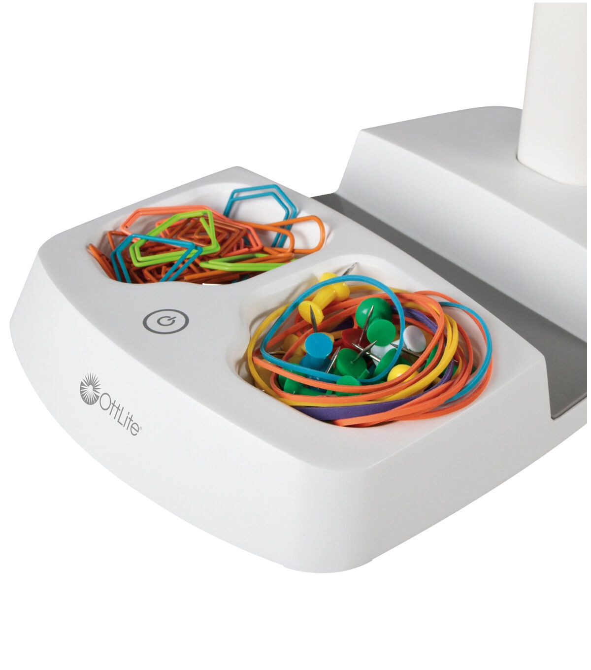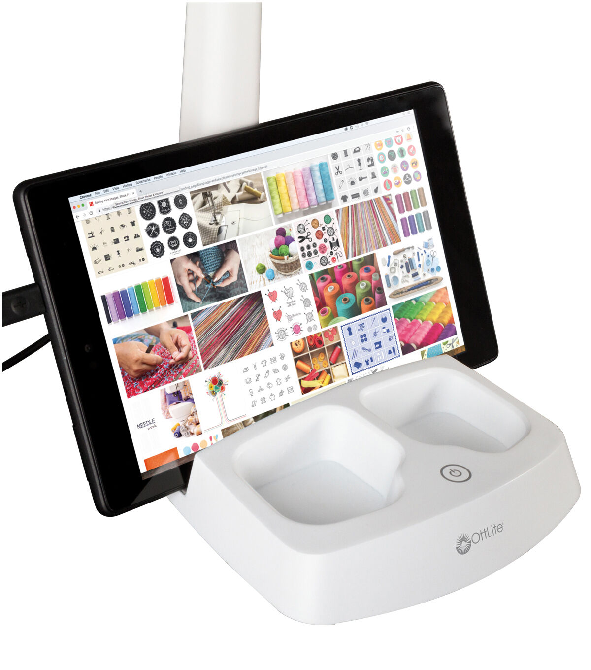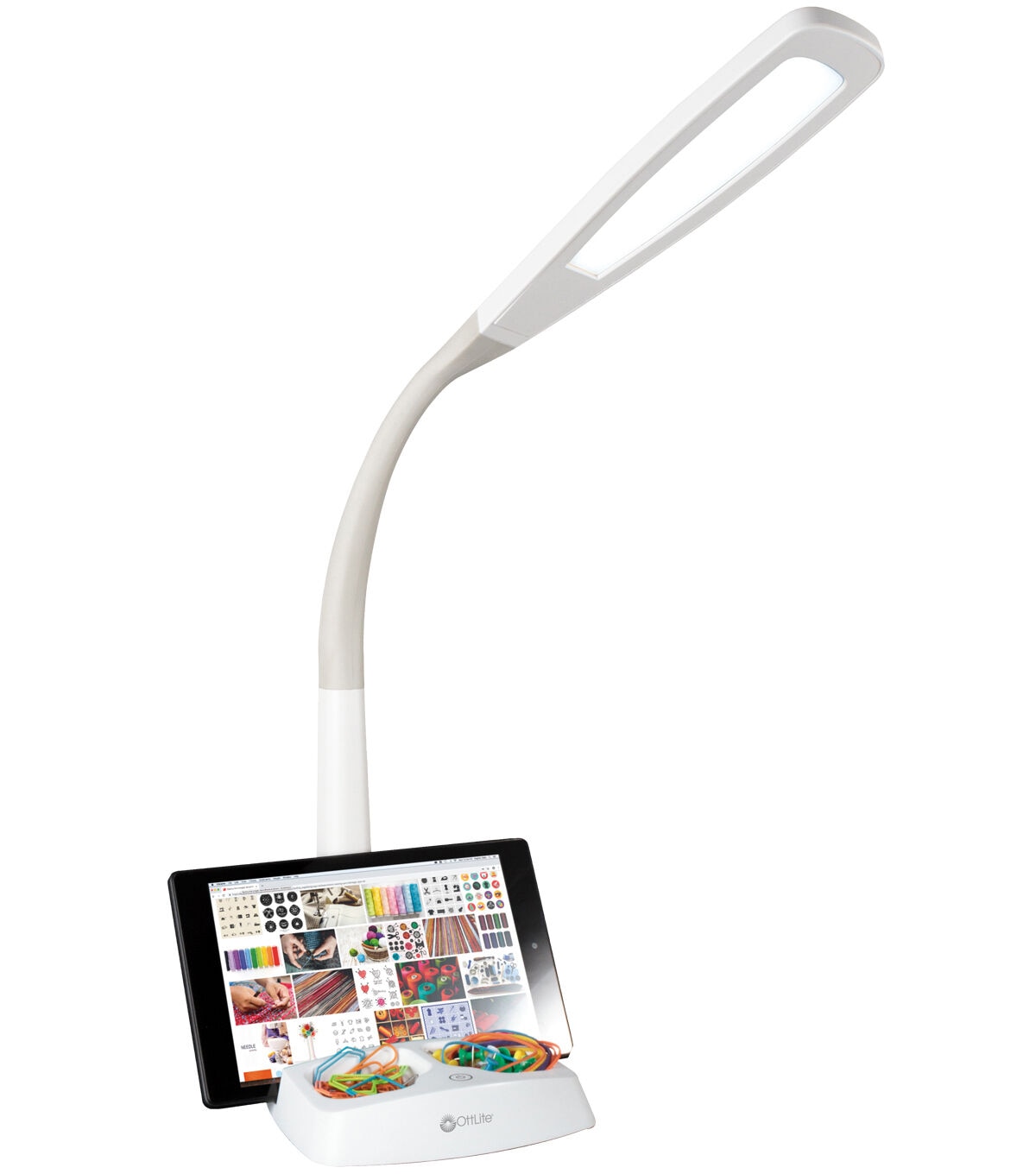 The OttLite LED Desk Lamp with Charging Station is all about inspiration! The integrated stand holds your tablet or phone so you can watch tutorial videos, check out ideas on Pinterest, look up recipes and so much more. Plus, you can plug in your tablet or phone to the 5V, 2.1A USB port to charge while you create. And, with OttLite ClearSun® LED technology, you’ll see every color accurately and detail with incredible clarity. Easily adjust the light level using the touch switch and flexible arm.