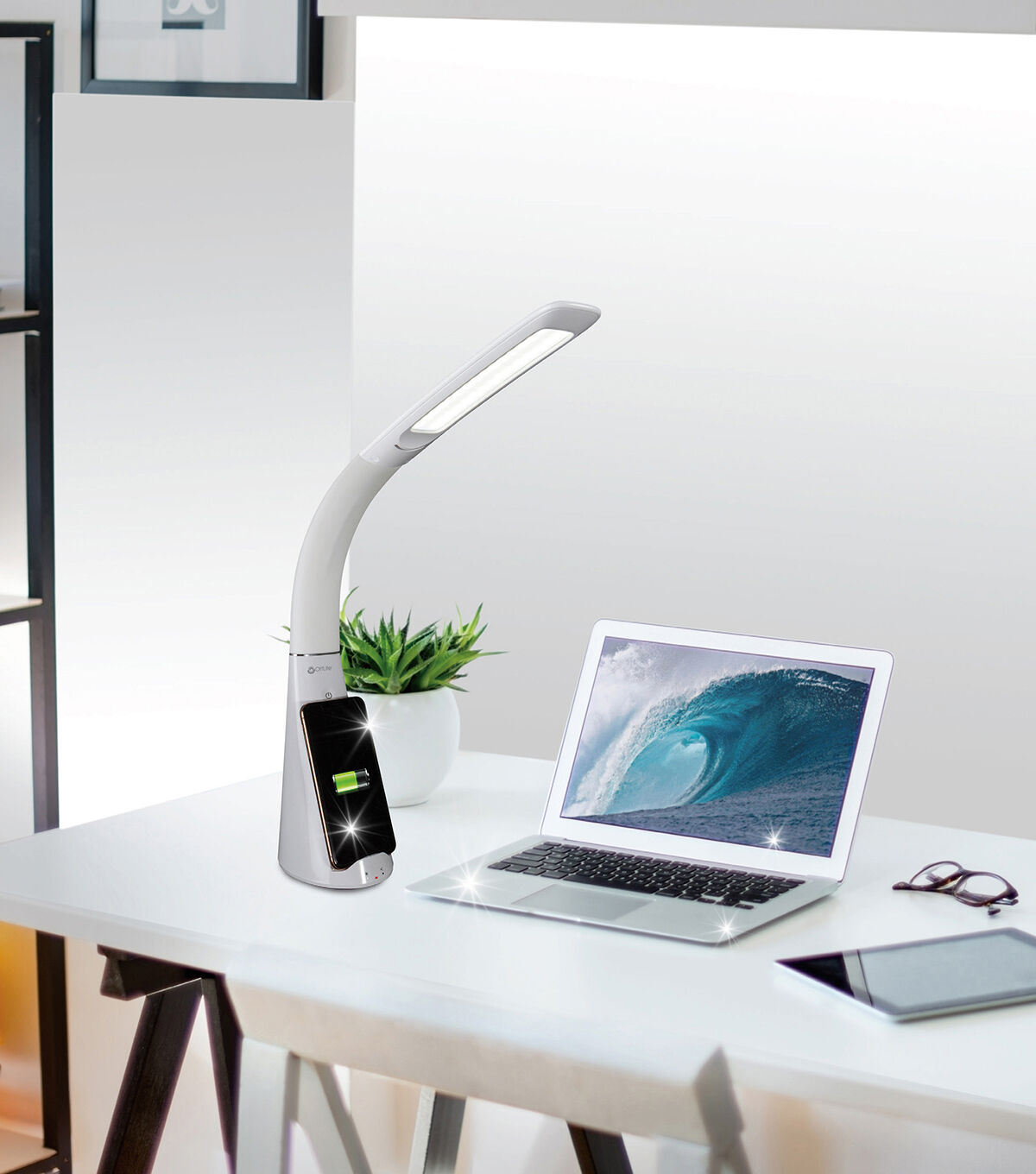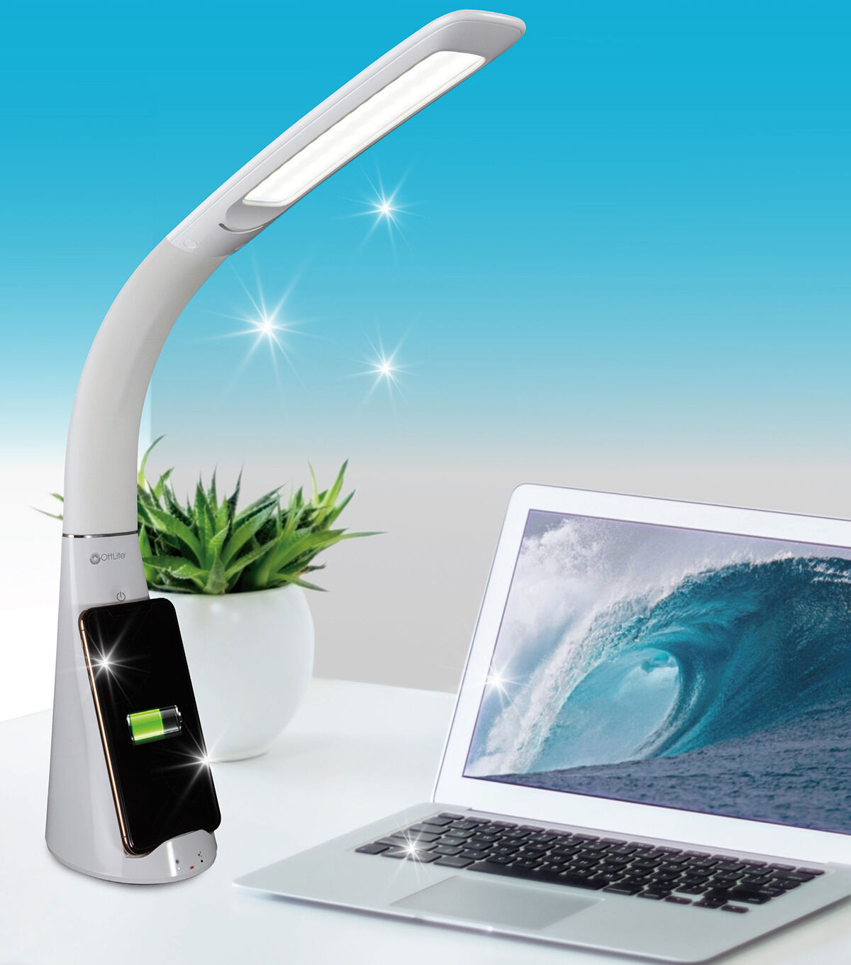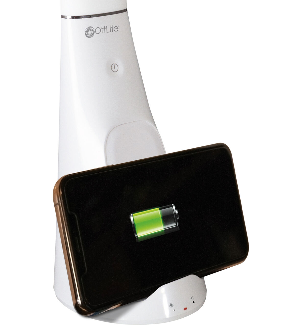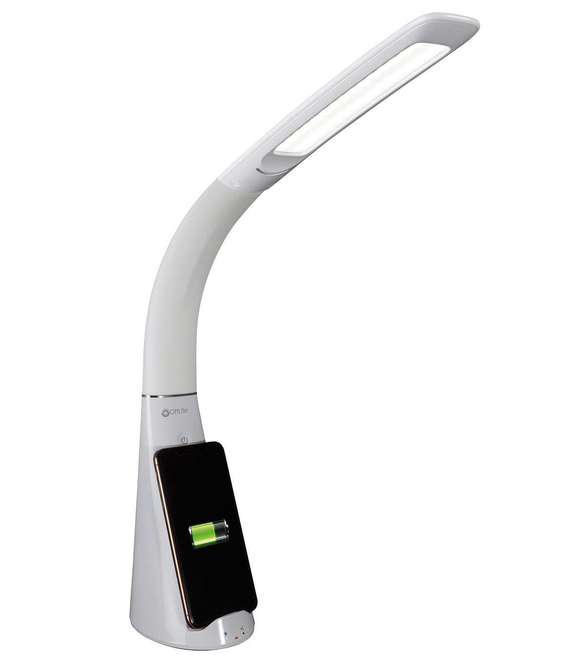 OttLite brings you the only desk lamps designed to break down harmful microorganisms. Now you can have proven sanitizing power right at your desktop with SpectraClean visible light disinfection. Using a precise formulation, SpectraClean's patented technology has been shown to kill potentially harmful bacteria like those prevalent on mobile phones and desktops. Create a healthier workspace every time you turn on your light! The OttLite Purify LED Sanitizing Desk Lamp with Wireless Charging also features the eyestrain-reducing power of ClearSun LED technology, shown to reduce eyestrain by up to 51%. This exclusive low glare, high contrast illumination is as close to natural daylight as you can get and has a superior color rendering index of 95+. Customize your lighting experience with three brightness settings and choice of modes including ClearSun Only, ClearSun + SpectraClean, and SpectraClean Only. Plus, keep your phone sanitized and charged with the Qi-wireless charging stand. Phones can be charged horizontally or vertically allowing you to answer texts, watch videos and more. 5V, 2.1A USB charging port also included for quickly charging mobile phones, tablets and other devices. Easily adjust height with the flexible neck from 14 to 26 inches.