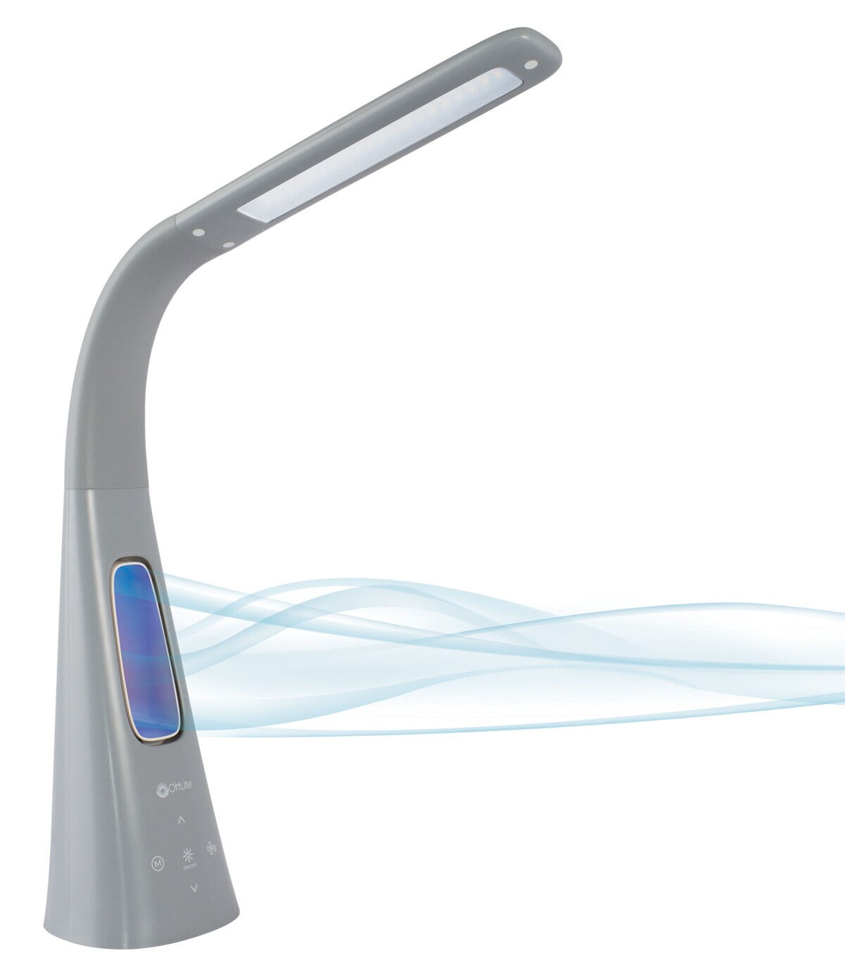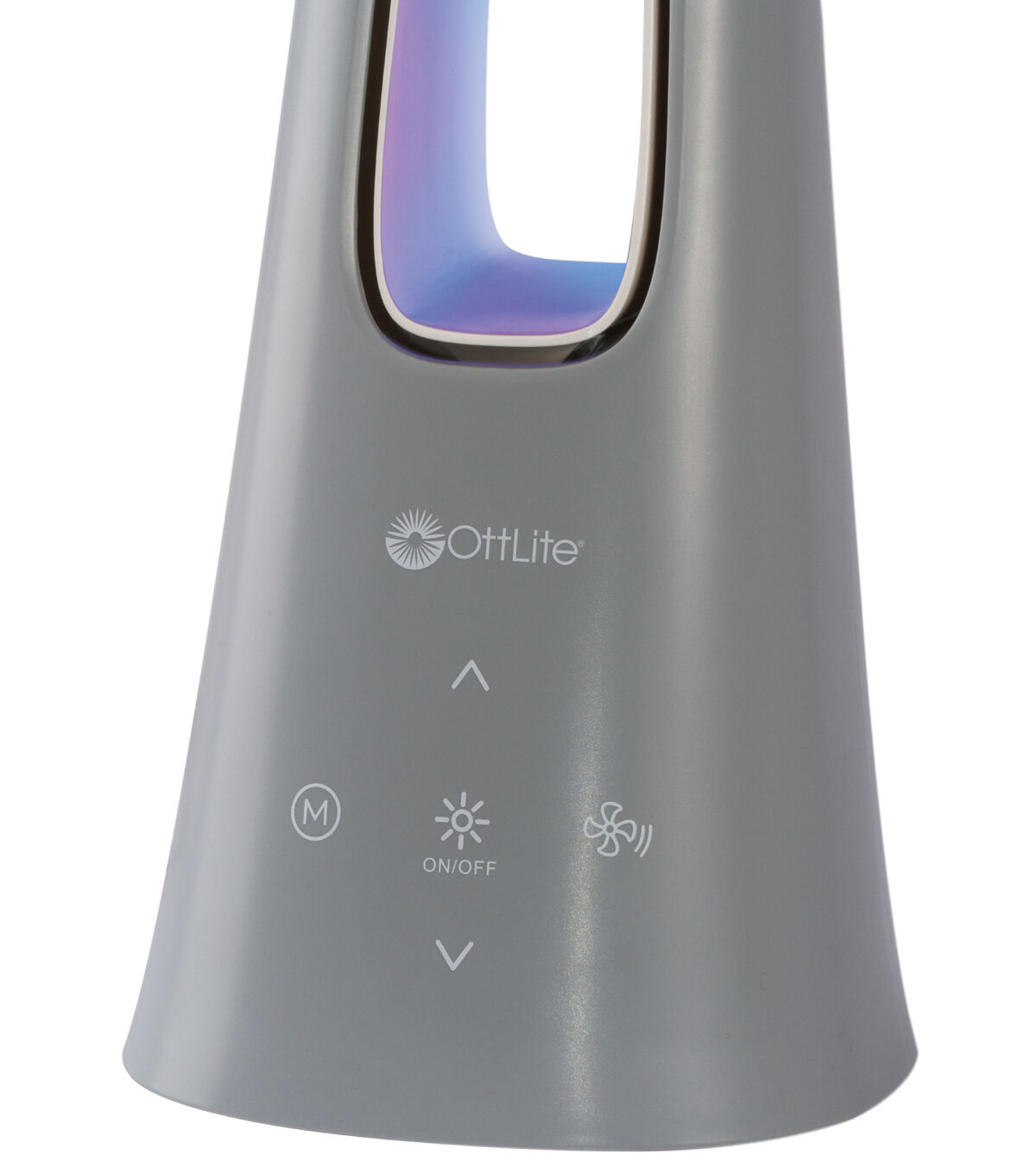 The OttLite Cool Breeze LED Fan Lamp-White gives you super bright daylight LED illumination and air circulation right at your fingertips with a fan that's integrated right into the base. There are three color modes (warm light, cool light and natural daylight) and five brightness settings to brighten your work area. A rubberized flexible neck allows you to position light exactly where it's needed. The three-speed bladeless fan features a cool illumination effect. Its touch activated panel controls selection of the light mode, brightness settings and fan speed. With its sleek innovative design, this lamp is perfect for craft rooms, offices, dorm rooms, countertops or anywhere you need better lighting. It lets you see every color accurately and detail clearly with reduced glare and eyestrain so you can do what you love, longer. You can adjust its height from 15 to 26.5 inches. The super bright natural daylight LEDs have been rated to last up to 40,000 hours.