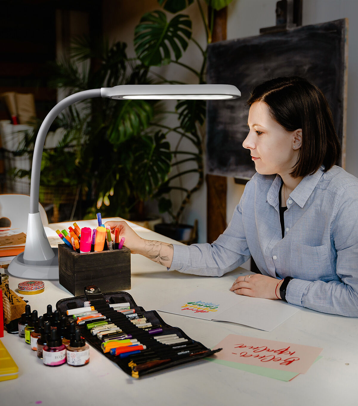 Perfect for large workspaces and big projects, the OttLiteLite Wide Area Dimmable LED Table Lamp delivers expansive ClearSun LED illumination that shows colors true to life and helps reduce eyestrain for hours of visual comfort. The wide shade measures 12 x 4 inches with three brightness levels to deliver just the right amount of OttLiteLite’s ClearSun illumination for your space. Use at full height of 27 inches to cover a large area; or bend the flexible neck down to 12 inches for focused, concentrated light, great for tracing, jewelry making and detail work. OttLiteLite allows you to see details clearly and colors accurately, helping you do what you love, longer.
