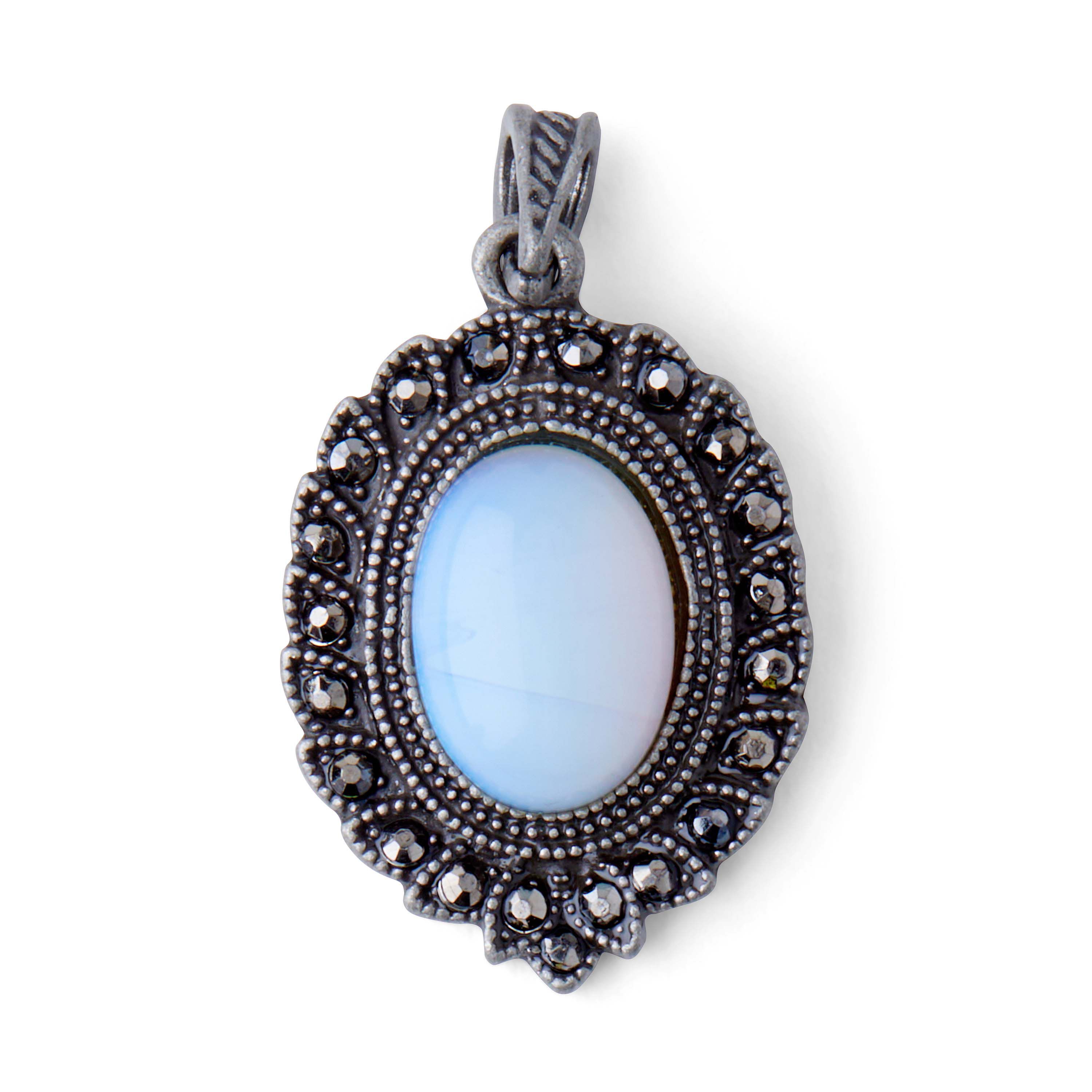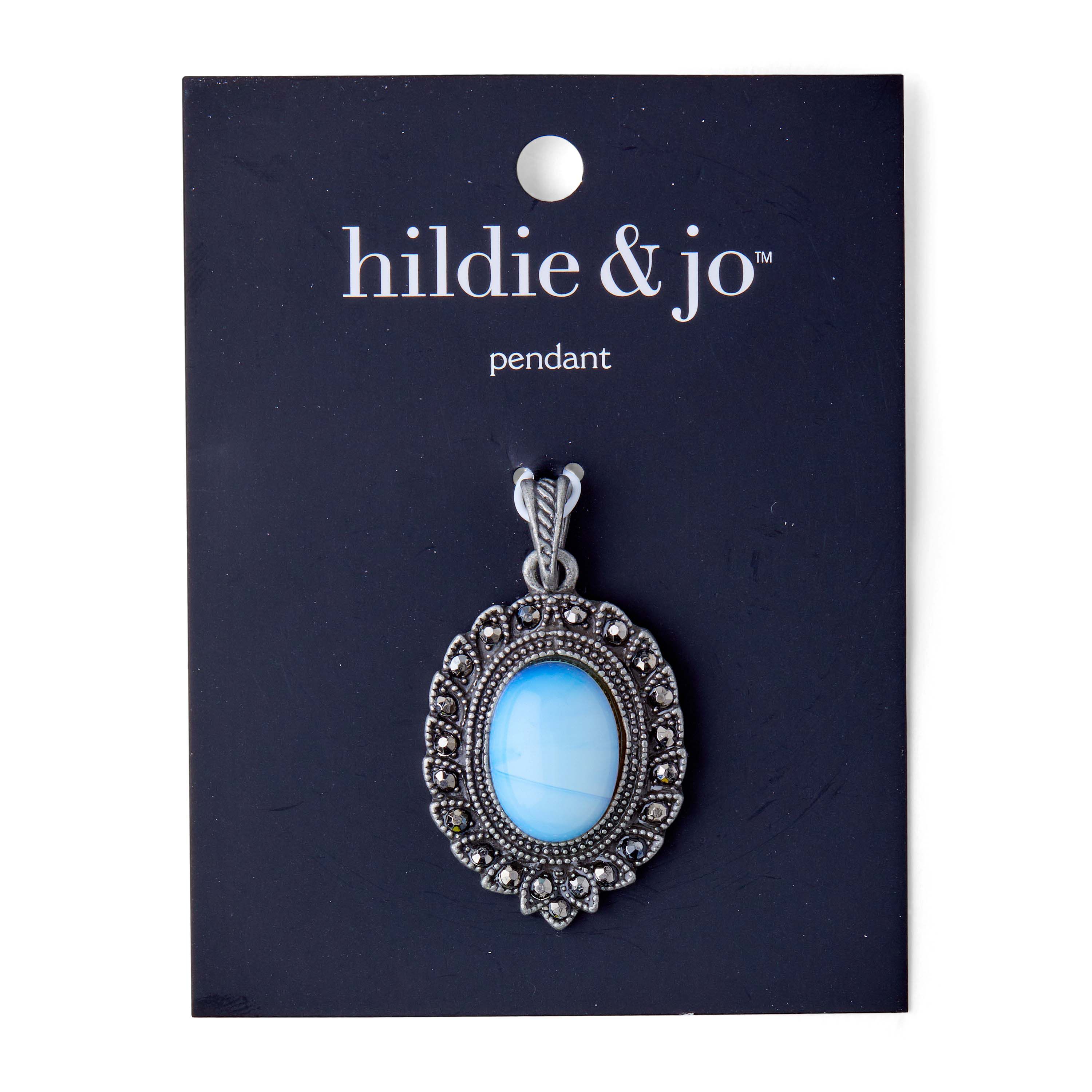 Design a special piece of jewelry for yourself or for a loved one, using the hildie & jo Ornamental Oval Metal Pendant. This oval pendant has a rustic look, with rhinestones outlining the edges, and a big oval stone in the center. Hang it from a thin chain to create a lovely necklace.