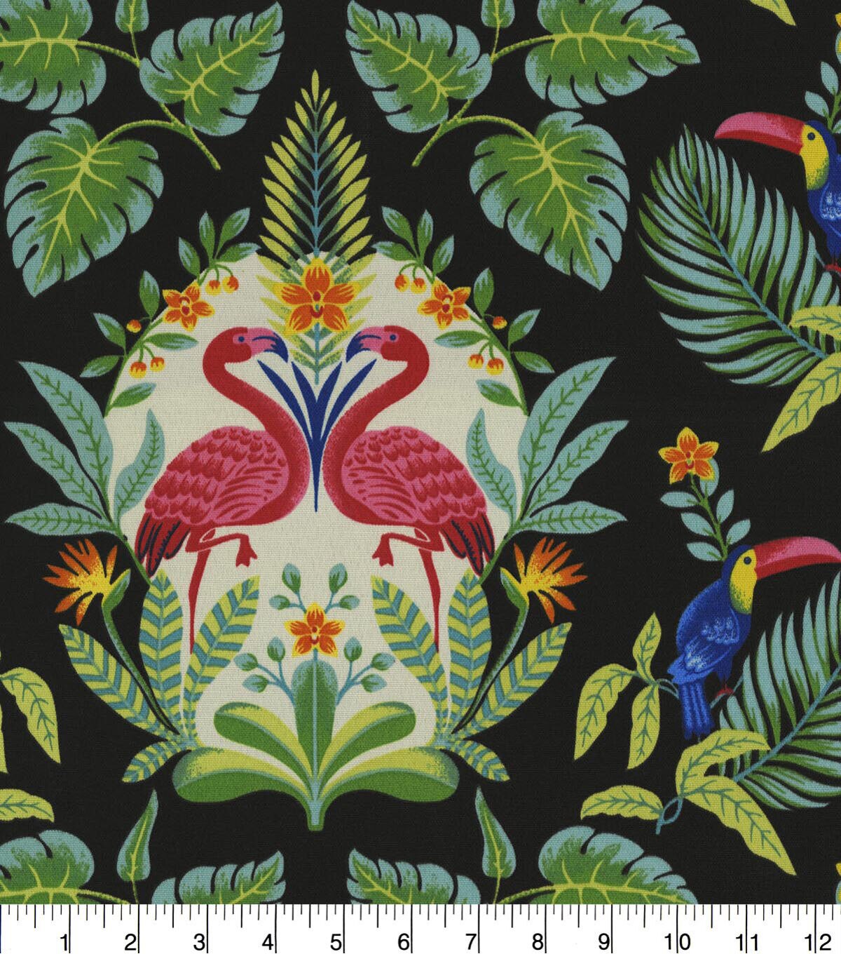 Two flamingos share a tender moment surrounded by a meticulous orbit of Neotropical flora and fauna. Nosy toucans horn in from their perch atop breezy palm leaves.