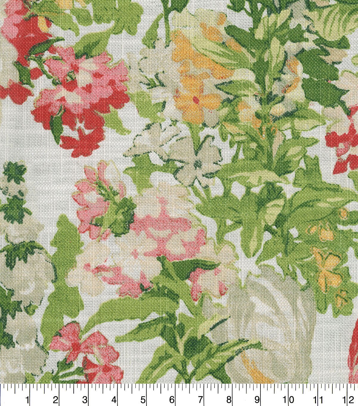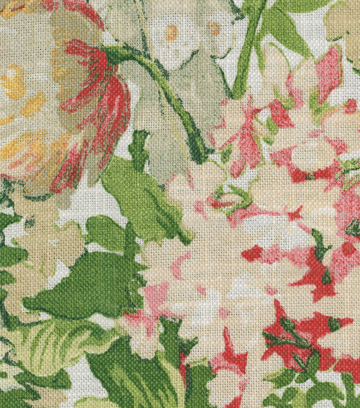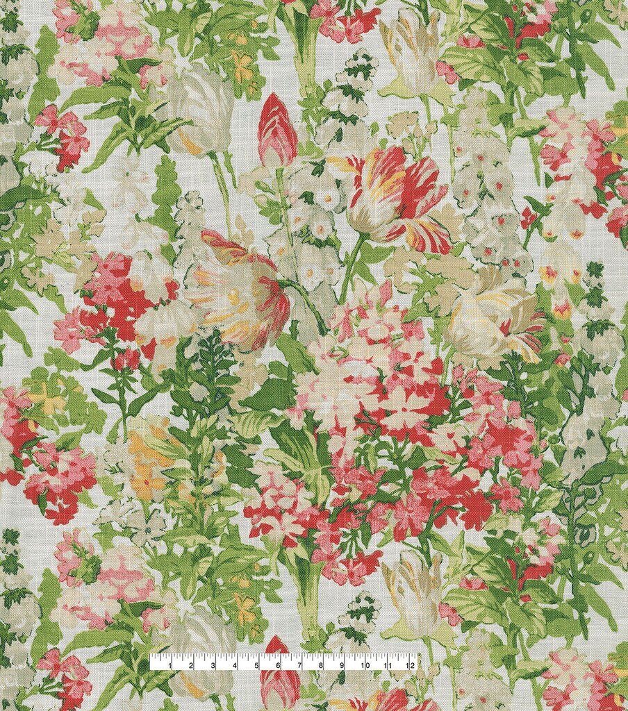 Summer Ready Garden from the P K Lifestyles Happy Nest II Collection is a printed floral design on a cotton and linen print cloth. This crisply colored fabric contains the colors Rose, Azalea Red, Fern, and accents of Sand and Yellow Gold against a White background. The repeat of this fabric design is 25.25 inches vertically by 27 inches horizontally. Summer Ready can be used for draperies, curtains, cornice boards, pillows, cushions, bedding and furniture upholstery.
