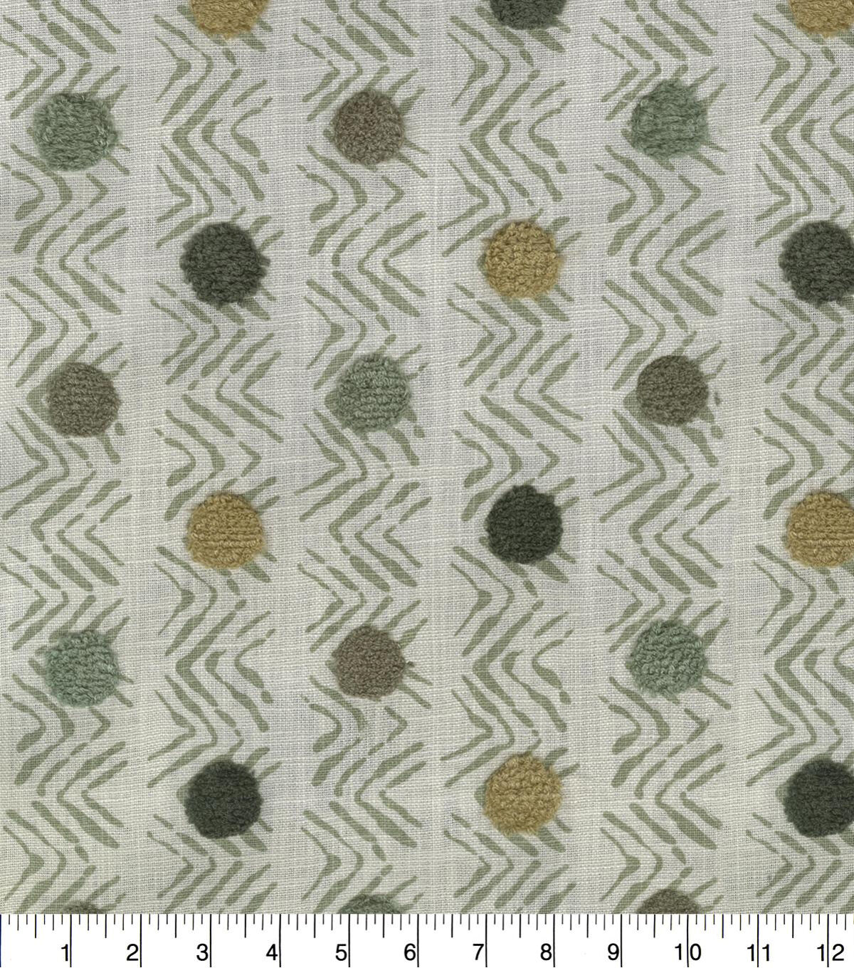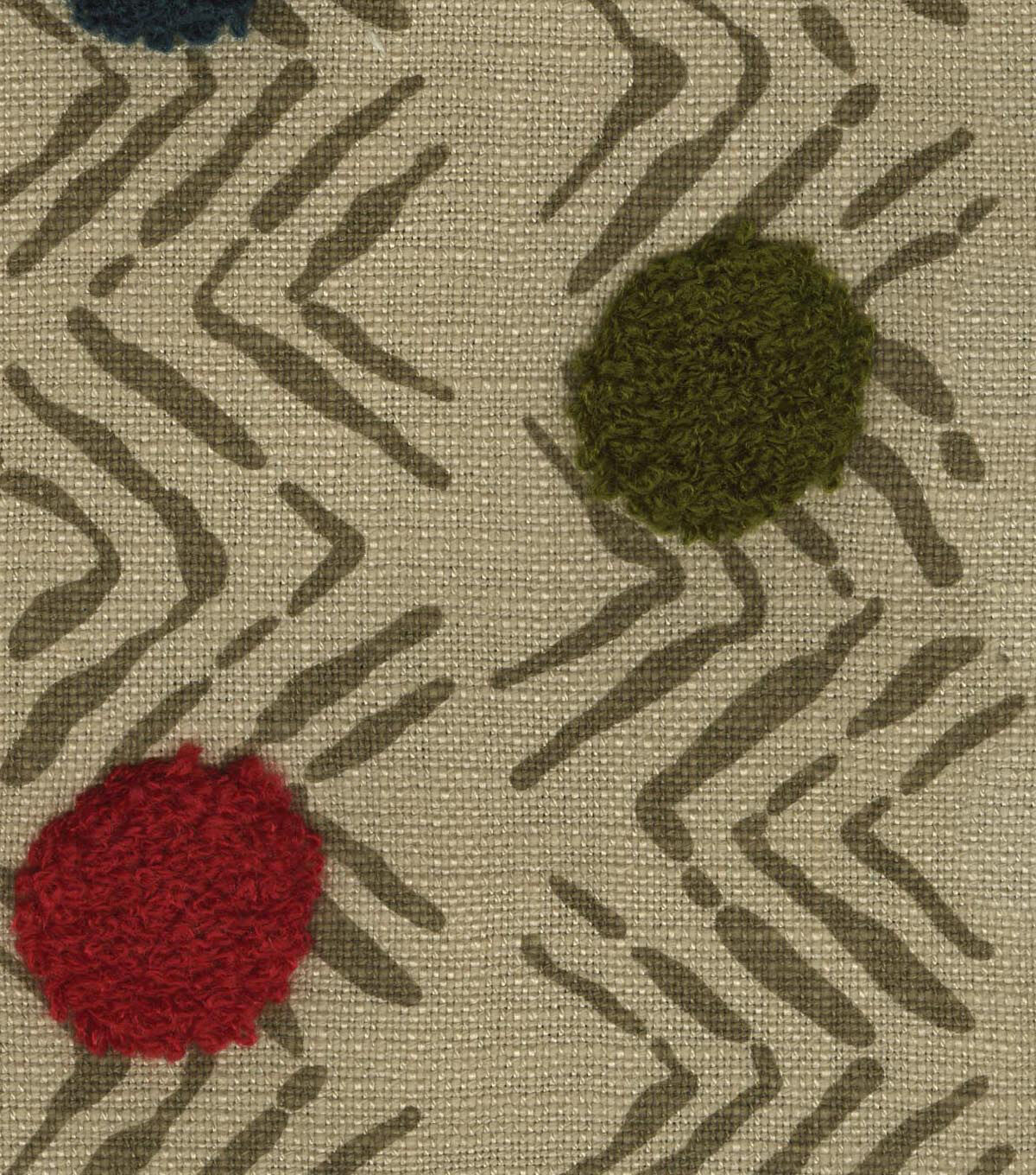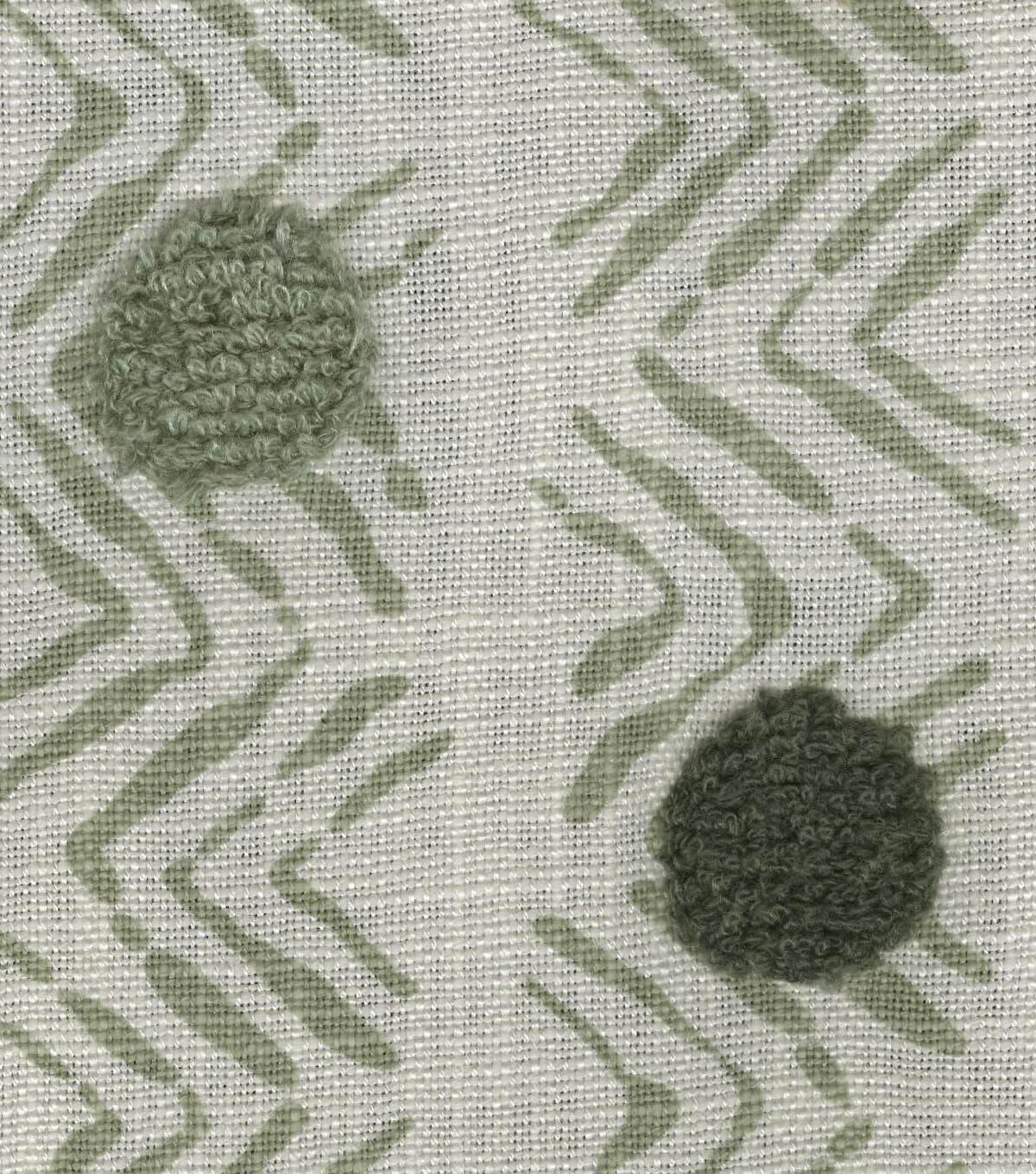 P/K Lifestyles Moon Beat is a rippled chevron pattern adorned with multi-colored dots. A complex textile, each dot is embrodiered with loop-stitching to add texture and surface interest.