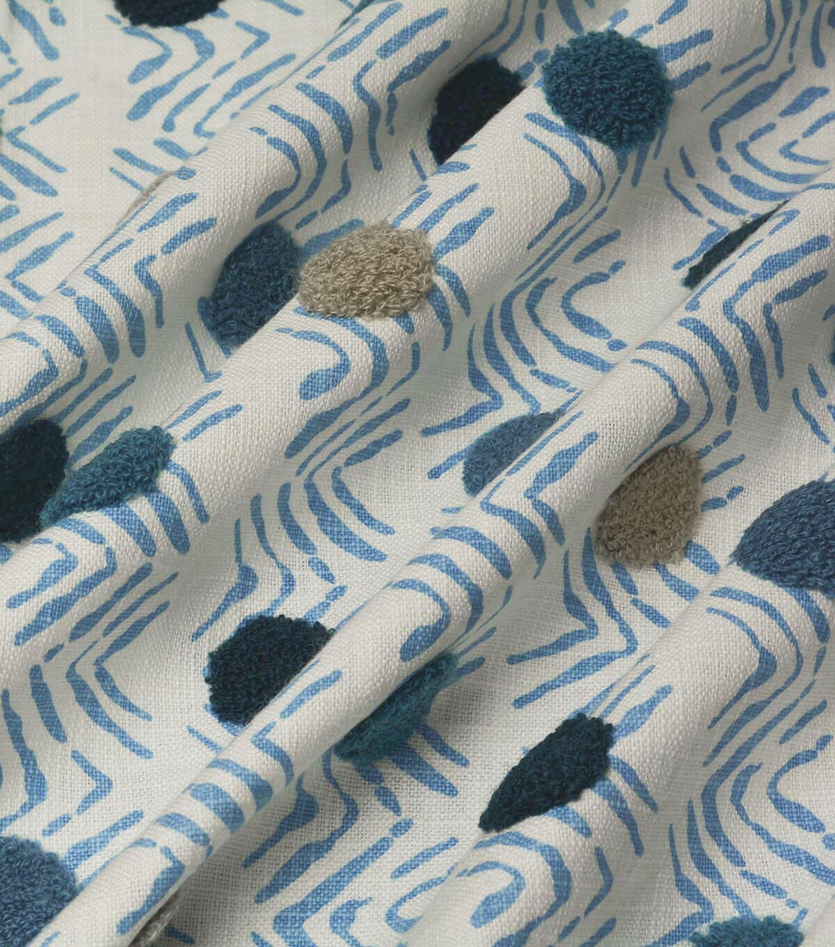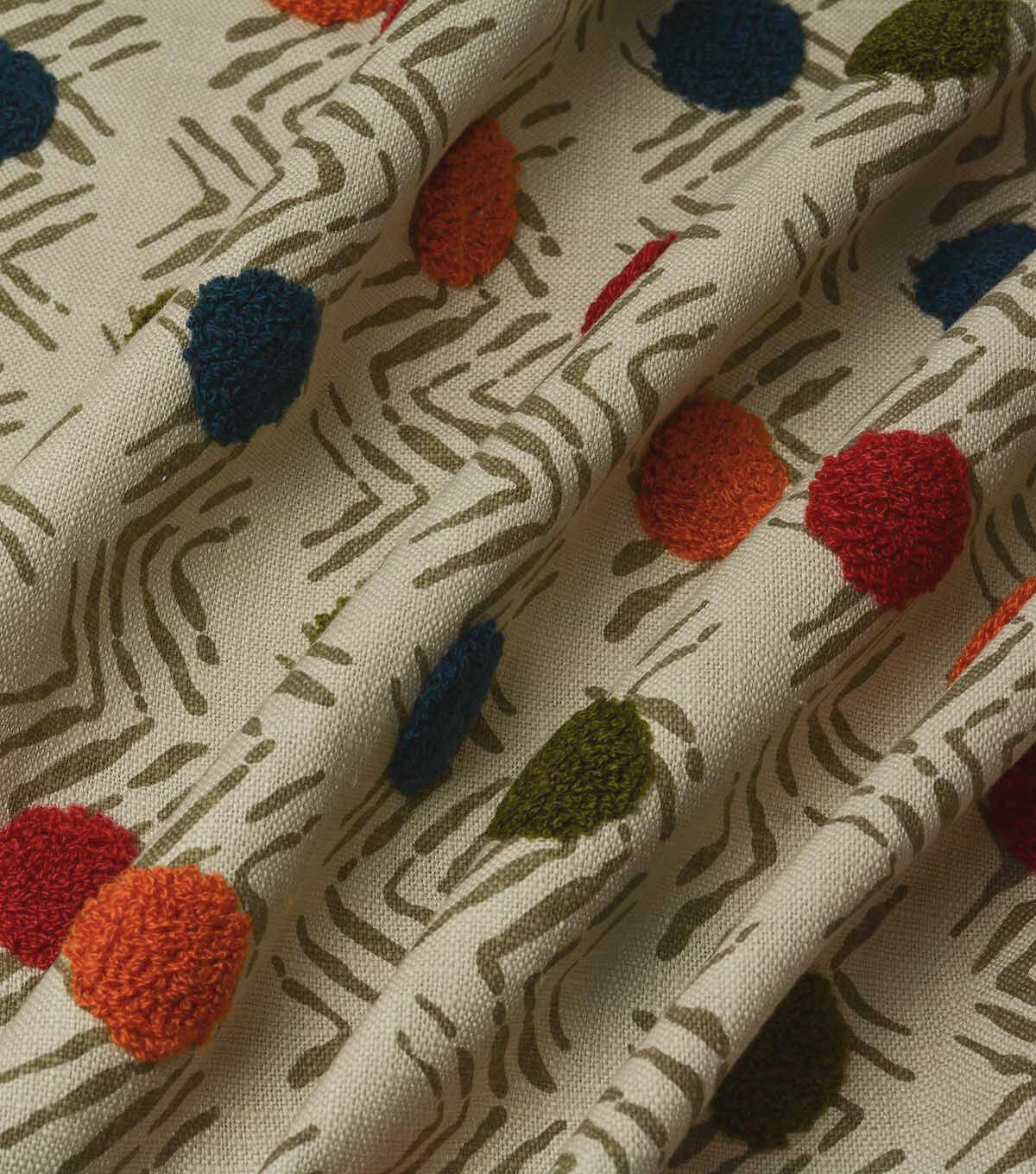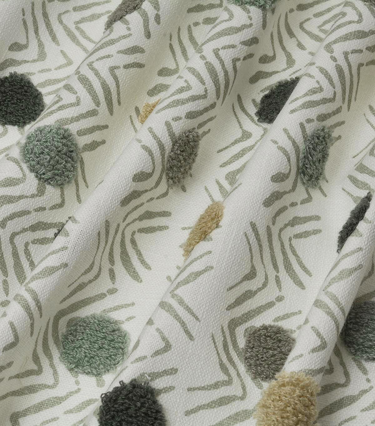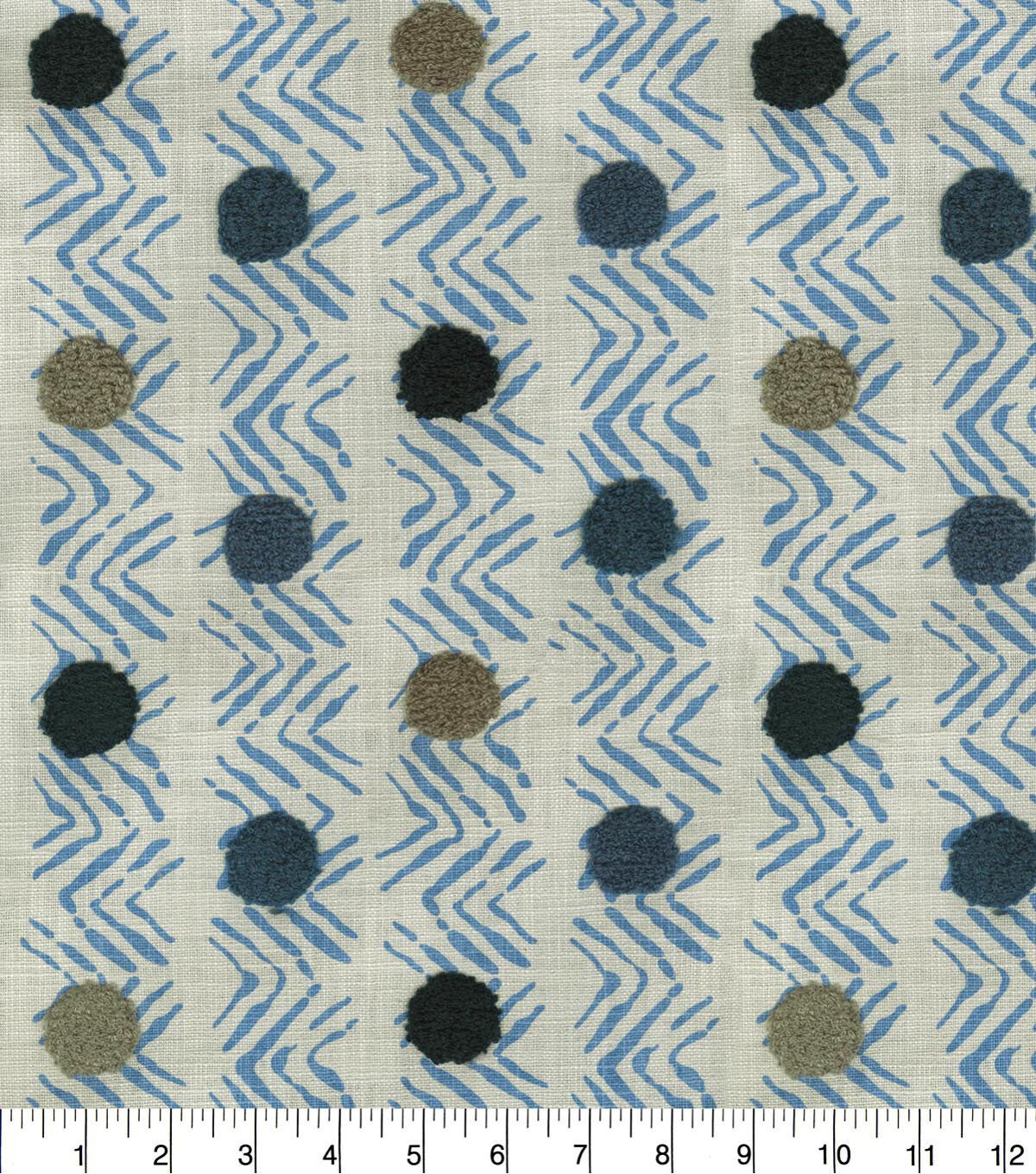 P/K Lifestyles Moon Beat is a rippled chevron pattern adorned with multi-colored dots. A complex textile, each dot is embrodiered with loop-stitching to add texture and surface interest.