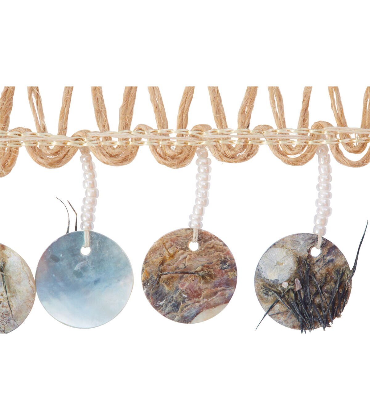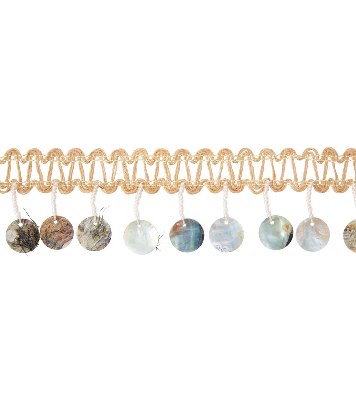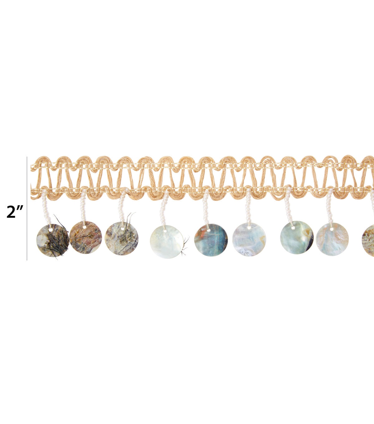 This 2 inch jute trim with flat beaded iridescent fringe is a jute/polyester blend. This trim is perfect to glam up any rustic design.
