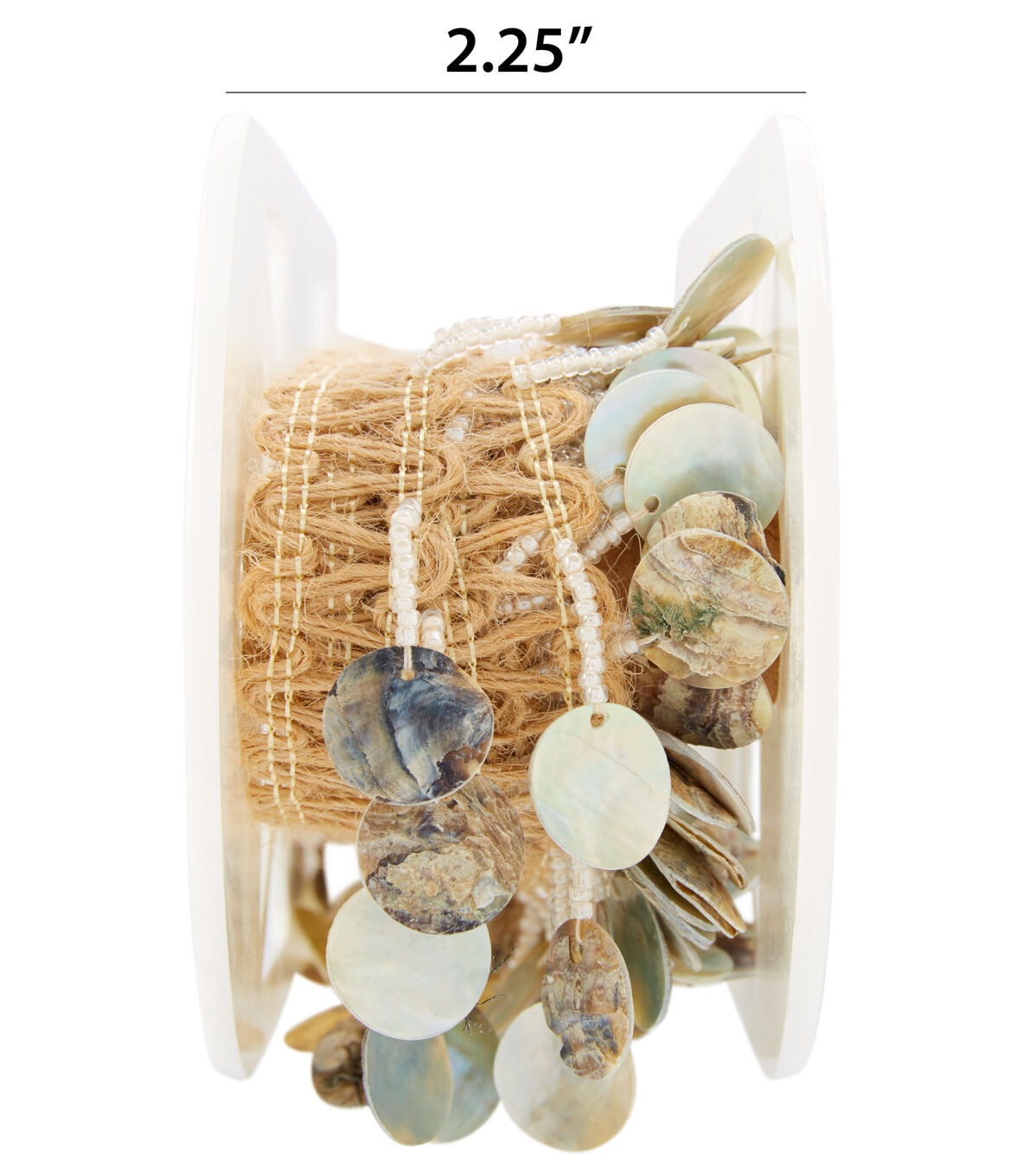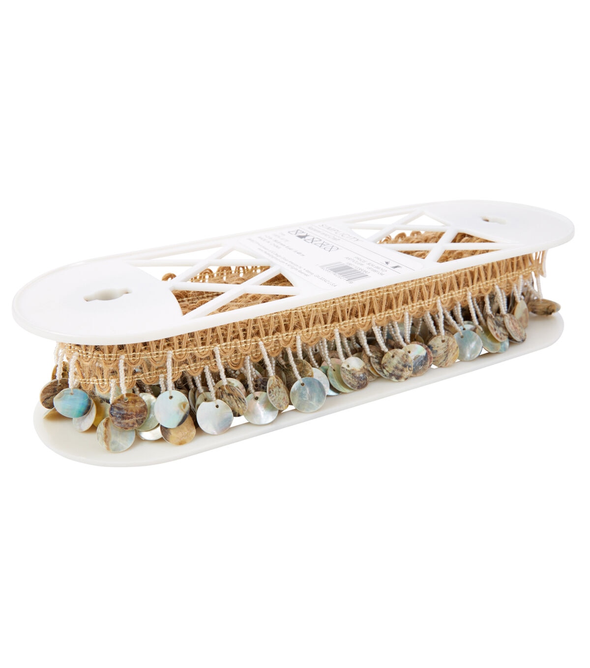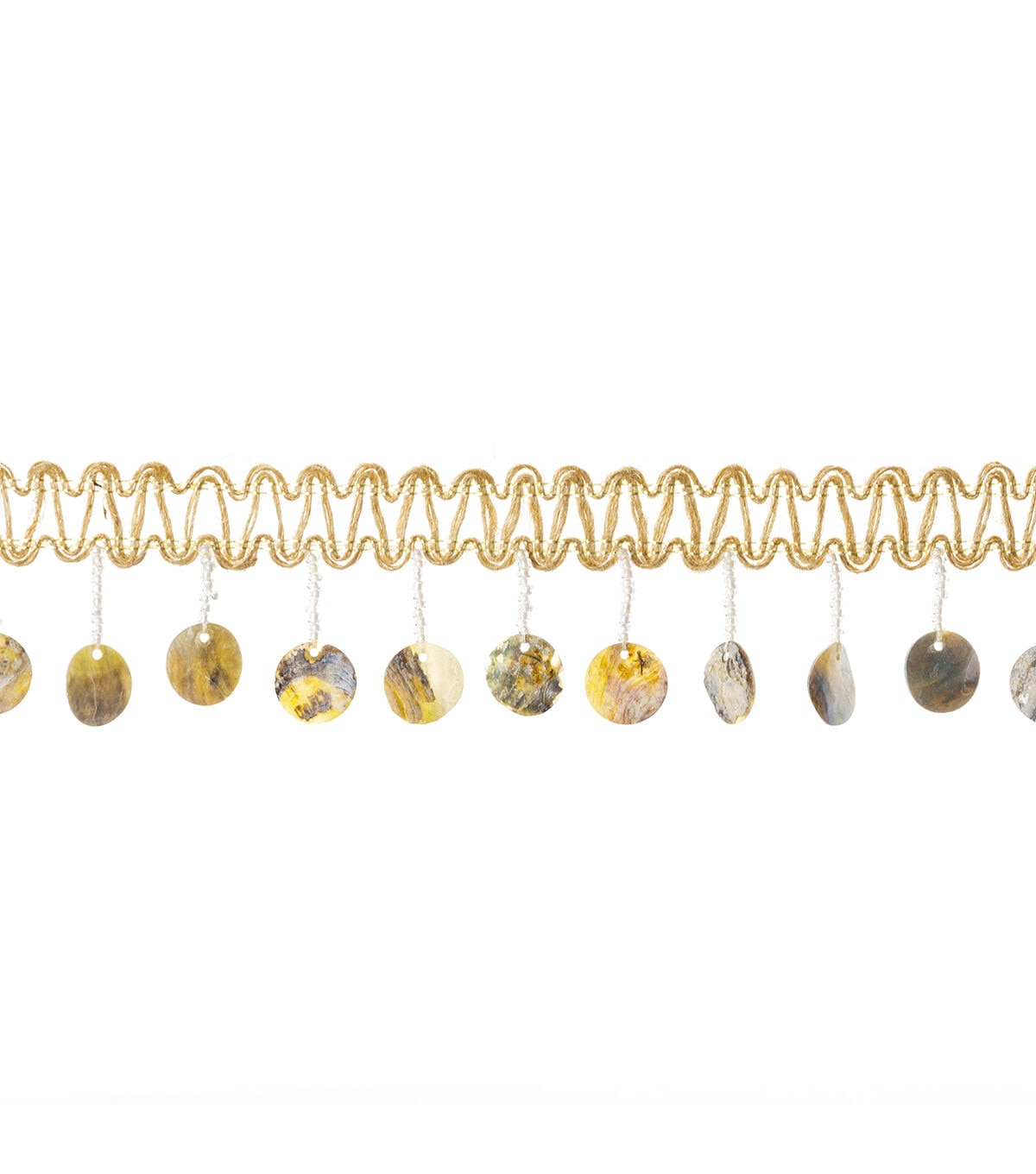 This 2 inch jute trim with flat beaded iridescent fringe is a jute/polyester blend. This trim is perfect to glam up any rustic design.