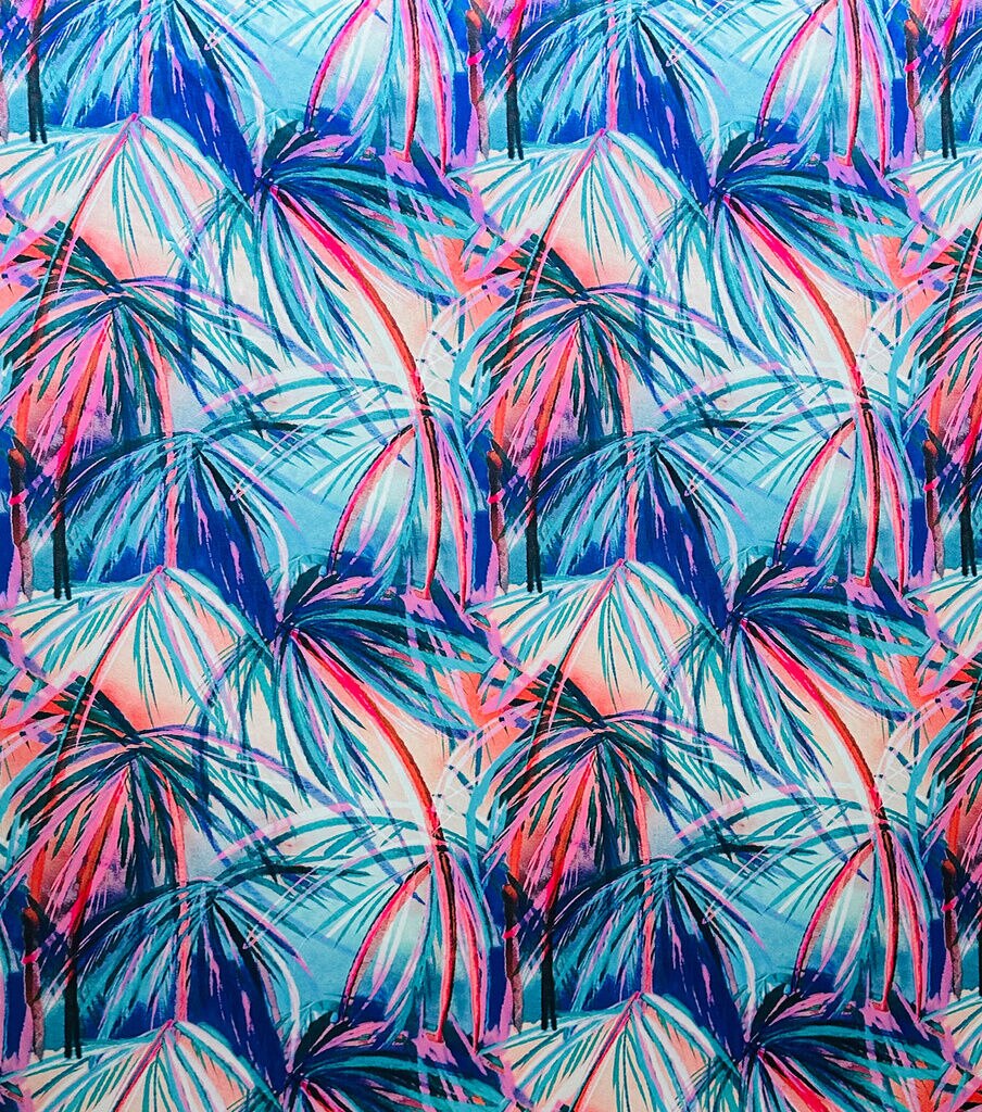 Transform Your Space with Our Palm Trees on Blue Silky Charmeuse Fabric